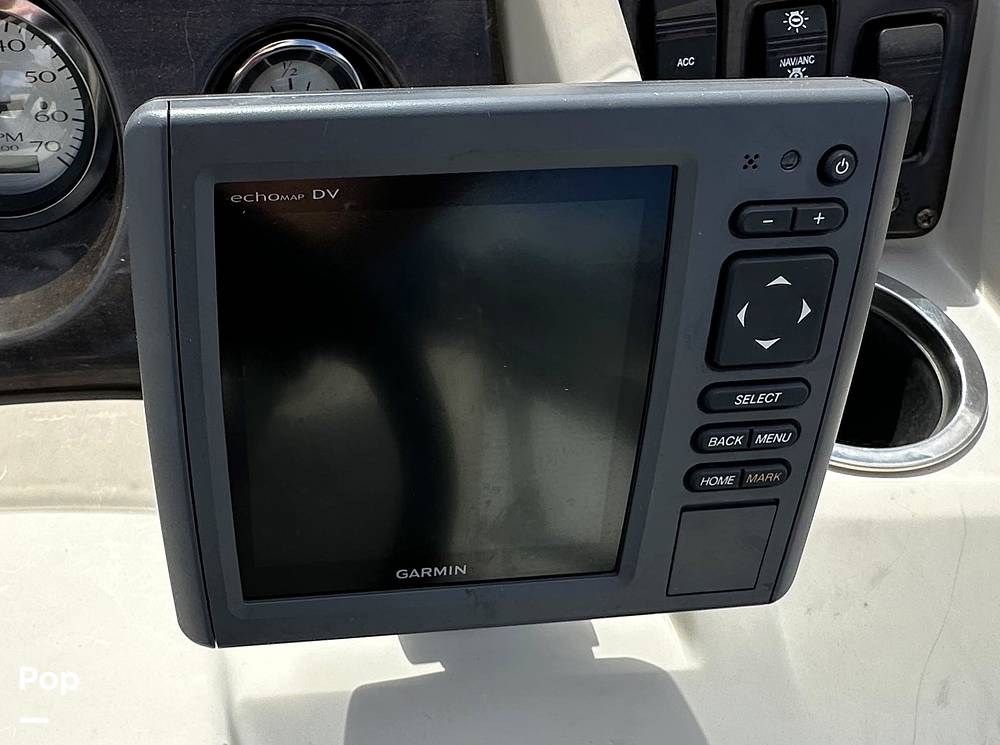 Fishing features include a stern-mounted live-well, a forward baitwell, 4 fold-down, removable pedestal fishing seats, and a rear-mounted power pole. Also, a Garmin Echomap DV chartplotter/fishfinder and a Standard Horizon VHF marine radio.