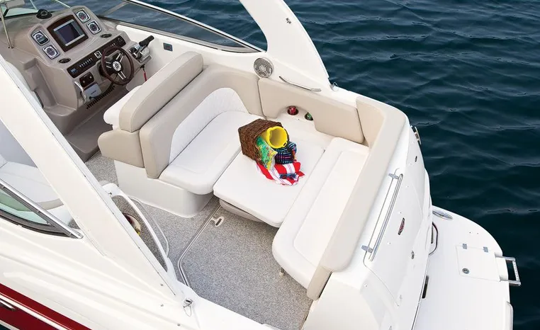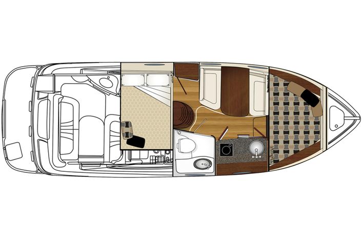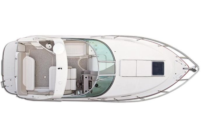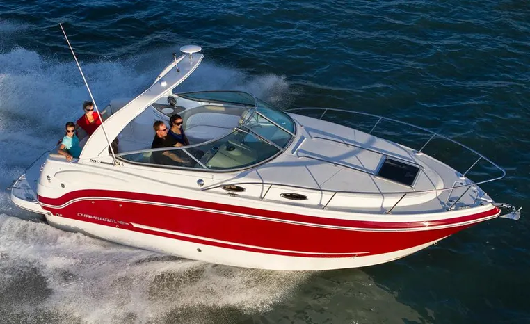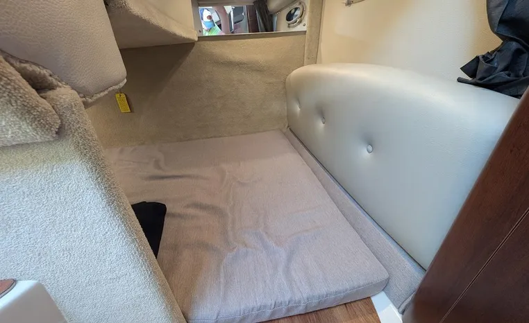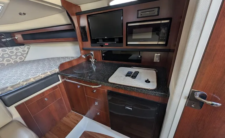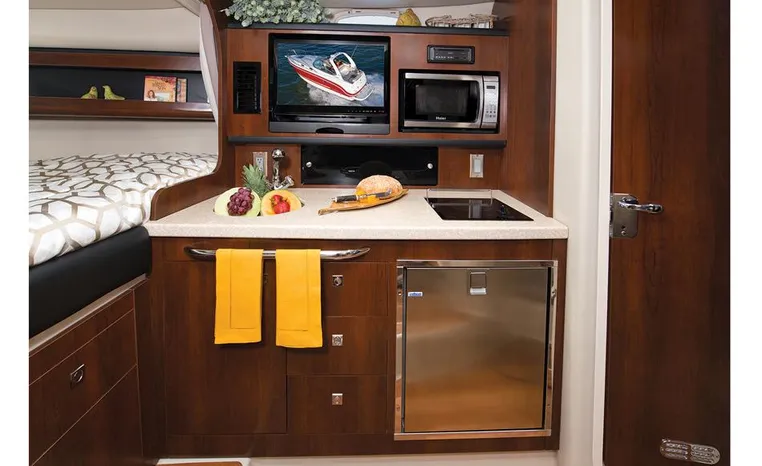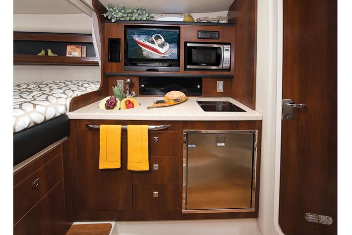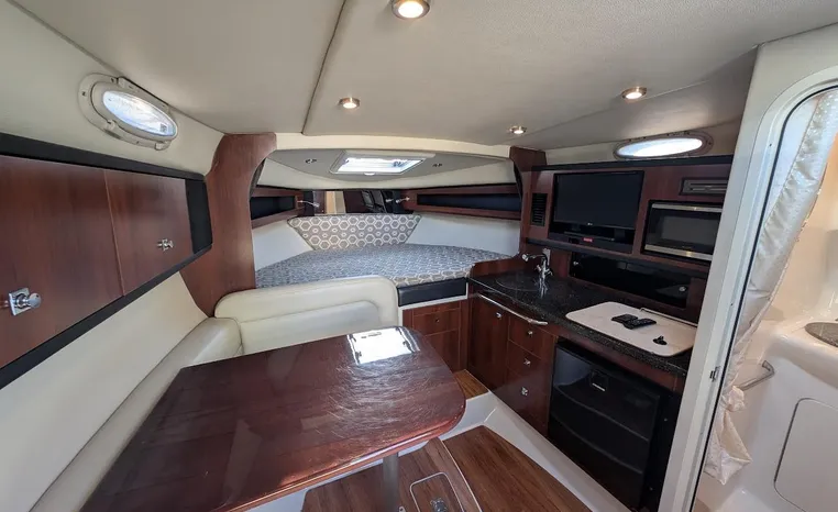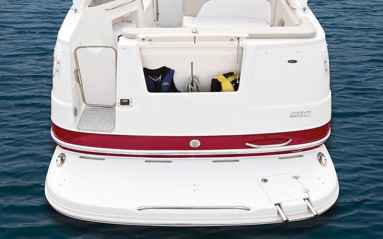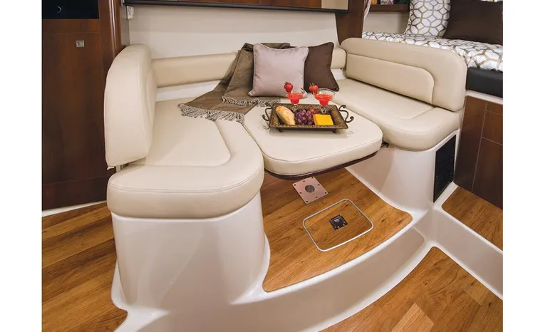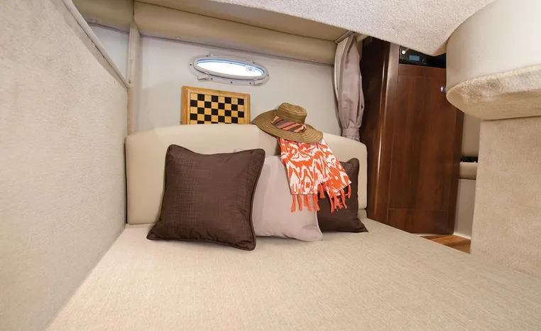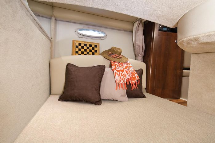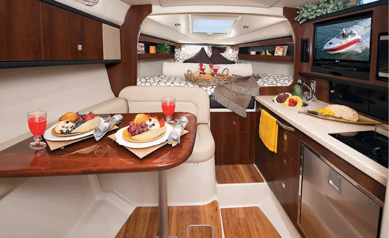 Most cruisers in this size range require you to wake up and disassemble the forward berth if you want to use the dinette for an early morning cup of coffee. Not so on this Chaparral 290 thanks to a huge berth and a separate dinette.The cabin sleeps six comfortably which is remarkable given the boat's under-30-foot centerline length. An oversized square deck hatch with a retractable shade and screen, along with four eye-level screened ports stir an airy, spacious feeling. two cedar lined clothes closets, flat screen entertainment packages and lined privacy drapes are all standard equipment extras that make the 290 one of the roomiest cruisers you'll find under 30-feet.
