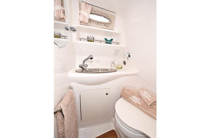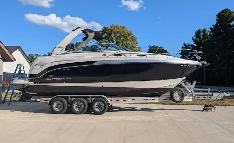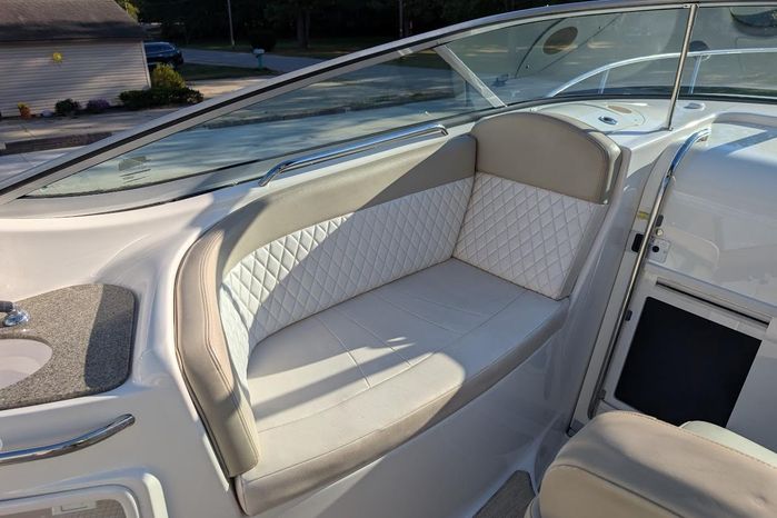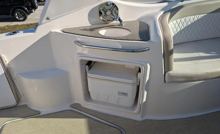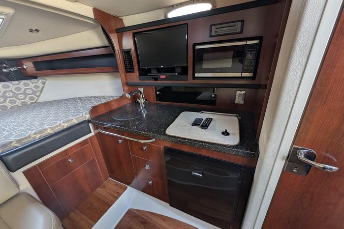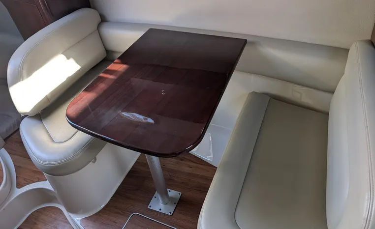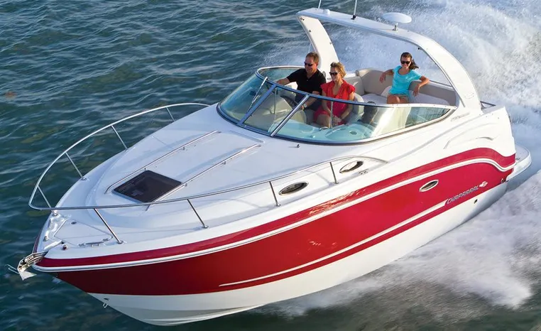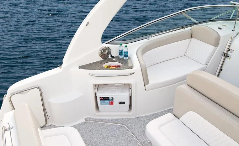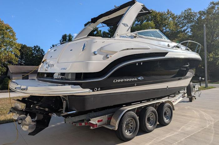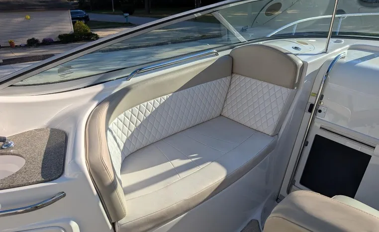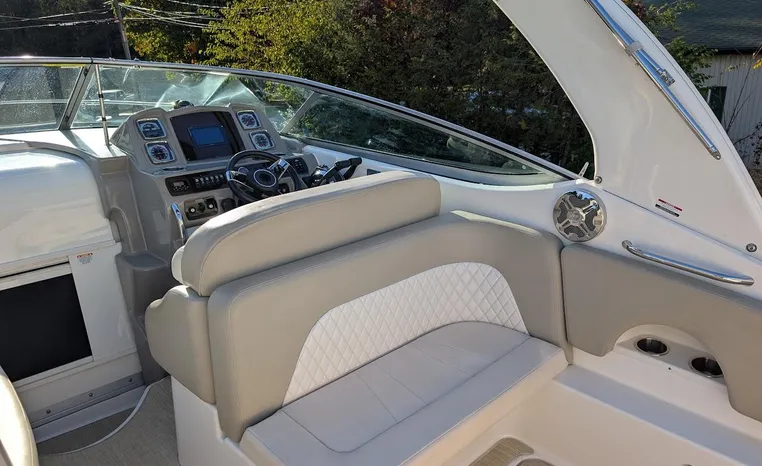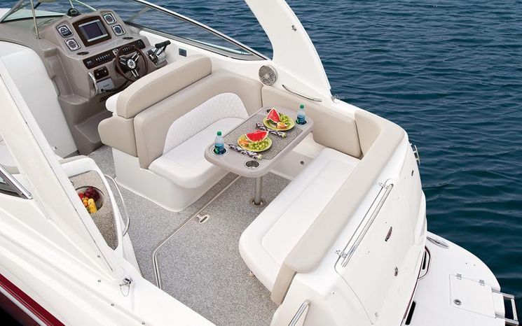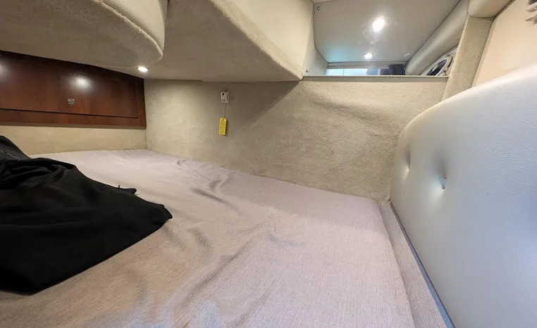 Most cruisers in this size range require you to wake up and disassemble the forward berth if you want to use the dinette for an early morning cup of coffee. Not so on this Chaparral 290 thanks to a huge berth and a separate dinette.The cabin sleeps six comfortably which is remarkable given the boat's under-30-foot centerline length. An oversized square deck hatch with a retractable shade and screen, along with four eye-level screened ports stir an airy, spacious feeling. two cedar lined clothes closets, flat screen entertainment packages and lined privacy drapes are all standard equipment extras that make the 290 one of the roomiest cruisers you'll find under 30-feet.
