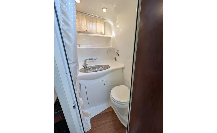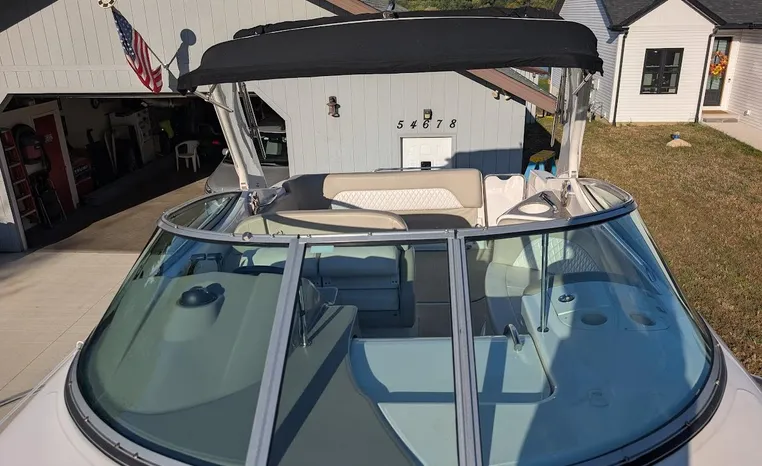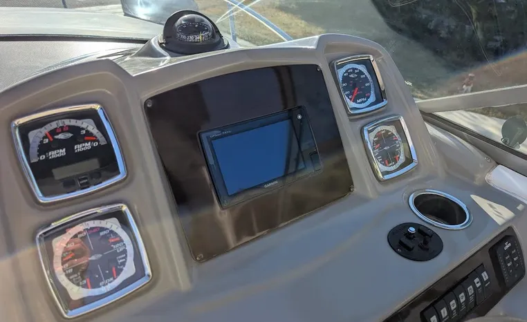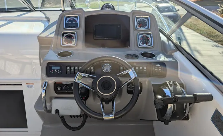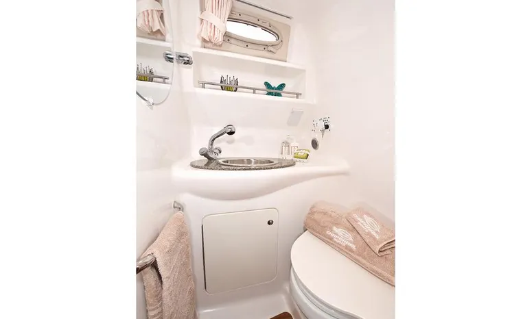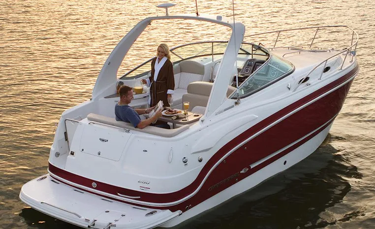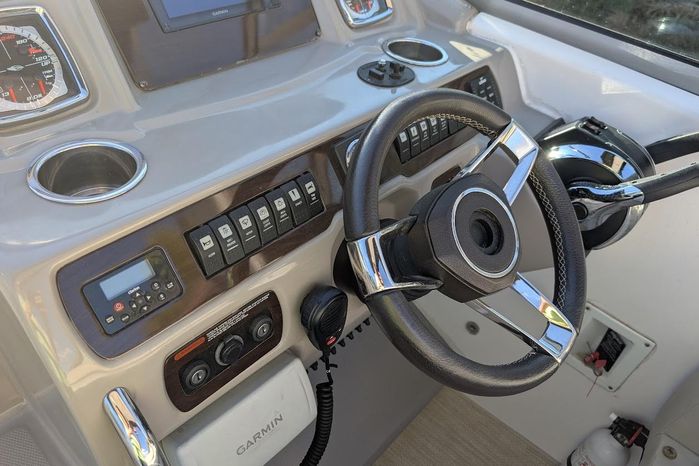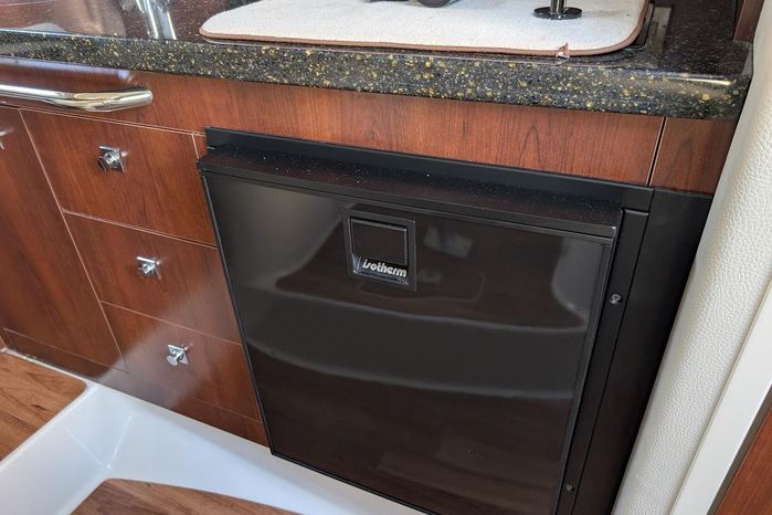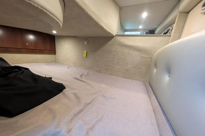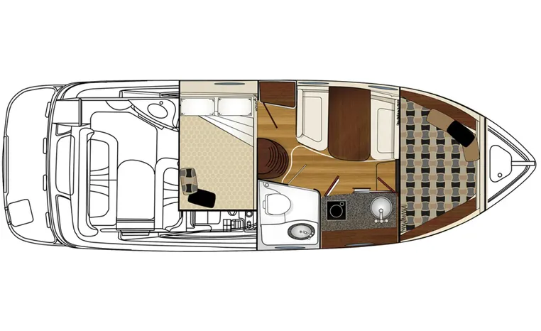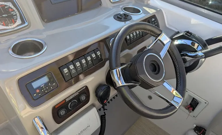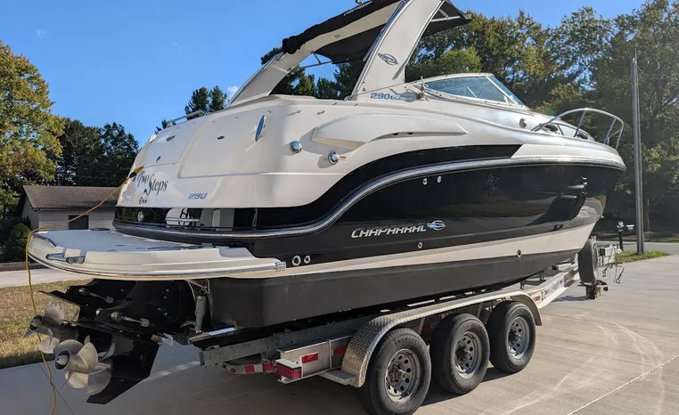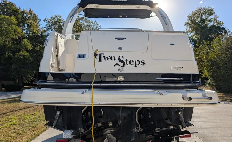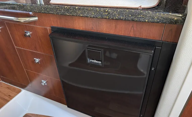 Most cruisers in this size range require you to wake up and disassemble the forward berth if you want to use the dinette for an early morning cup of coffee. Not so on this Chaparral 290 thanks to a huge berth and a separate dinette.The cabin sleeps six comfortably which is remarkable given the boat's under-30-foot centerline length. An oversized square deck hatch with a retractable shade and screen, along with four eye-level screened ports stir an airy, spacious feeling. two cedar lined clothes closets, flat screen entertainment packages and lined privacy drapes are all standard equipment extras that make the 290 one of the roomiest cruisers you'll find under 30-feet.
