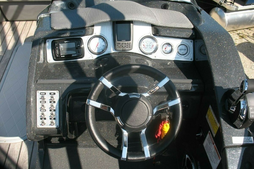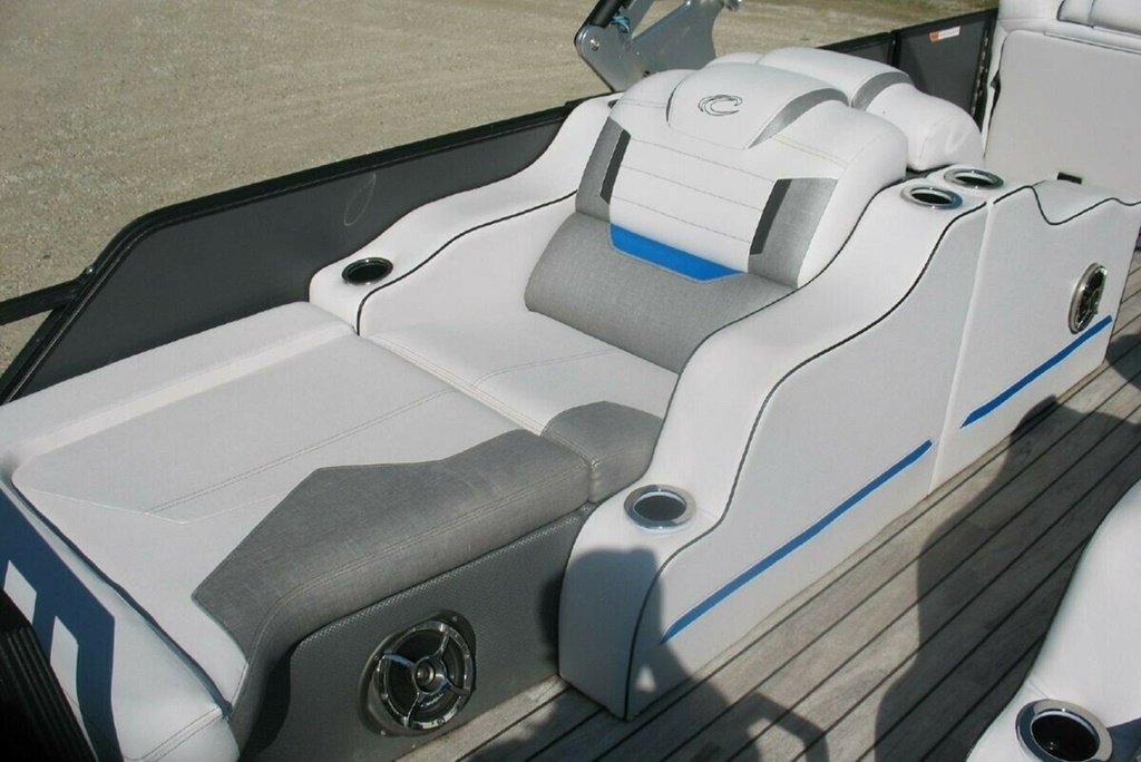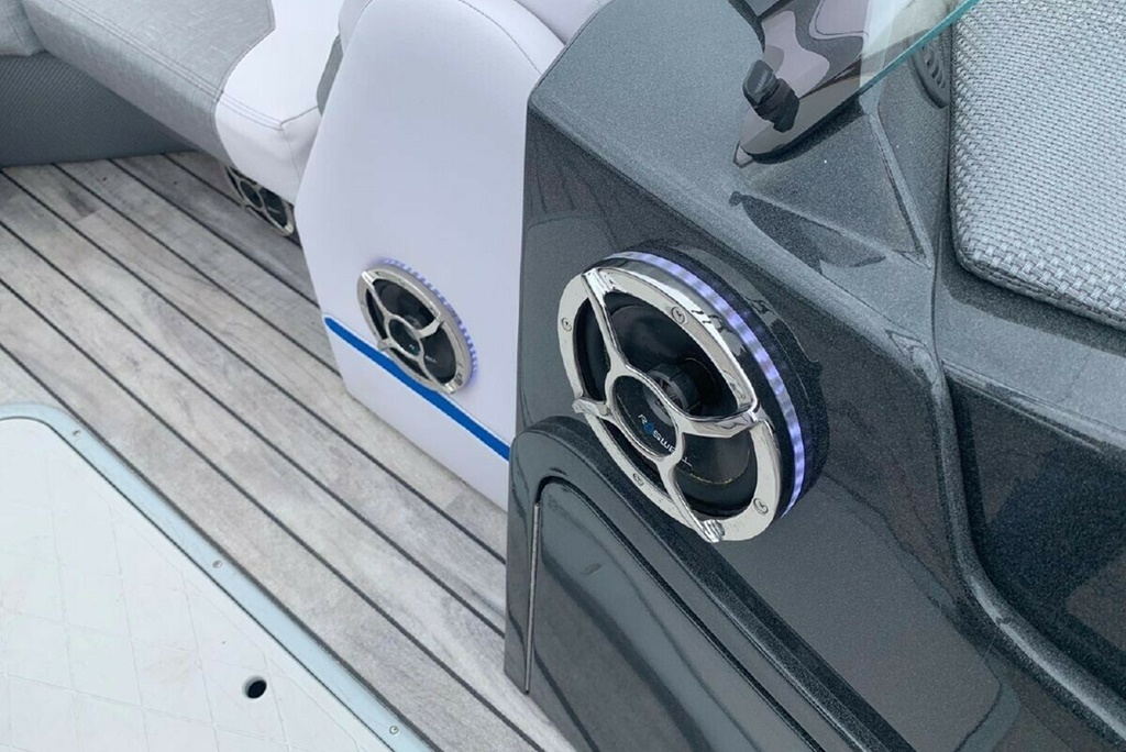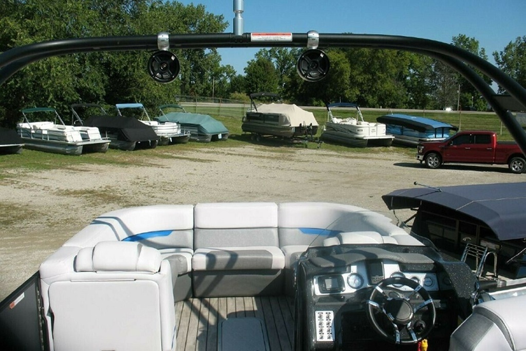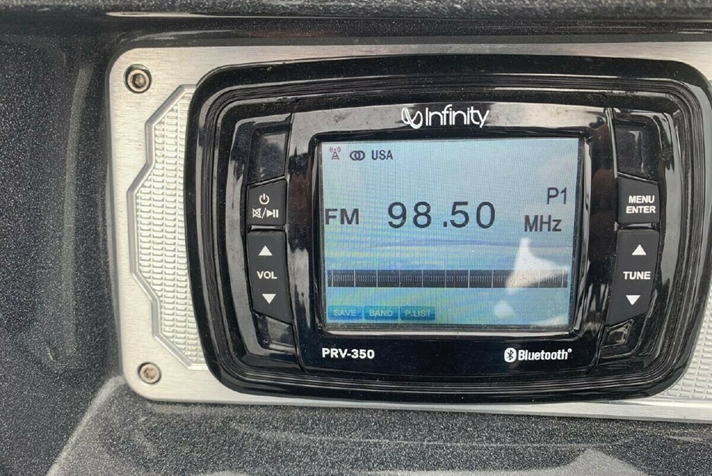This boat features a wakeboard tower, Roswell tower speakers, a 12" Roswell subwoofer, and 8 Roswell 6.5" interior speakers, all powered by a Roswell amplifier. Additional upgrades include a billet aluminum dash panel, Garmin DV43 GPS fish finder, and a ski locker.