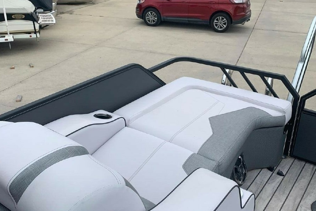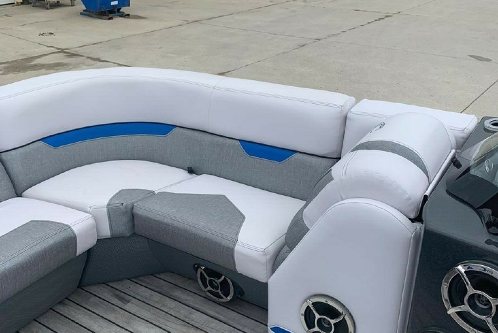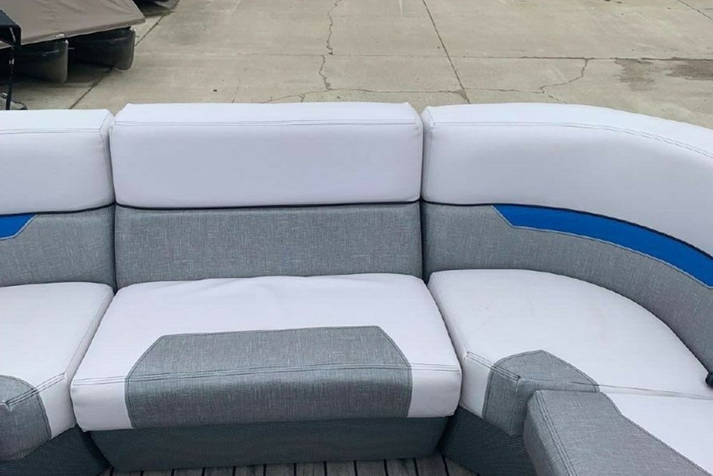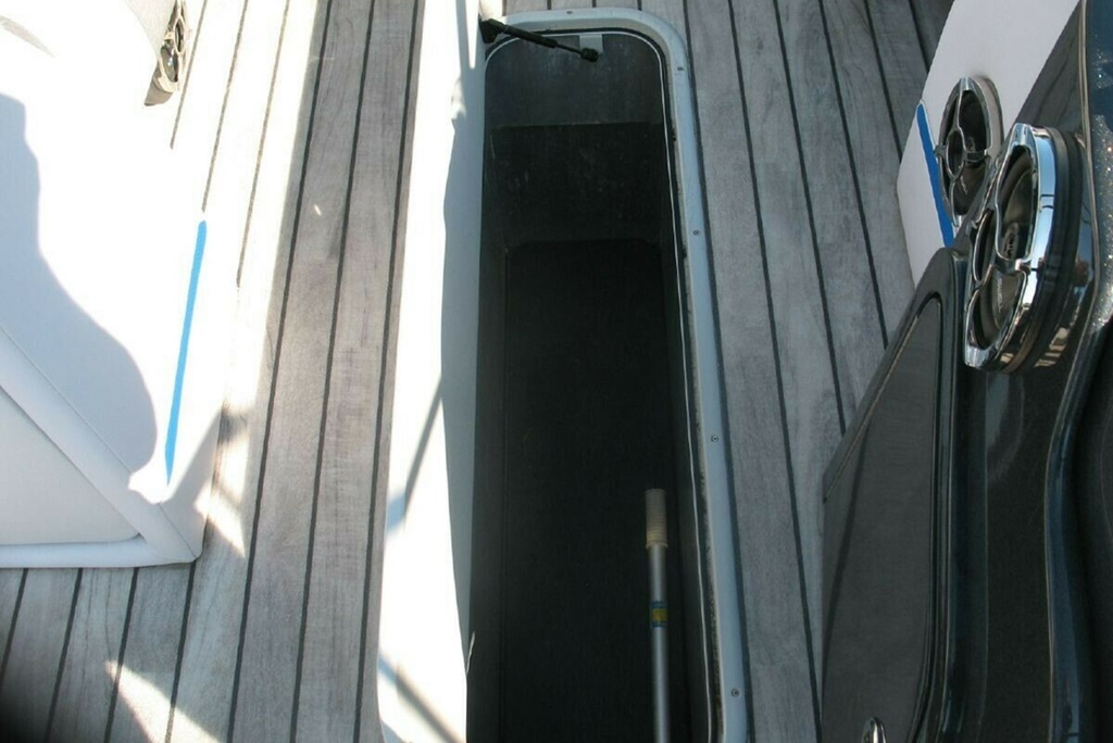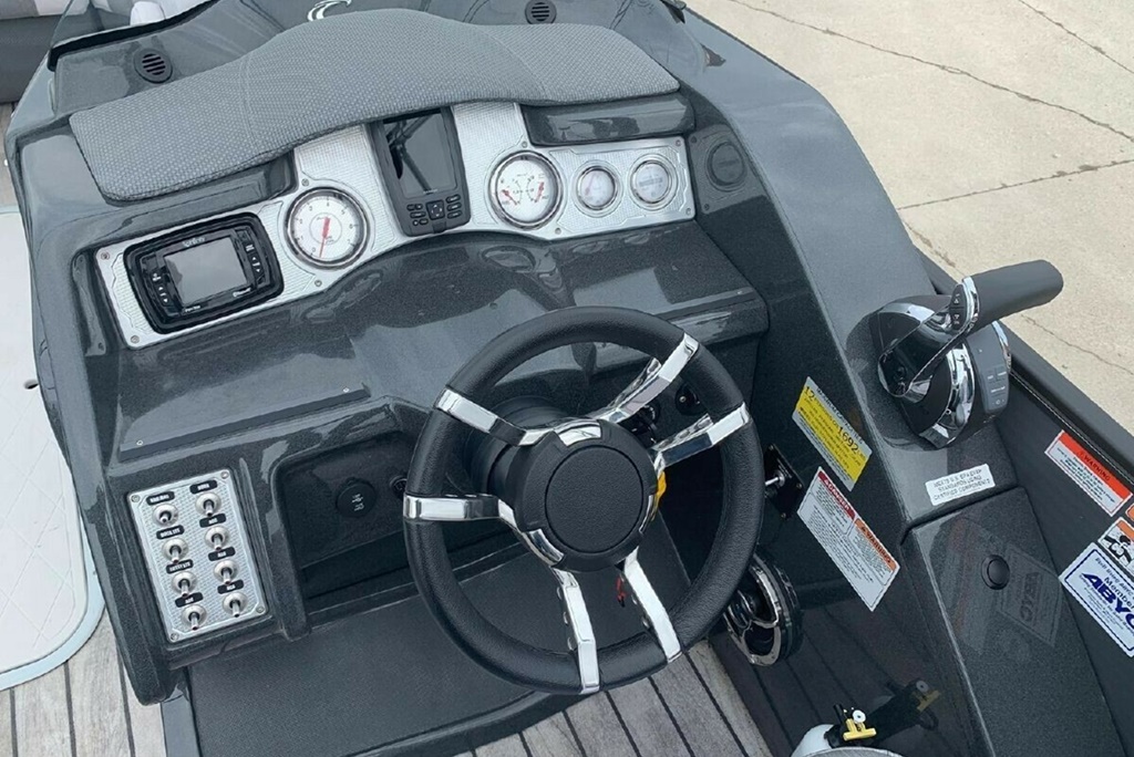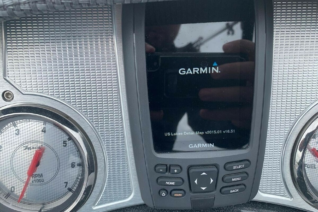 This boat features a wakeboard tower, Roswell tower speakers, a 12" Roswell subwoofer, and 8 Roswell 6.5" interior speakers, all powered by a Roswell amplifier. Additional upgrades include a billet aluminum dash panel, Garmin DV43 GPS fish finder, and a ski locker.