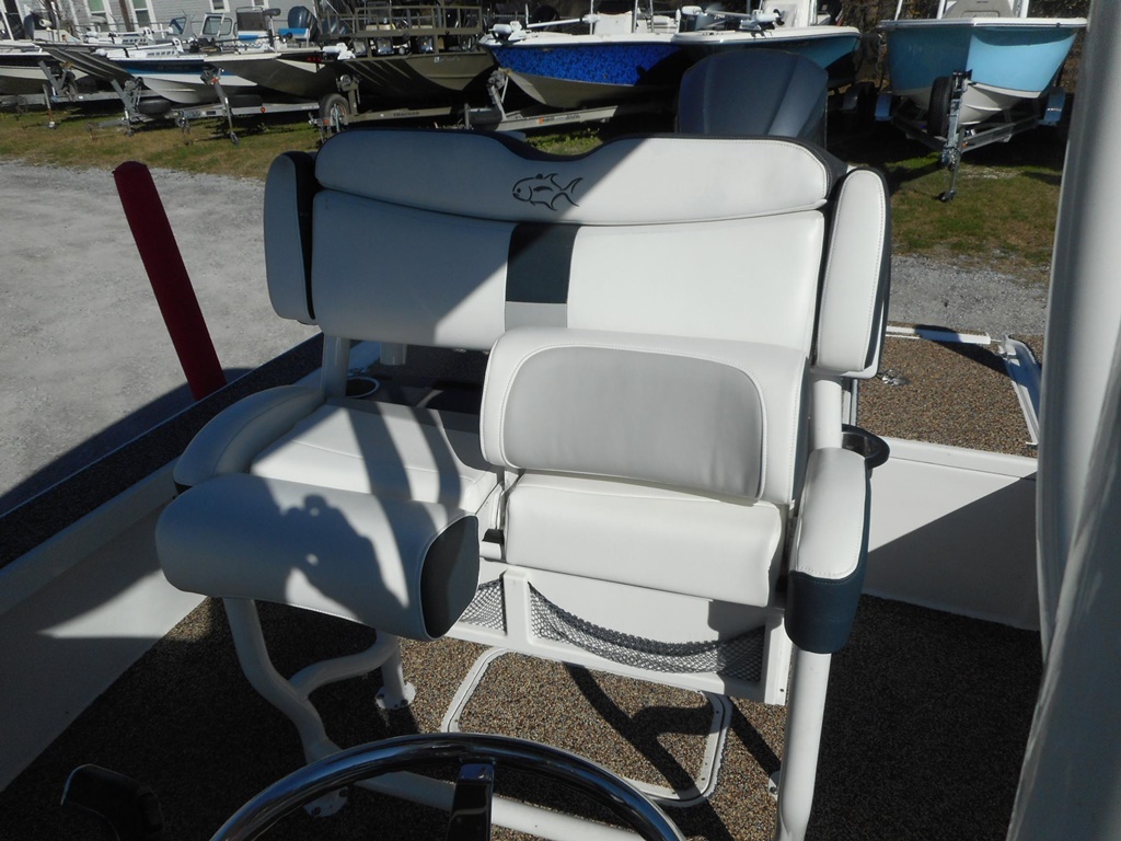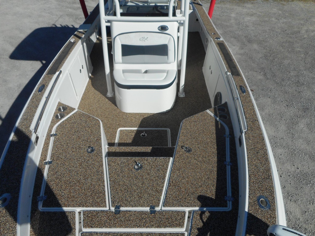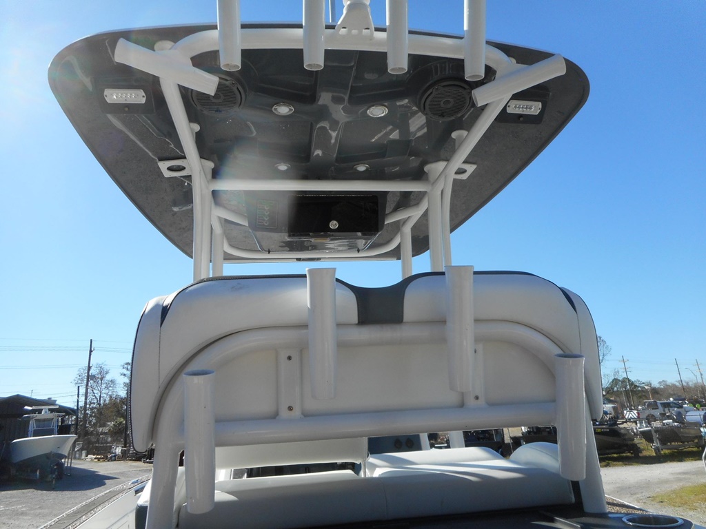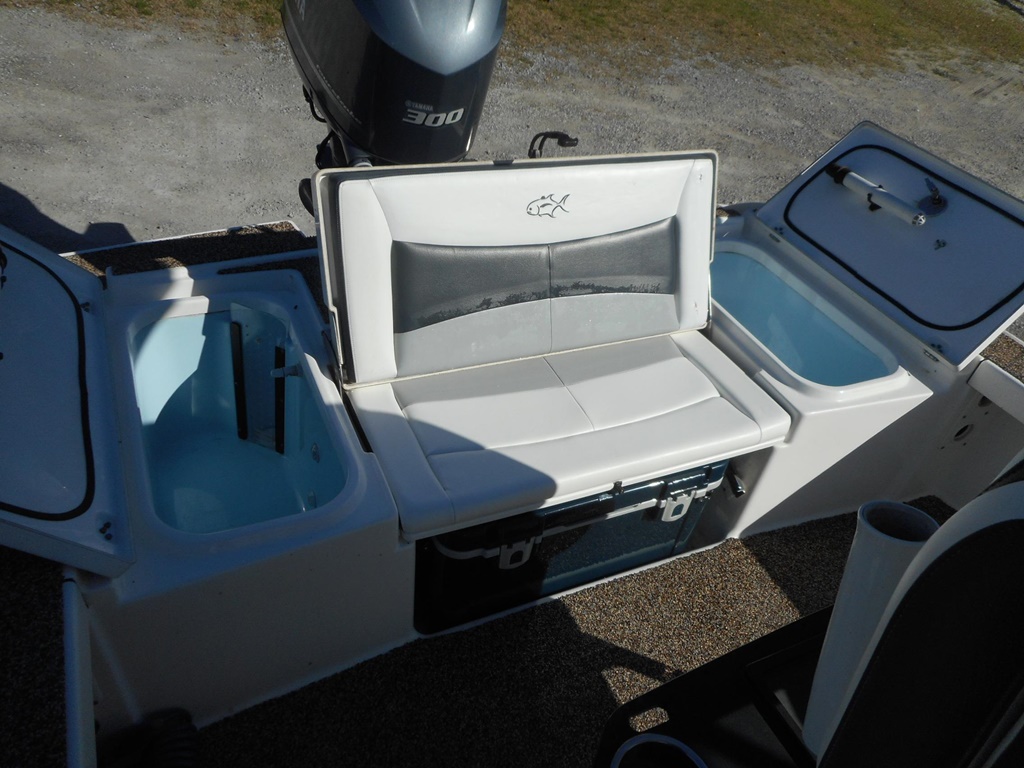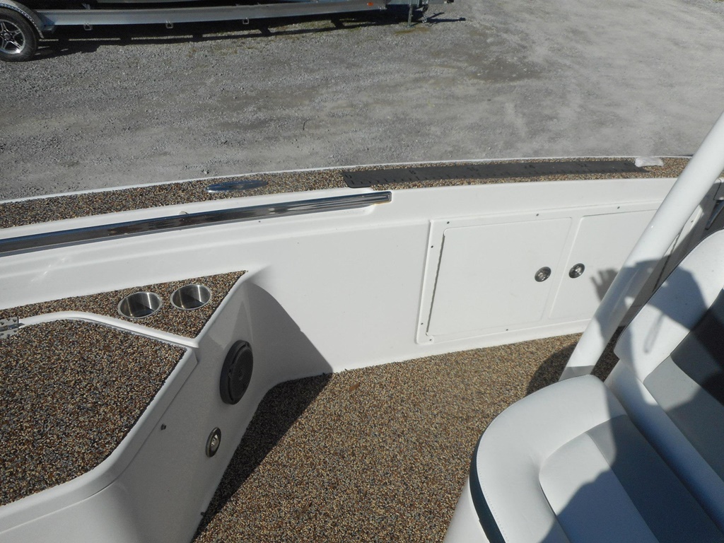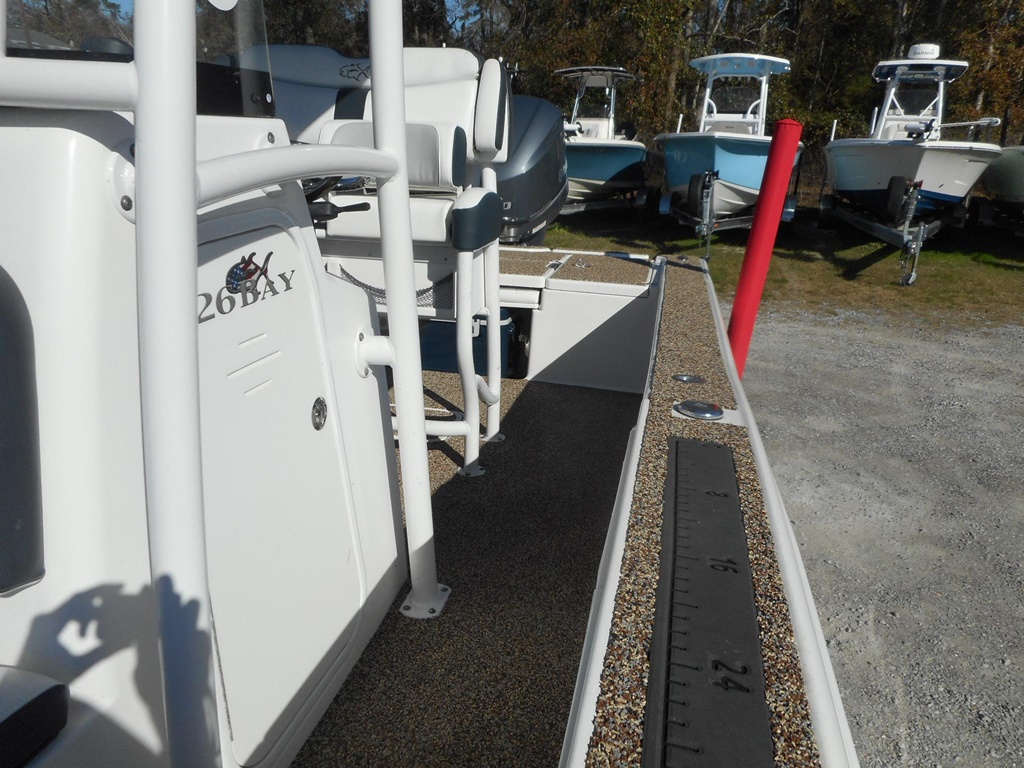 The 26 Bay offers incredible features for both serious anglers and recreational boaters, including integrated trim tabs, a larger console, 83-gallon fuel capacity, and up to 300 horsepower capability. Enjoy removable 72-quart coolers, a forward seating package, a ski pylon, and an in-console porta-potty for added convenience. For anglers, the boat is equipped with two 28-gallon release wells, a baitwell/cooler, lockable rod storage for 10 rods, a powder-coated leaning post with backrest, rod holders, rigging tray, and in-floor storage for a 5-gallon bucket with cast net.