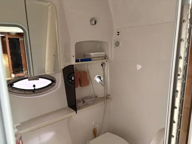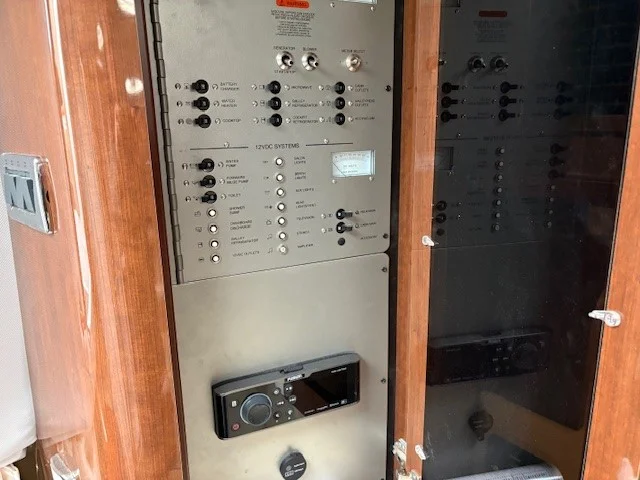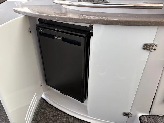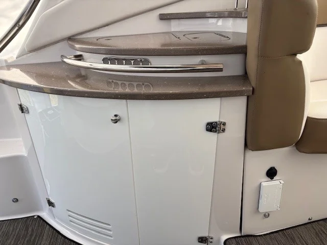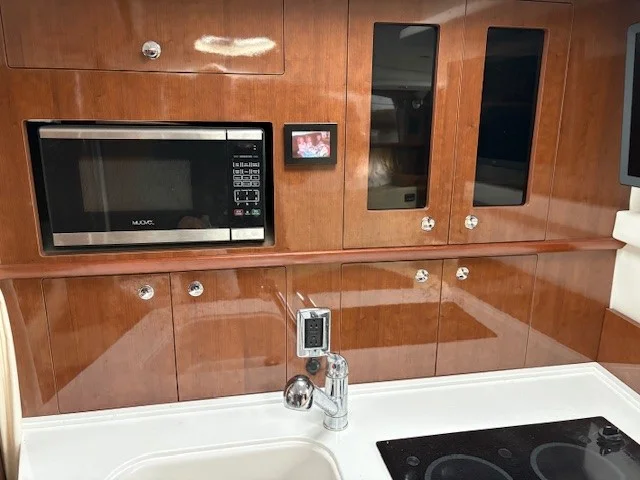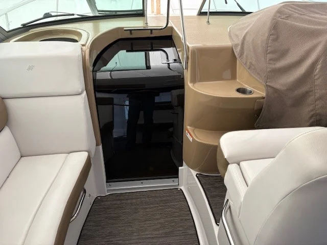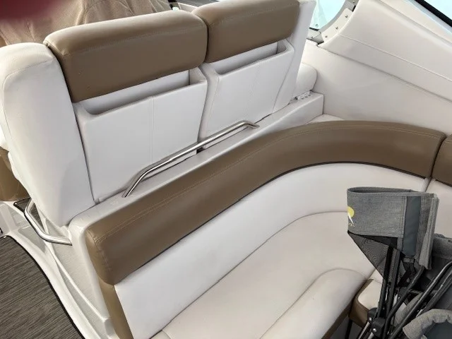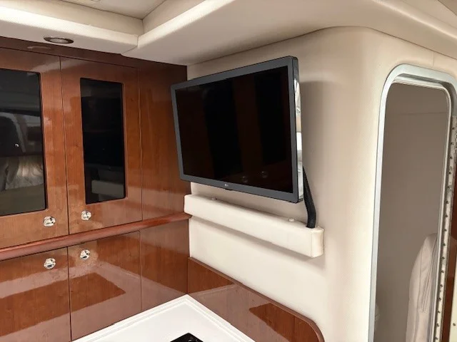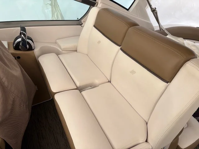 Fine example of one of Four Winns flagship Vistas. Always fresh water, low hour, professionally maintained, wheeled and waxed every year. Numerous upgrades: custom Miller canvas in 2021 with polycarbonate panels forward and stratoglass in rear. In 2022, new custom cockpit carpet, sea deck on swim platform. Smart TV in cabin. New batteries in fall of 2025. Feature packed from the factory. Windlass, spotlight, generator, bow cushions, aft facing transom seat, air cond/heat, fusion stereo, added satellite weather to Garmin display. Fiberglass hardtop with tinted panels. Vacu-flush head. Water heater. Cherry wood interior with gloss finish. Galley and cockpit fridge. Windshield wipers. Power engine hatch. Cockpit TV. Central vacuum. Transom shower. Microwave. Efficient stern drive performance with Mercruiser Bravo III's and Axius Joystick docking. Along with better fuel consumption, the ability to trim the drives opens up the shallow areas for recreating. All around great family boat, this one won't last long. Call for a showing.
