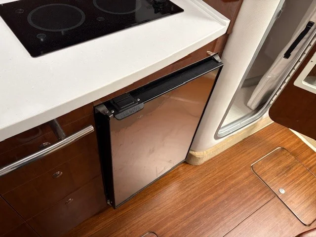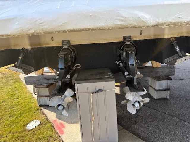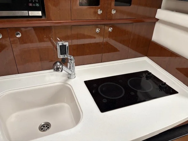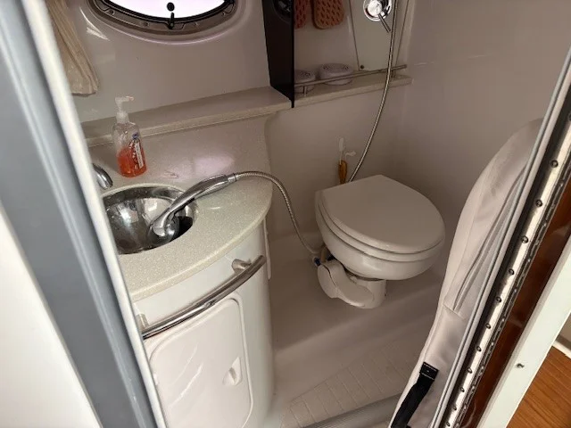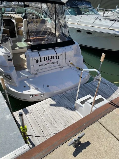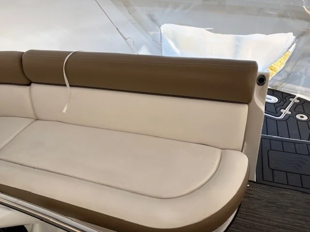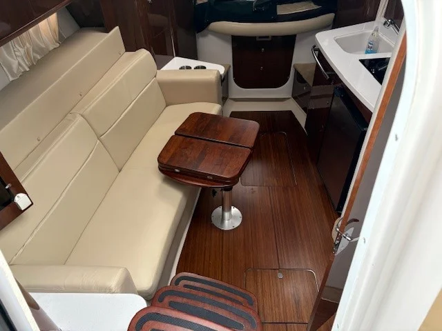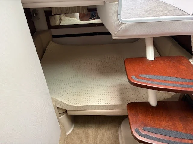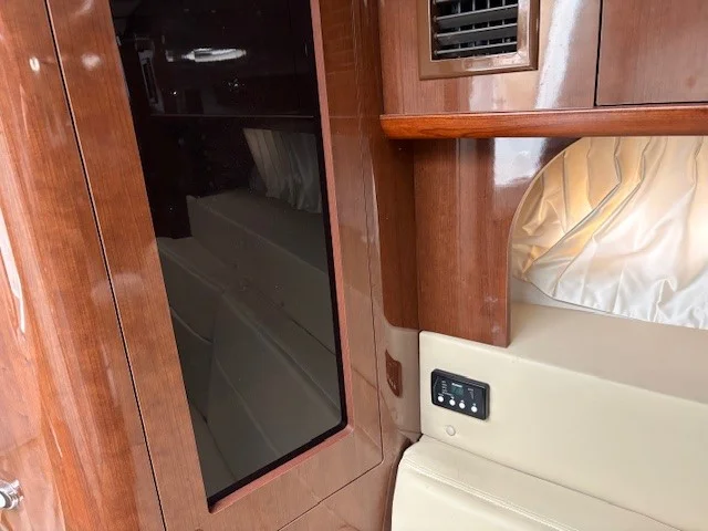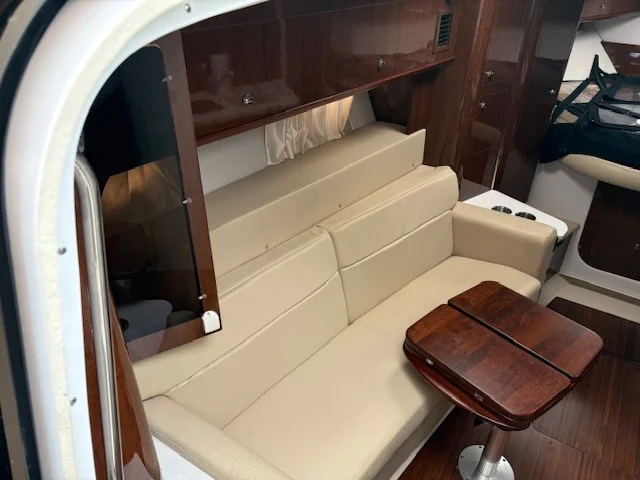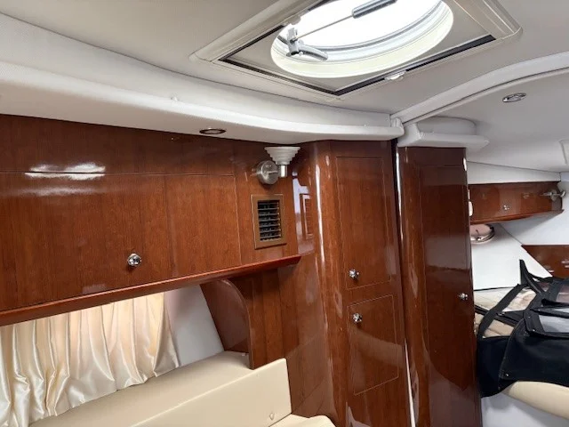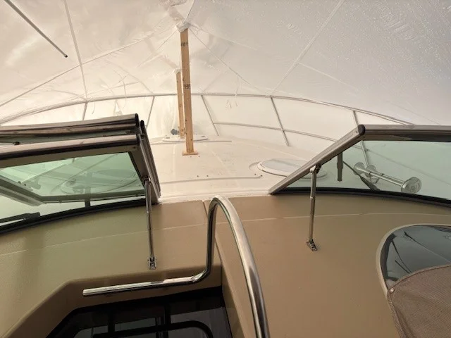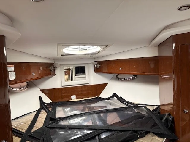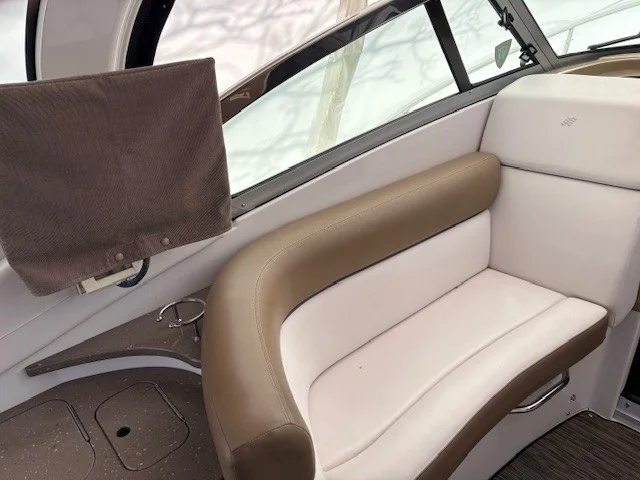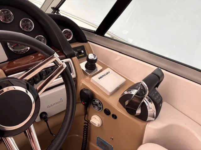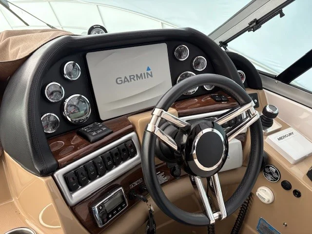 Fine example of one of Four Winns flagship Vistas. Always fresh water, low hour, professionally maintained, wheeled and waxed every year. Numerous upgrades: custom Miller canvas in 2021 with polycarbonate panels forward and stratoglass in rear. In 2022, new custom cockpit carpet, sea deck on swim platform. Smart TV in cabin. New batteries in fall of 2025. Feature packed from the factory. Windlass, spotlight, generator, bow cushions, aft facing transom seat, air cond/heat, fusion stereo, added satellite weather to Garmin display. Fiberglass hardtop with tinted panels. Vacu-flush head. Water heater. Cherry wood interior with gloss finish. Galley and cockpit fridge. Windshield wipers. Power engine hatch. Cockpit TV. Central vacuum. Transom shower. Microwave. Efficient stern drive performance with Mercruiser Bravo III's and Axius Joystick docking. Along with better fuel consumption, the ability to trim the drives opens up the shallow areas for recreating. All around great family boat, this one won't last long. Call for a showing.