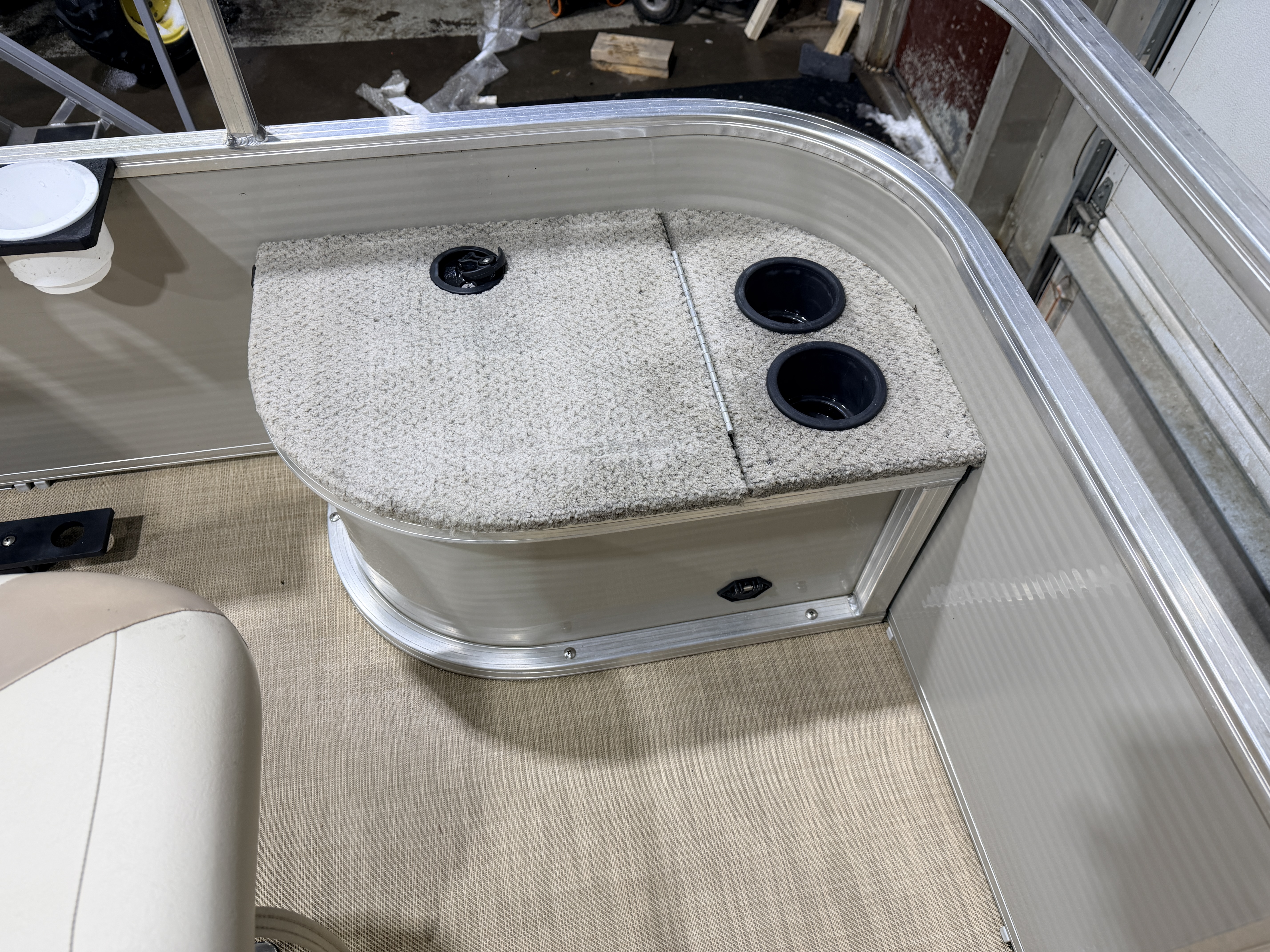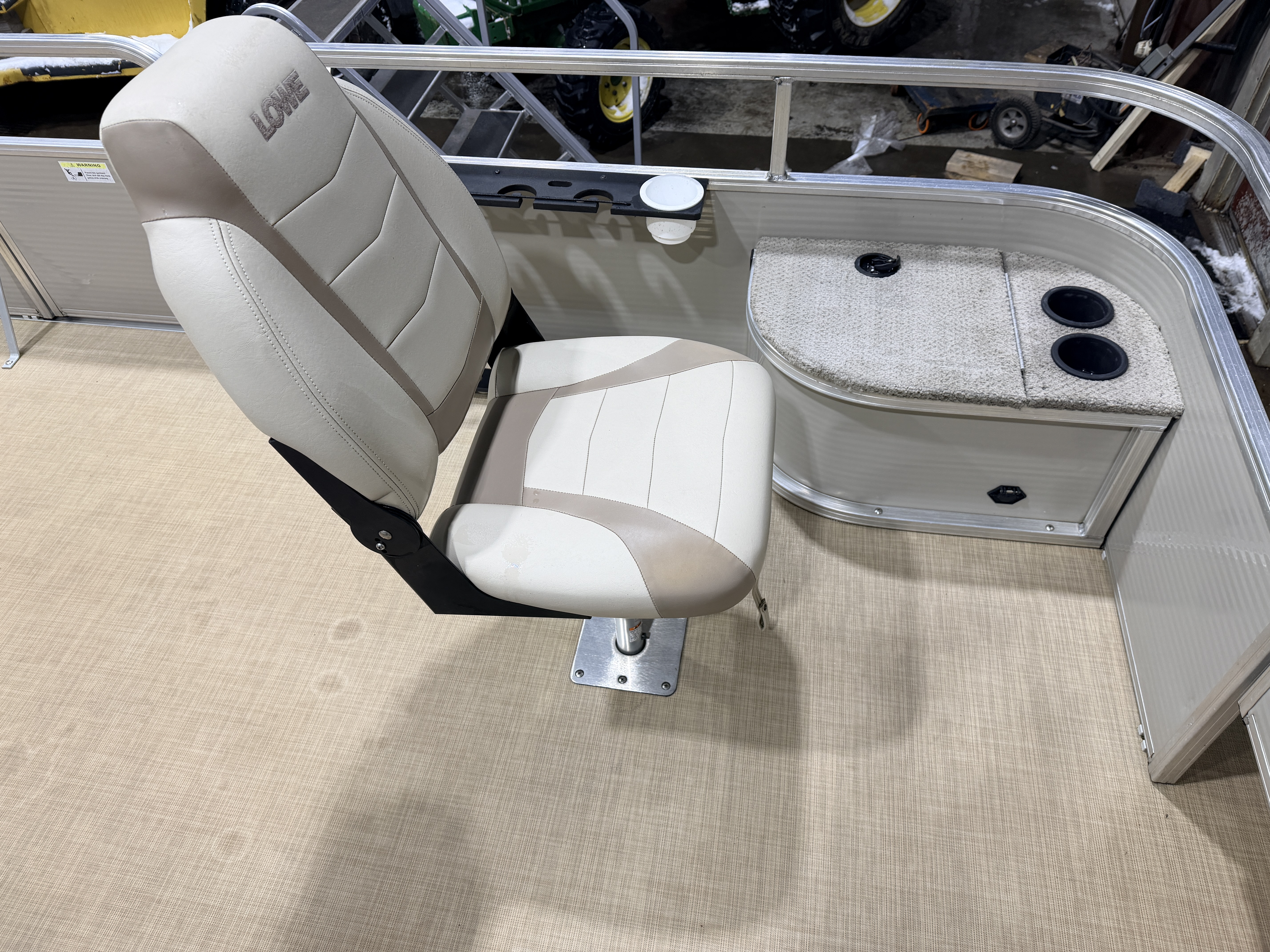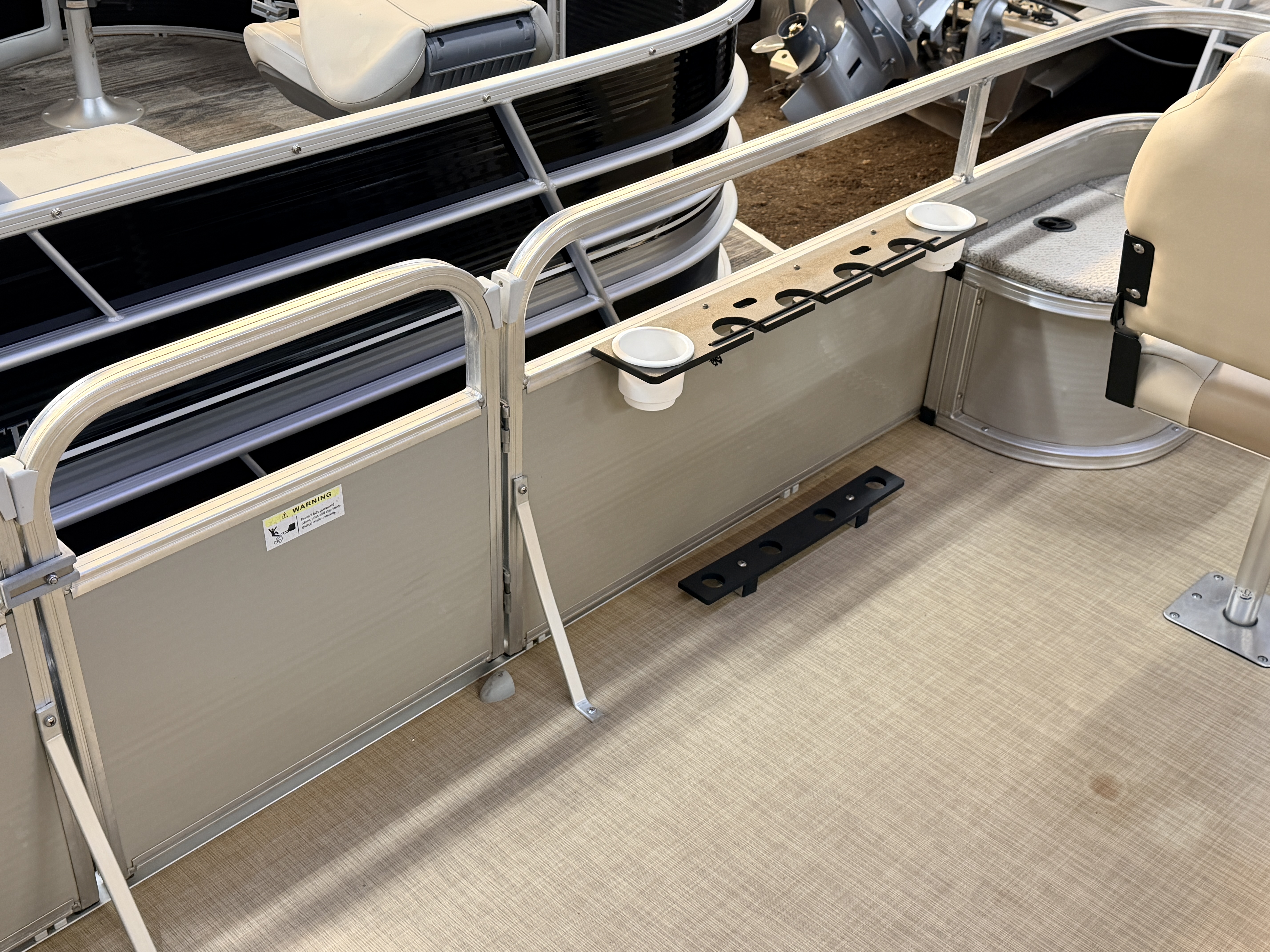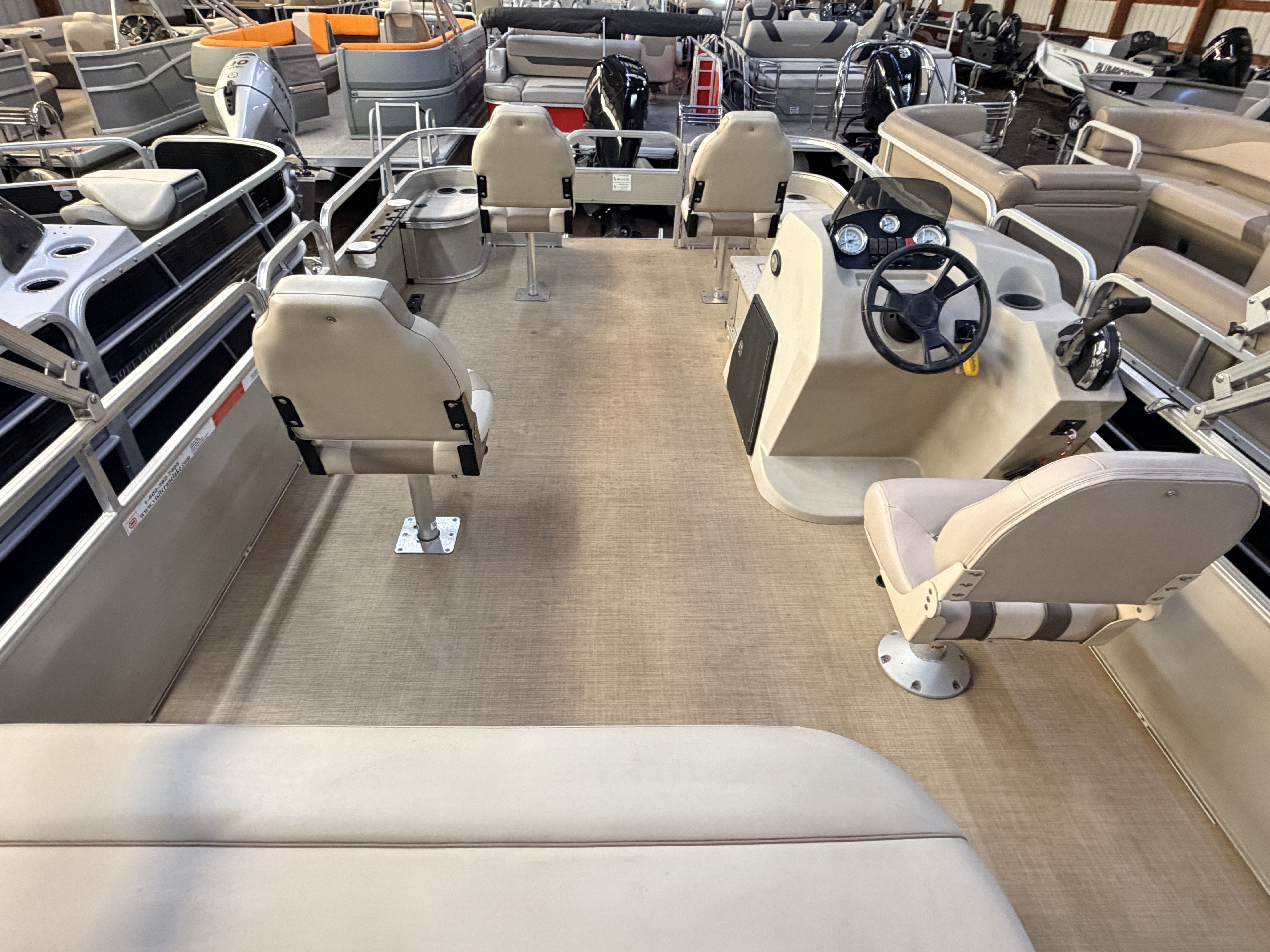 This Fish & Cruise model pontoon has 3 fishing seats; 2 of which are mounted in the front and another mounted on the port side amidships. There is a couch along the rear of the pontoon. The front fishing seats have a mini console in each corner. The starboard side console has 2 cup holders and a storage compartment. The port side has 2 cup holders and the storage compartment can hold a battery for a trolling motor and there is a receptacle on the outside of the mini console to plug your trolling motor into. There is a vertical fishing rod storage bracket along the port side fence rail and an additional 2 cup holders. The helm features a Speedometer, Tachometer, and Trim gauge. There is a courtesy light on the side of the helm and an access door to access the helm wiring and also for storage. The captain's chair is a fold down fishing style seat with swivel and slide functions. The third fishing seat is in front of the rear couch along the port side rail fence. The couch has storage underneath the seat cushion. There is a rear entry gate which leads to a fold down swim ladder. This unit has a fold out bimini top for shade.