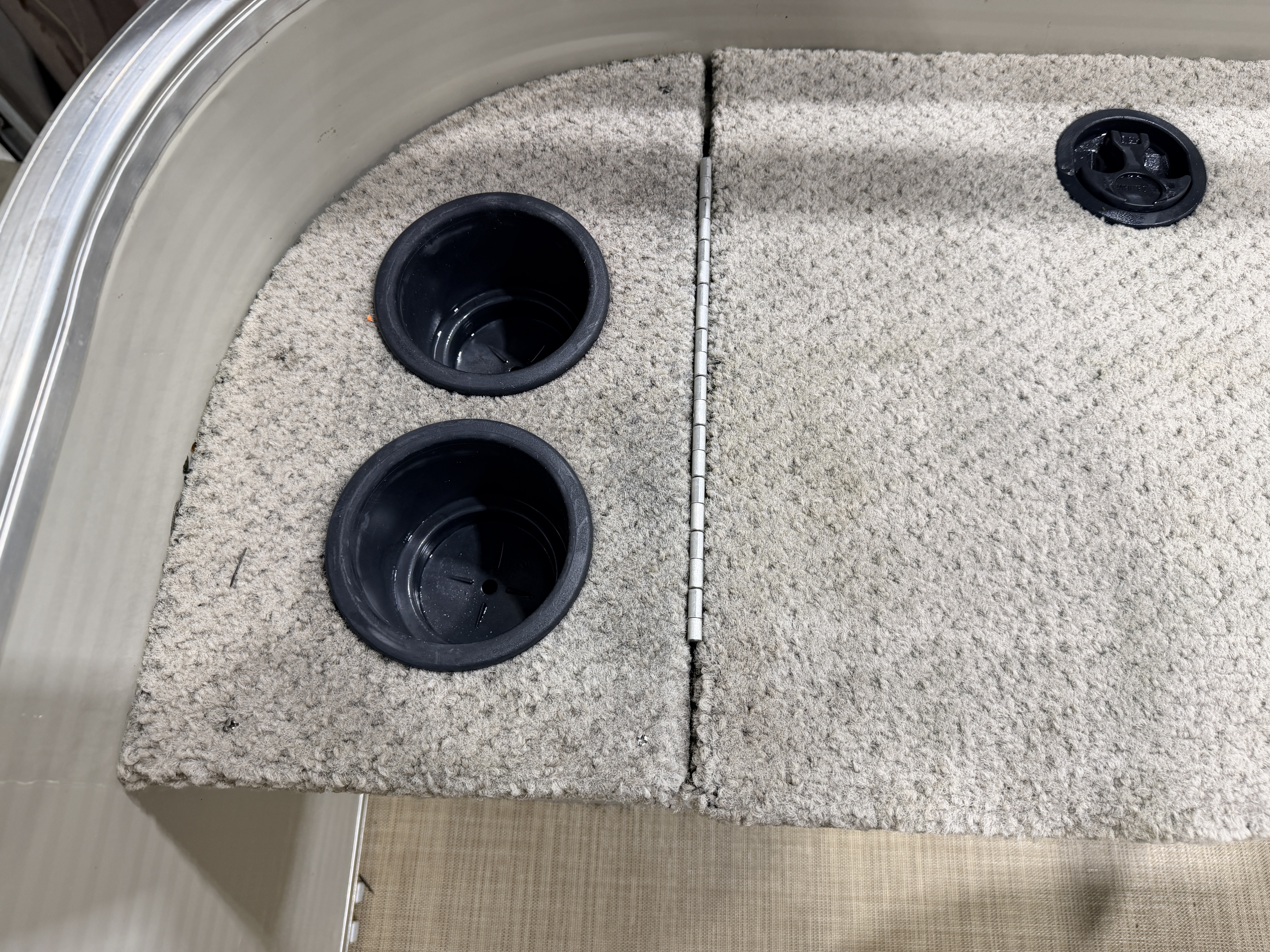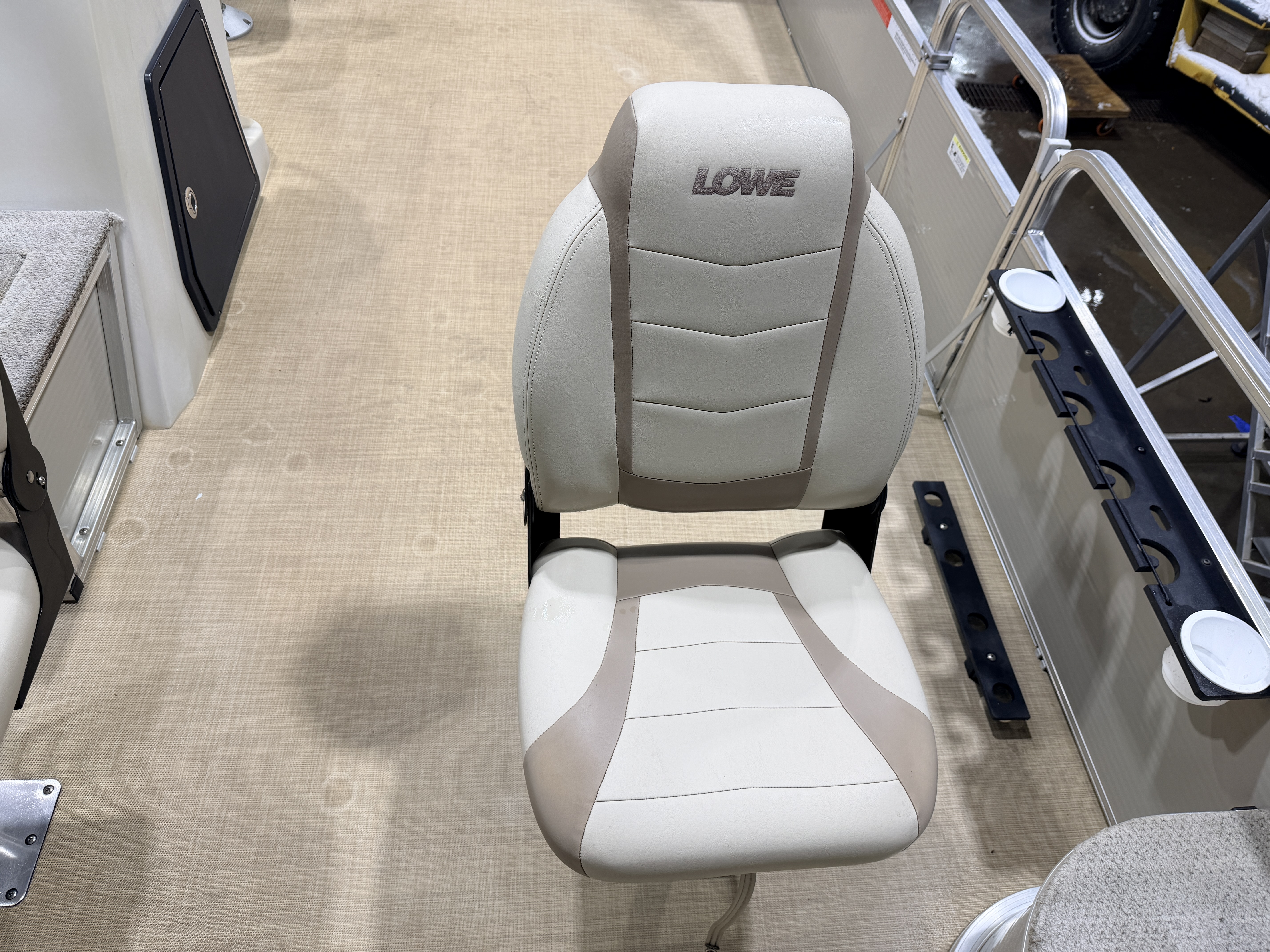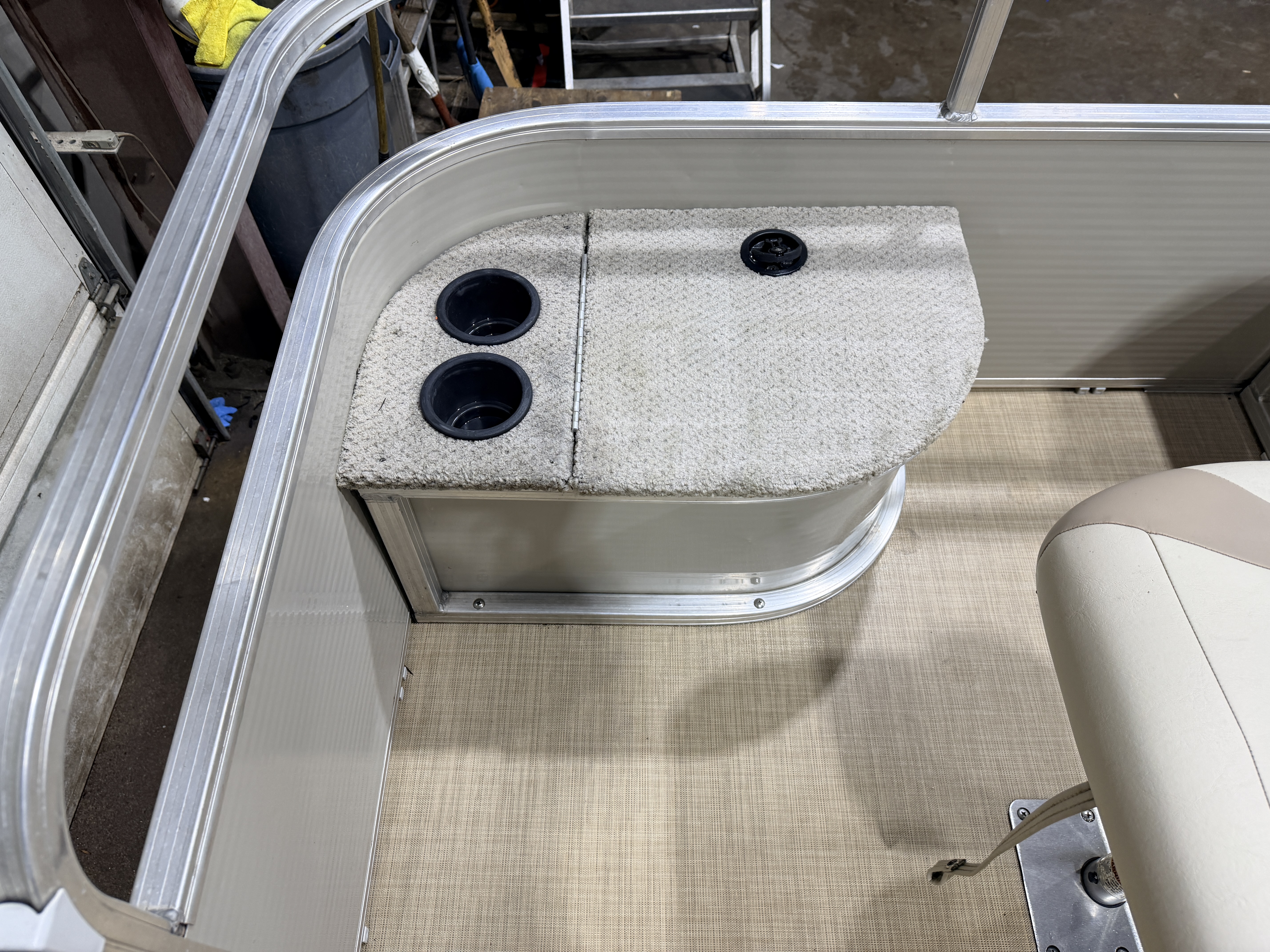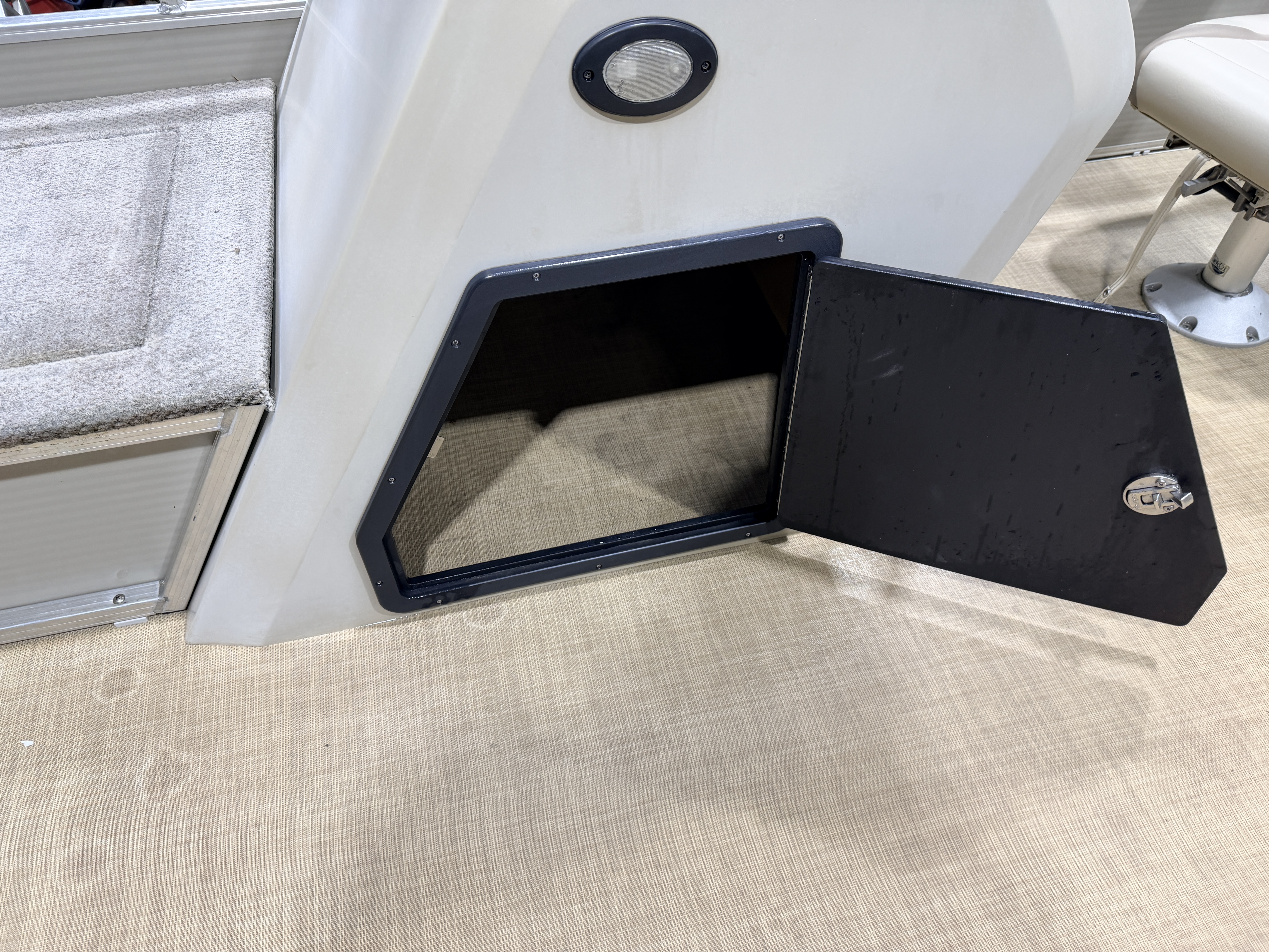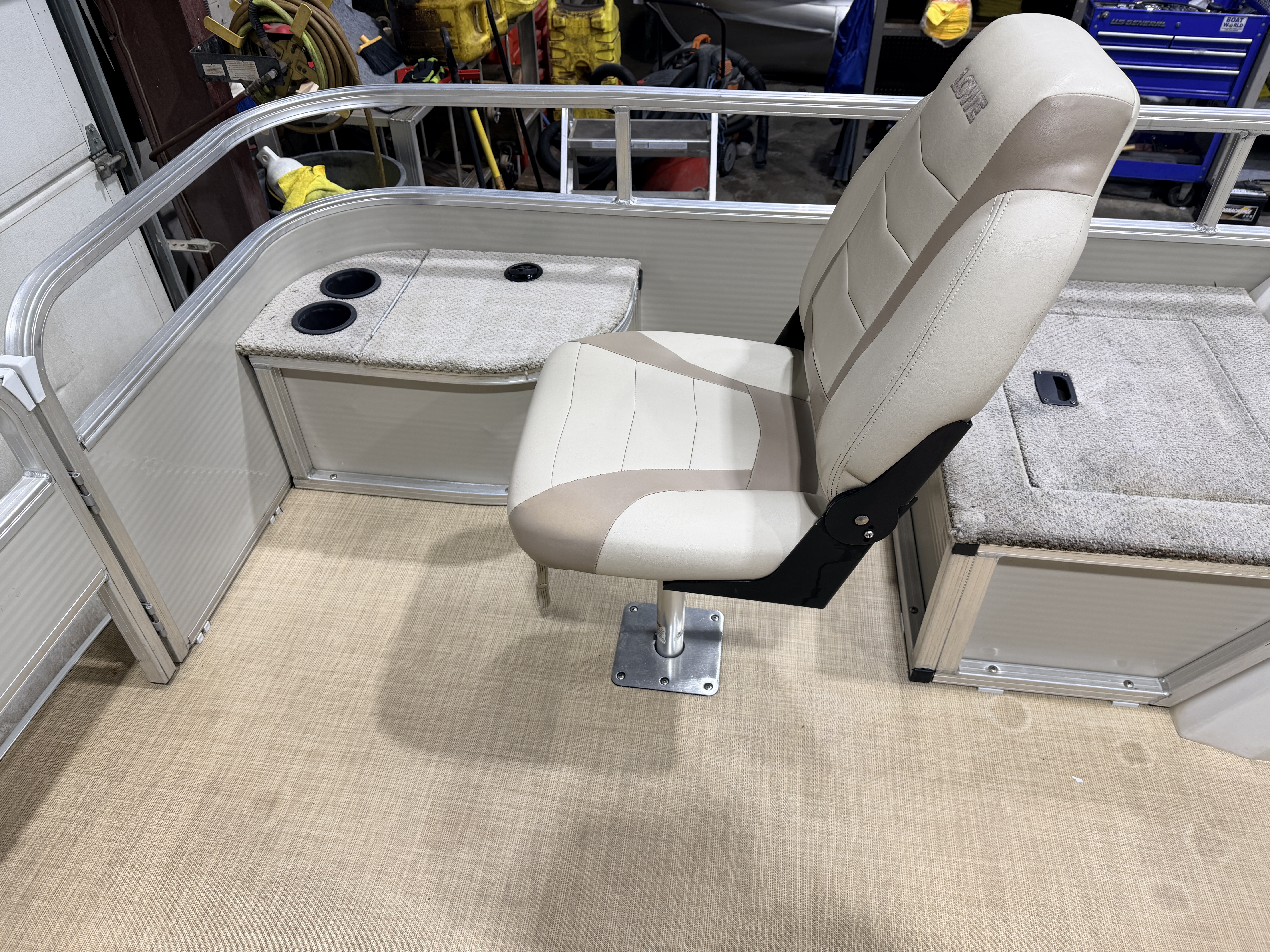 This Fish & Cruise model pontoon has 3 fishing seats; 2 of which are mounted in the front and another mounted on the port side amidships. There is a couch along the rear of the pontoon. The front fishing seats have a mini console in each corner. The starboard side console has 2 cup holders and a storage compartment. The port side has 2 cup holders and the storage compartment can hold a battery for a trolling motor and there is a receptacle on the outside of the mini console to plug your trolling motor into. There is a vertical fishing rod storage bracket along the port side fence rail and an additional 2 cup holders. The helm features a Speedometer, Tachometer, and Trim gauge. There is a courtesy light on the side of the helm and an access door to access the helm wiring and also for storage. The captain's chair is a fold down fishing style seat with swivel and slide functions. The third fishing seat is in front of the rear couch along the port side rail fence. The couch has storage underneath the seat cushion. There is a rear entry gate which leads to a fold down swim ladder. This unit has a fold out bimini top for shade.