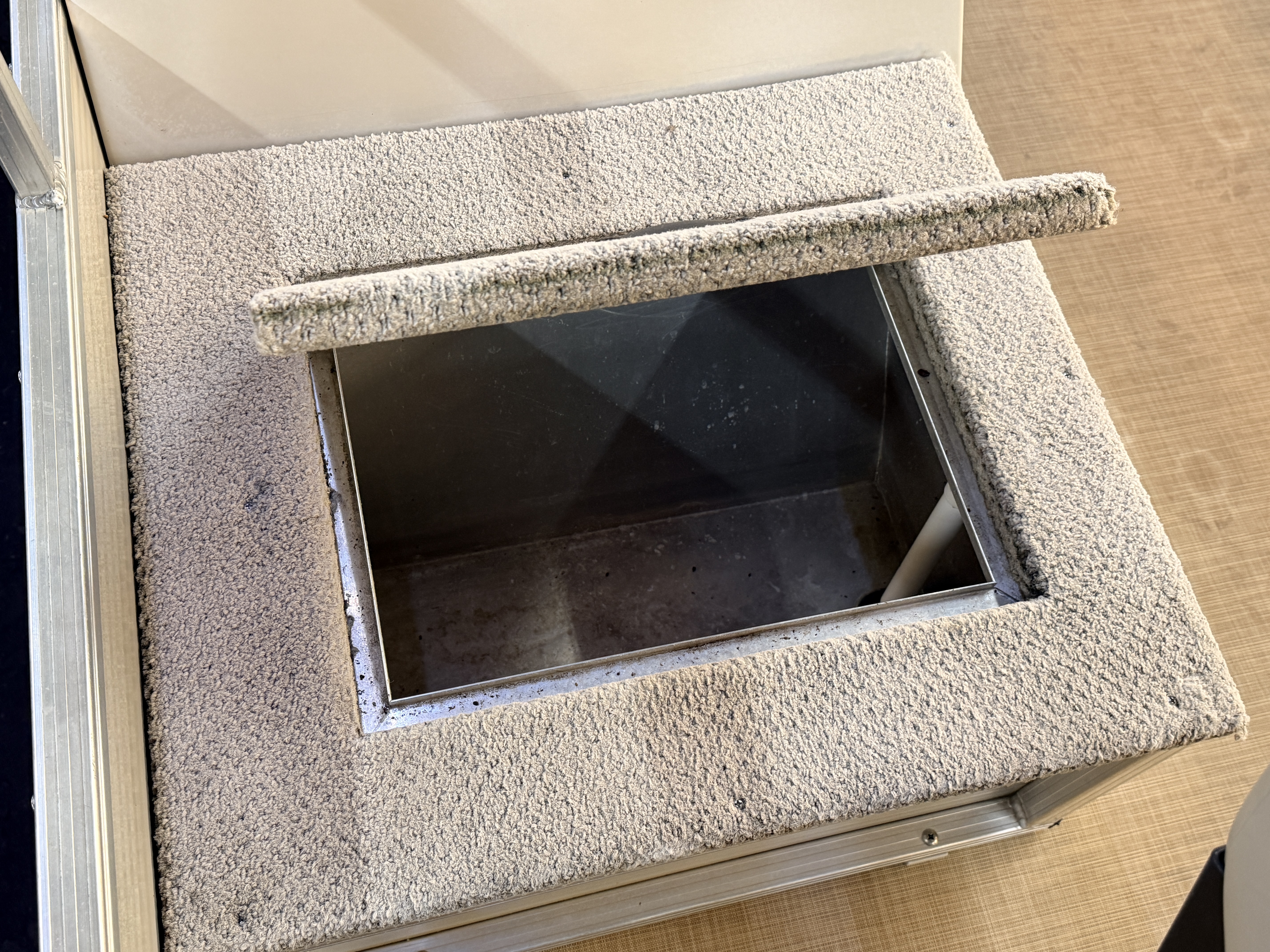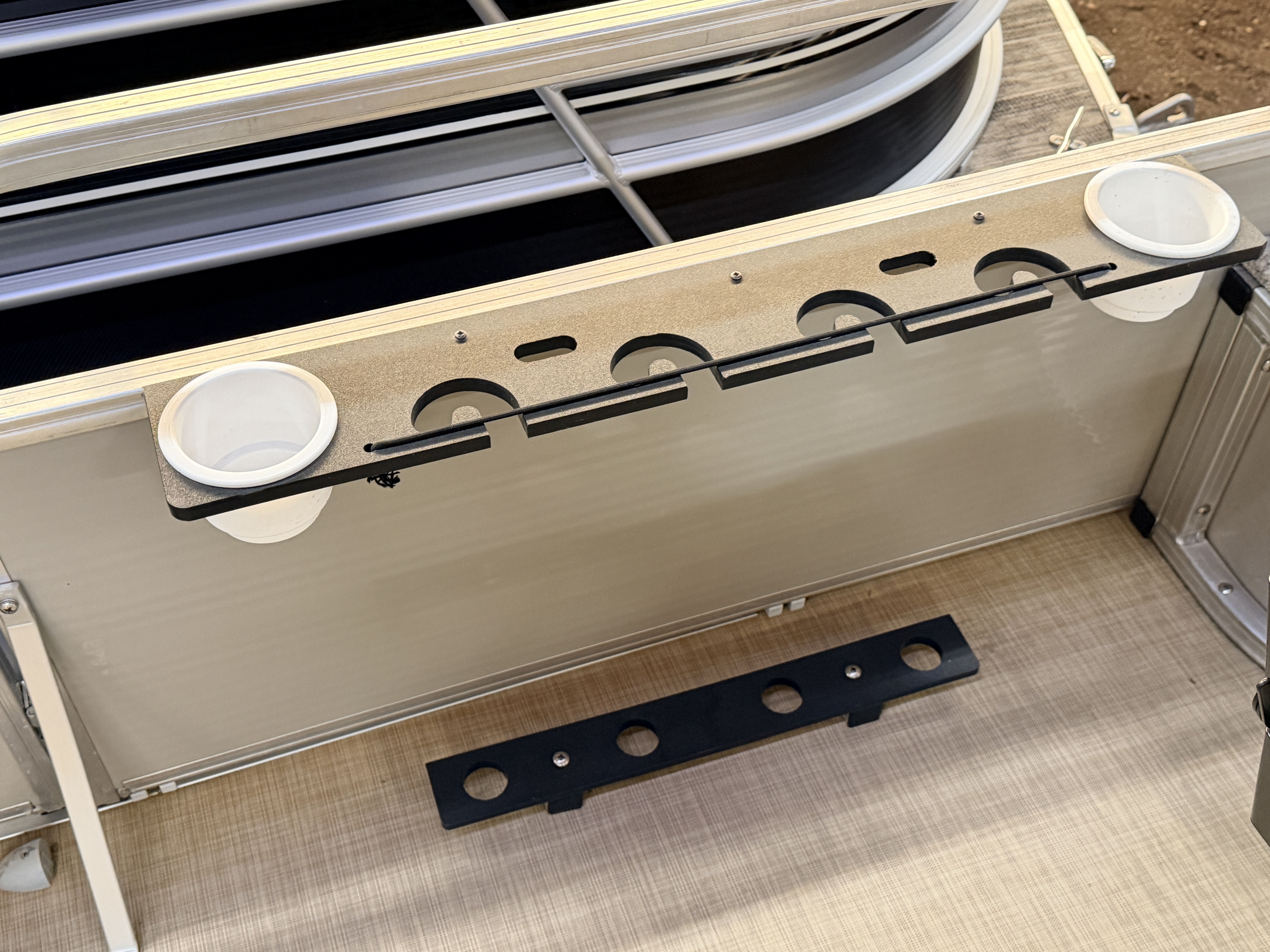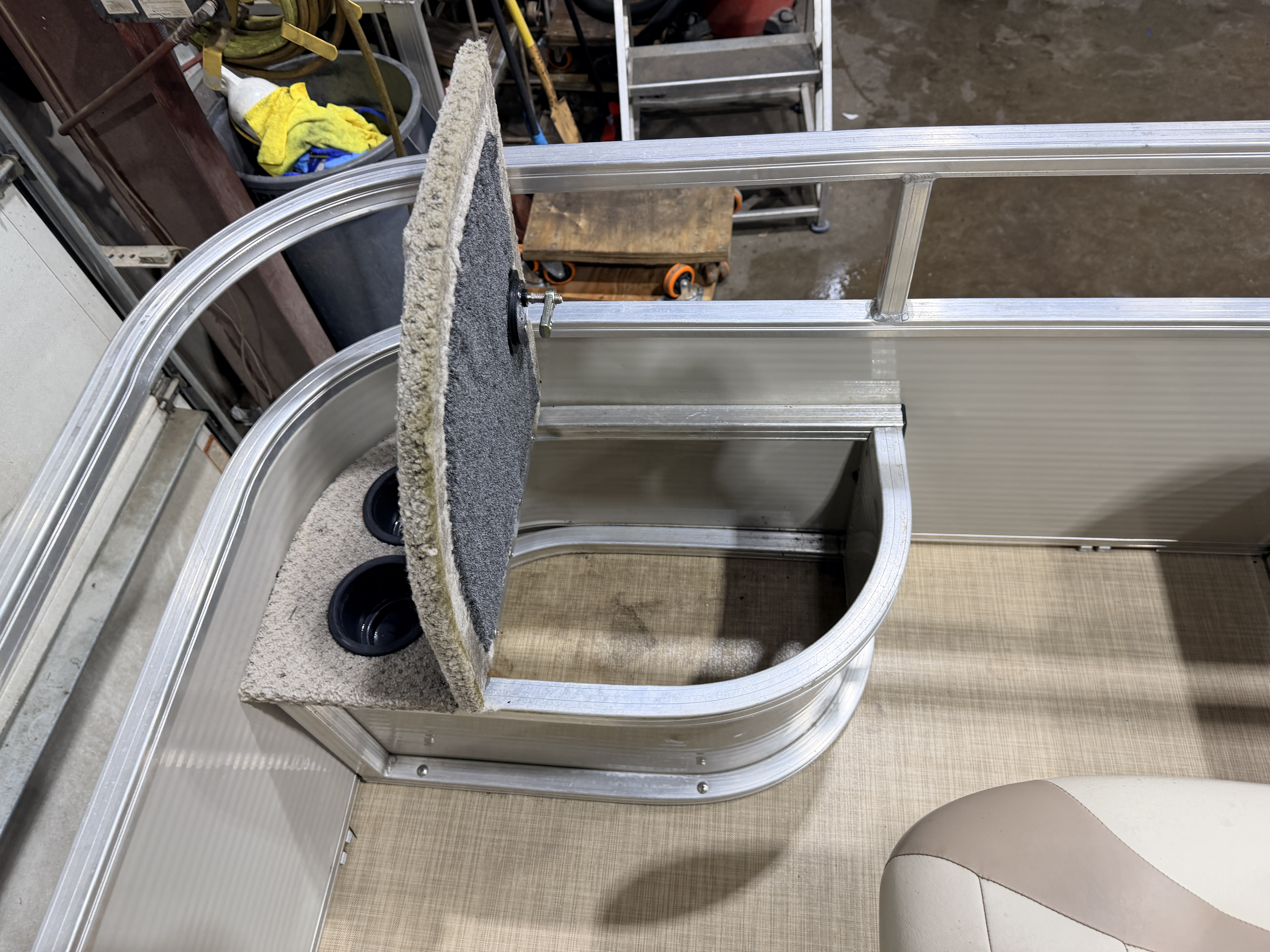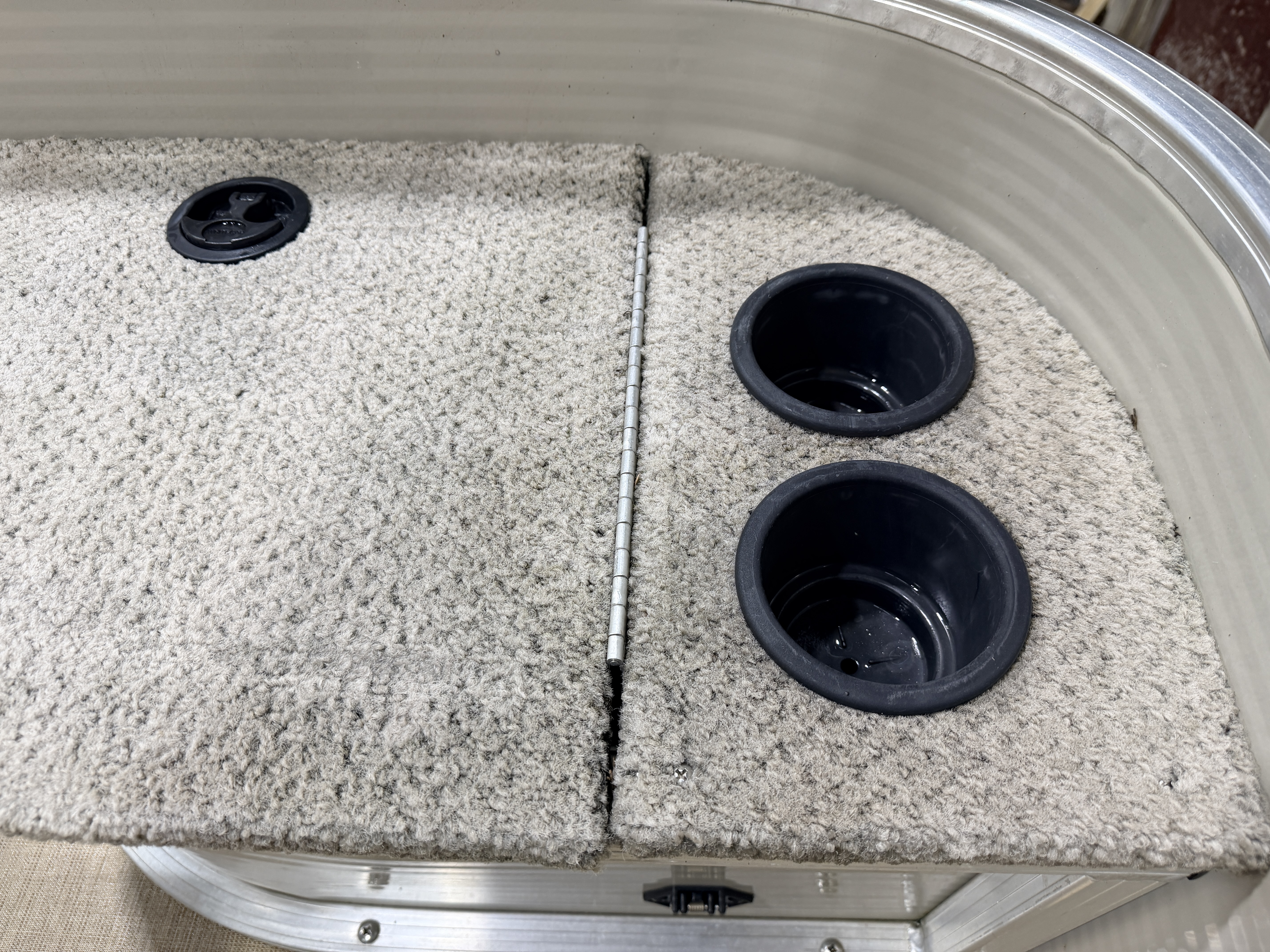 This Fish & Cruise model pontoon has 3 fishing seats; 2 of which are mounted in the front and another mounted on the port side amidships. There is a couch along the rear of the pontoon. The front fishing seats have a mini console in each corner. The starboard side console has 2 cup holders and a storage compartment. The port side has 2 cup holders and the storage compartment can hold a battery for a trolling motor and there is a receptacle on the outside of the mini console to plug your trolling motor into. There is a vertical fishing rod storage bracket along the port side fence rail and an additional 2 cup holders. The helm features a Speedometer, Tachometer, and Trim gauge. There is a courtesy light on the side of the helm and an access door to access the helm wiring and also for storage. The captain's chair is a fold down fishing style seat with swivel and slide functions. The third fishing seat is in front of the rear couch along the port side rail fence. The couch has storage underneath the seat cushion. There is a rear entry gate which leads to a fold down swim ladder. This unit has a fold out bimini top for shade.