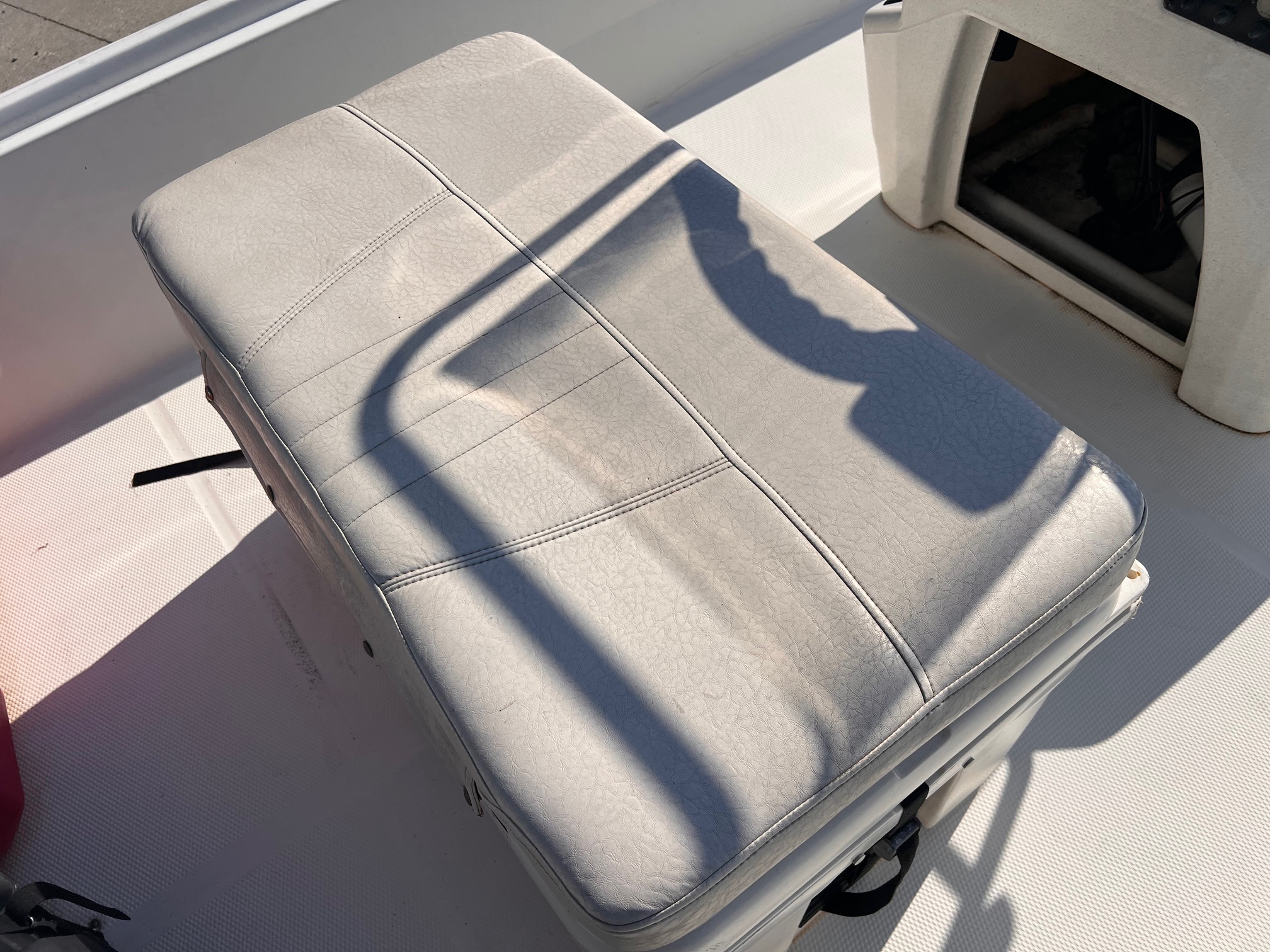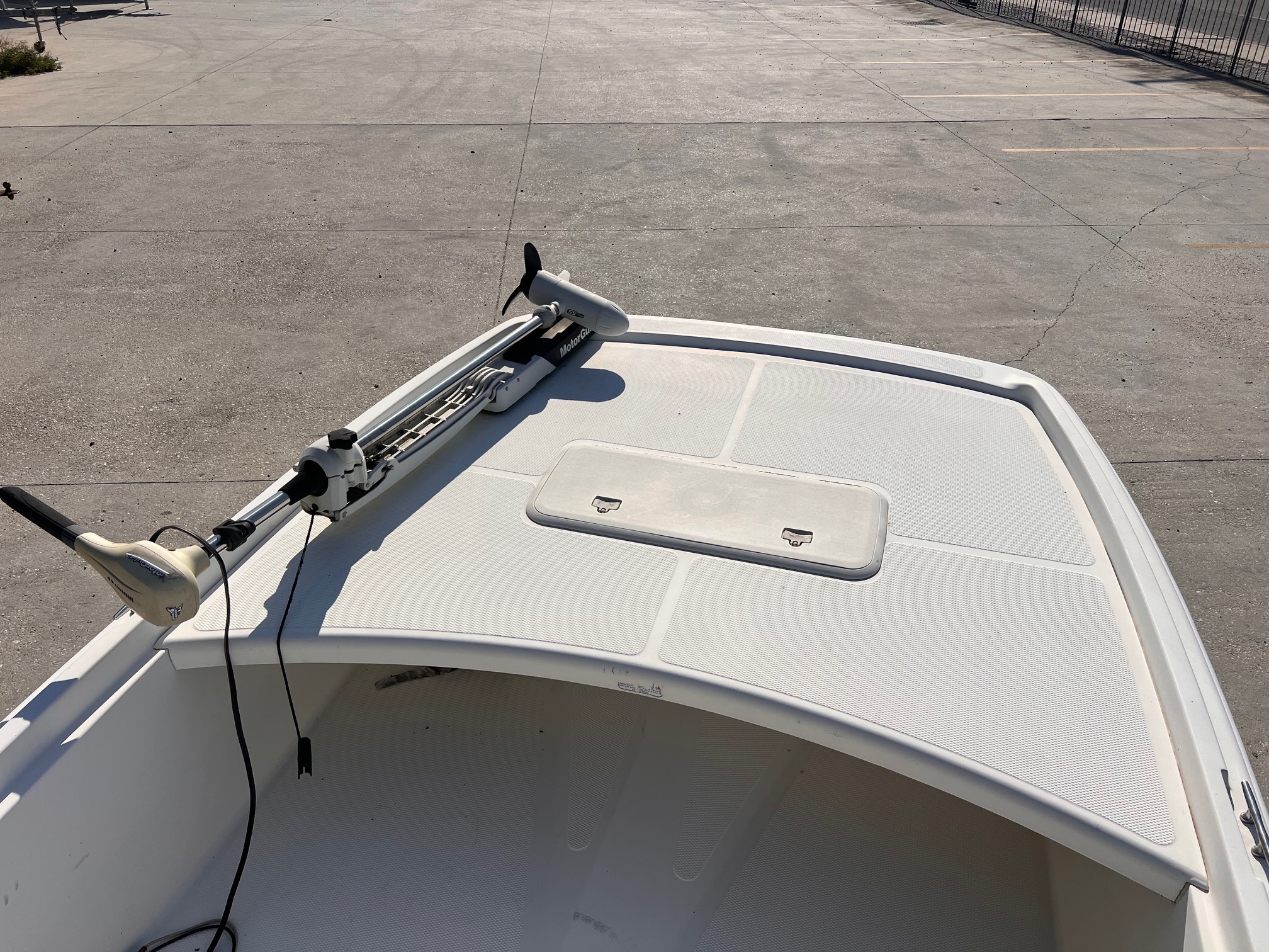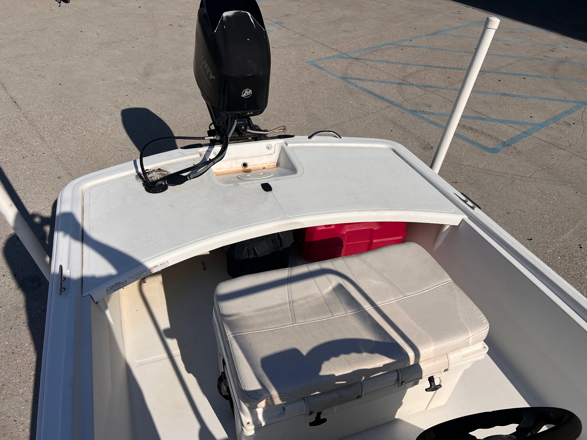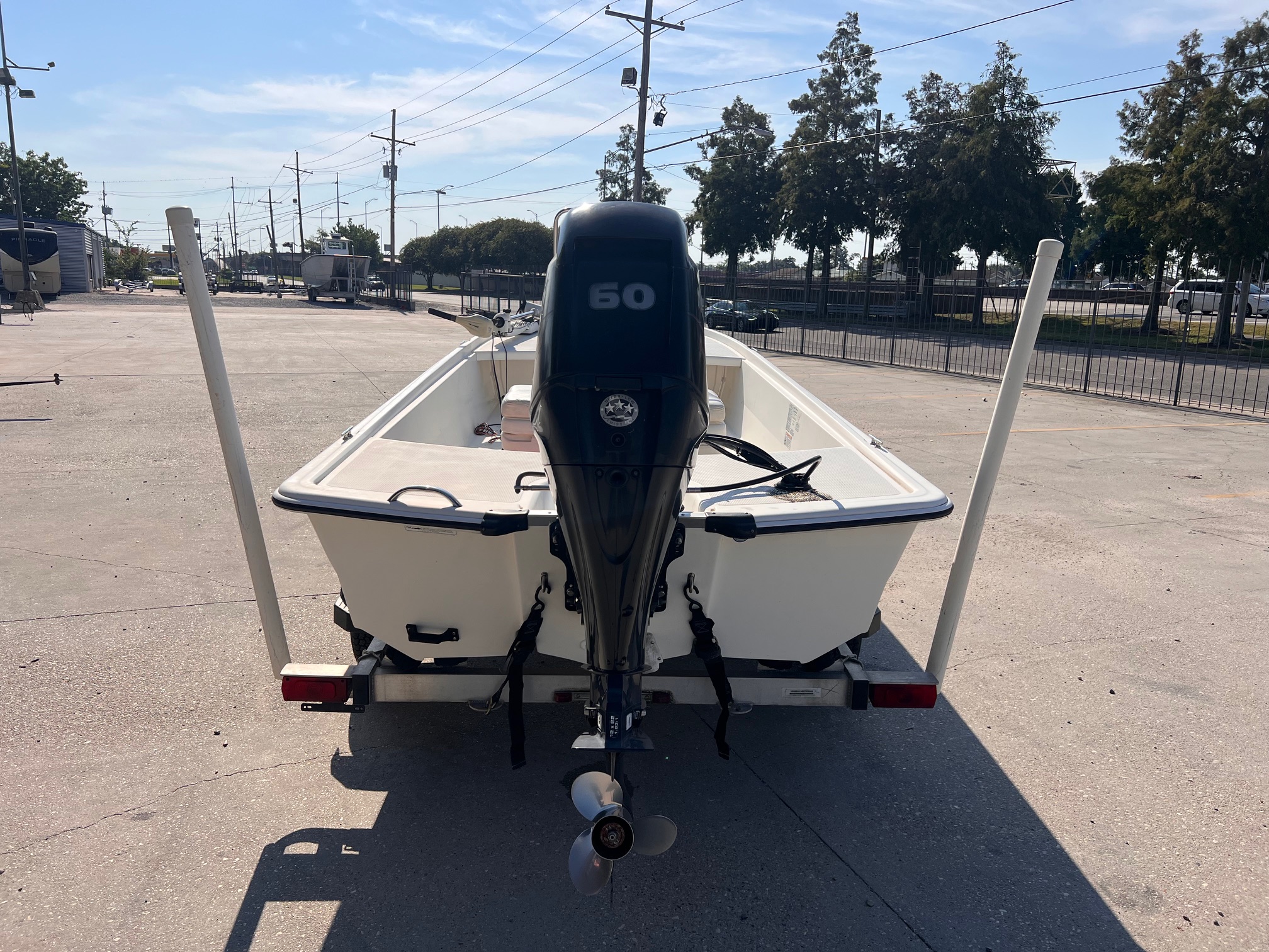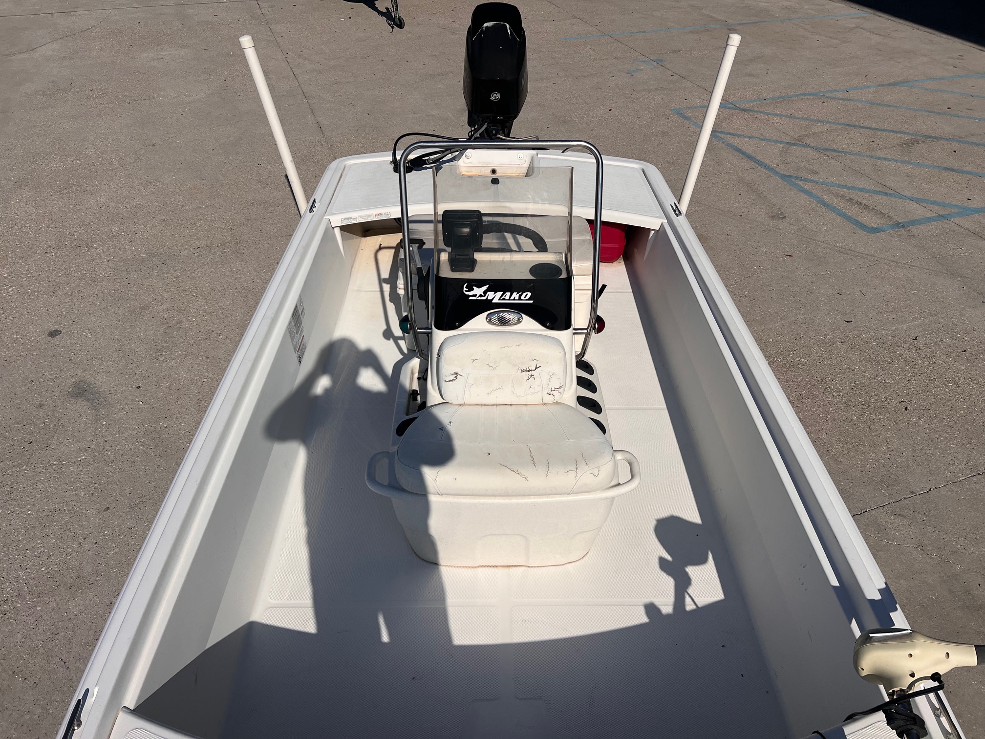 The Mako Pro 17 Skiff is a 17-foot center console skiff with a 6' 11" beam, a 75 HP maximum recommended outboard, and a 6.6-gallon fuel capacity. Key specs include a 8-inch draft, 18-inch interior depth, and a 1210 lb average dry weight. The boat is designed for saltwater and freshwater fishing, offering a comfortable seating option with a cooler, a livewell, and rod storage.
