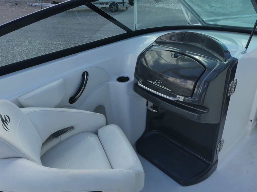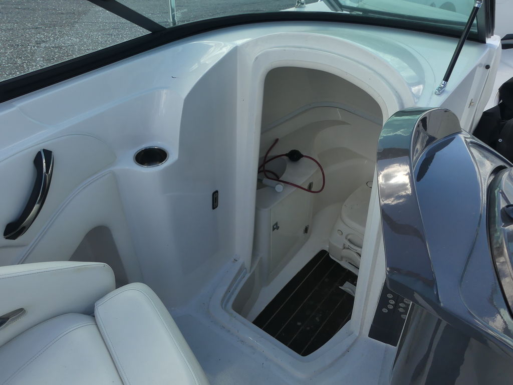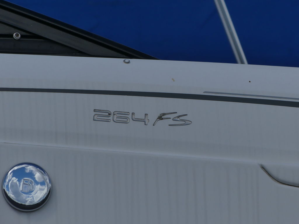 The 264FS features an agile frame that comfortably and safely provides room for your entire crew. Dual bucket seats with flip-up bolsters swivel to face the rear L-shaped lounge, which also doubles as a sun pad. The spacious adult-sized bow section on the FS also provides seat storage and drink holders in the gunwale. The ergonomically designed helm station features full instrumentation with low-glare night lighting. The sleek appearance is highlighted by fog resistant gauges, backlit weatherproof switches, and a sleek black steering wheel with a silver insert. A full fiberglass head and a large swim platform with telescopic recessed boarding ladder make for safe and comfortable family outings.