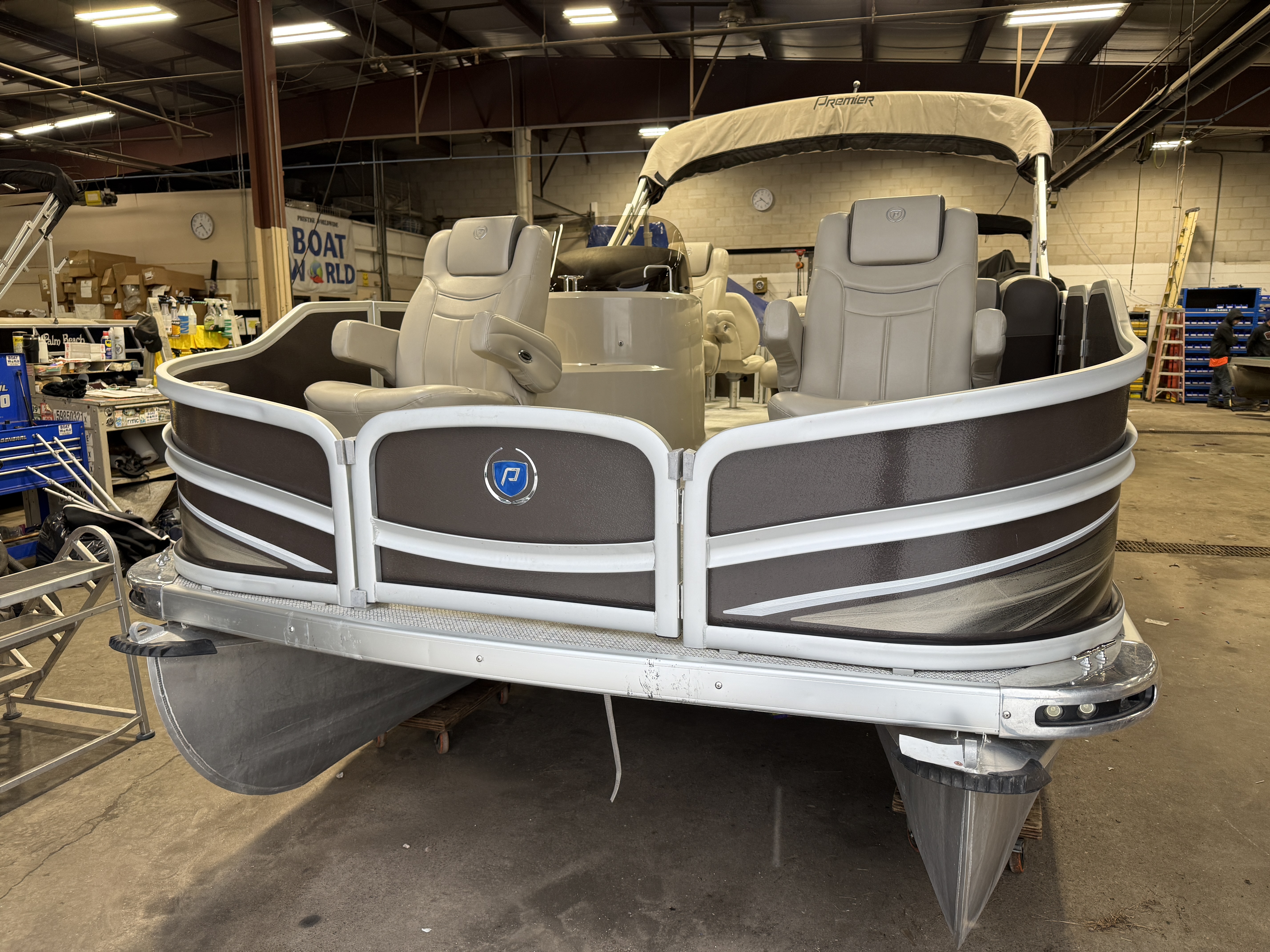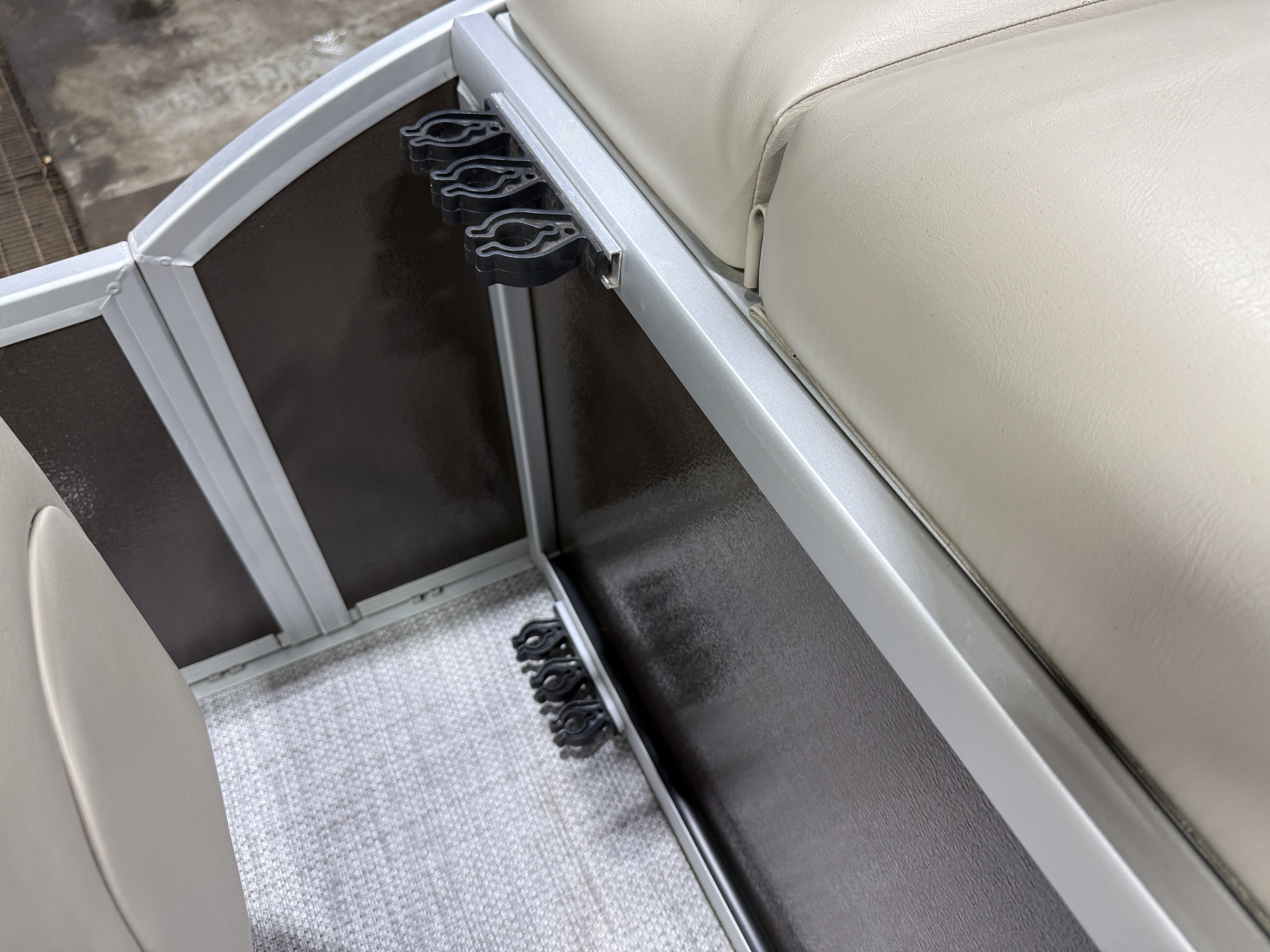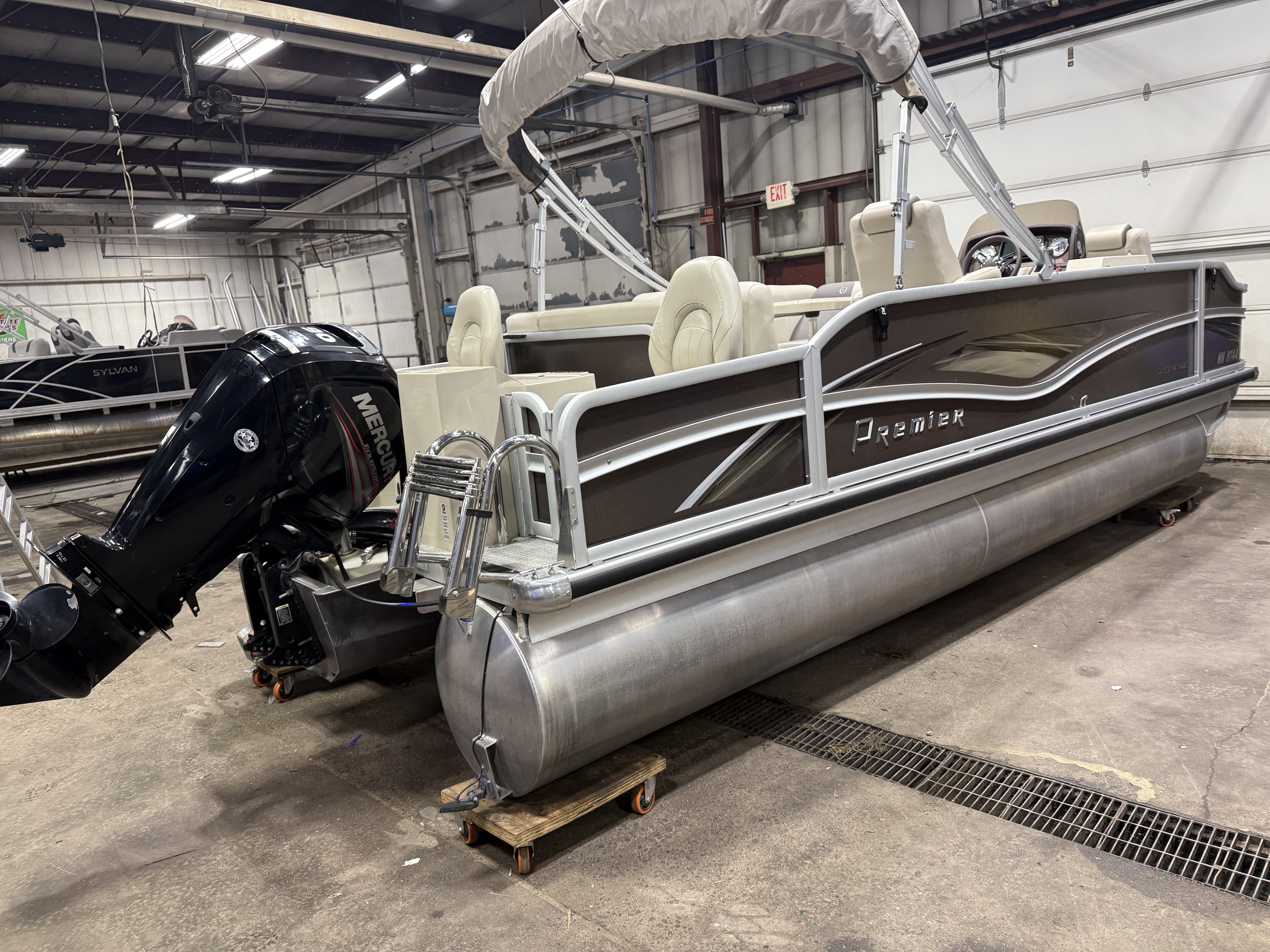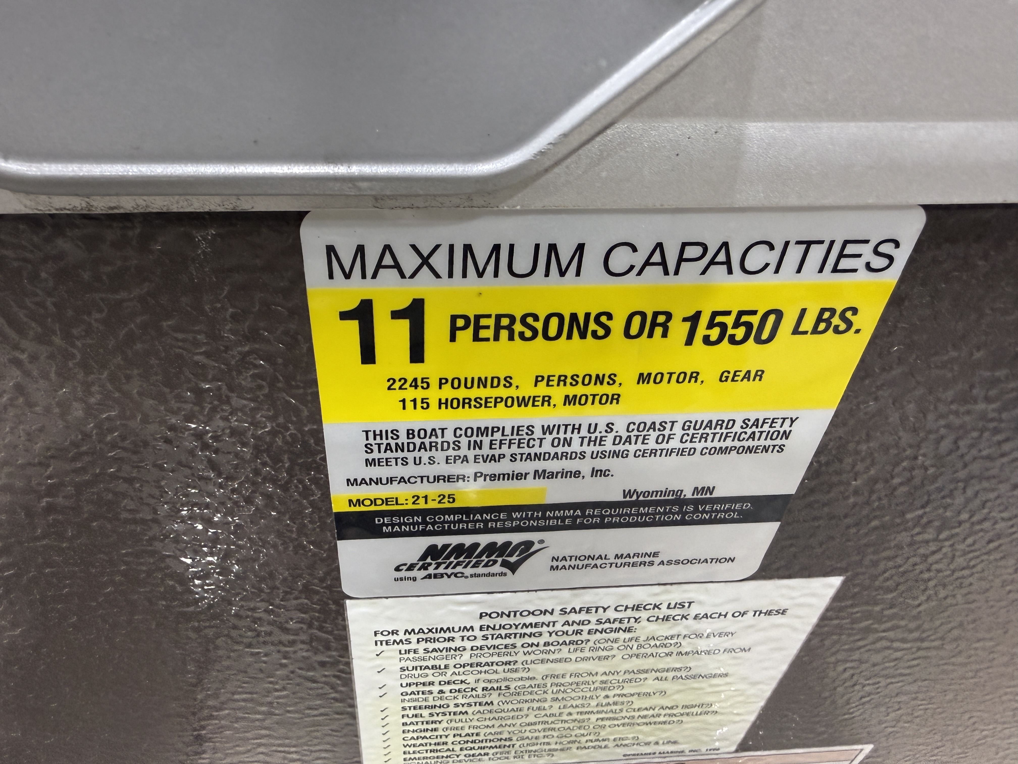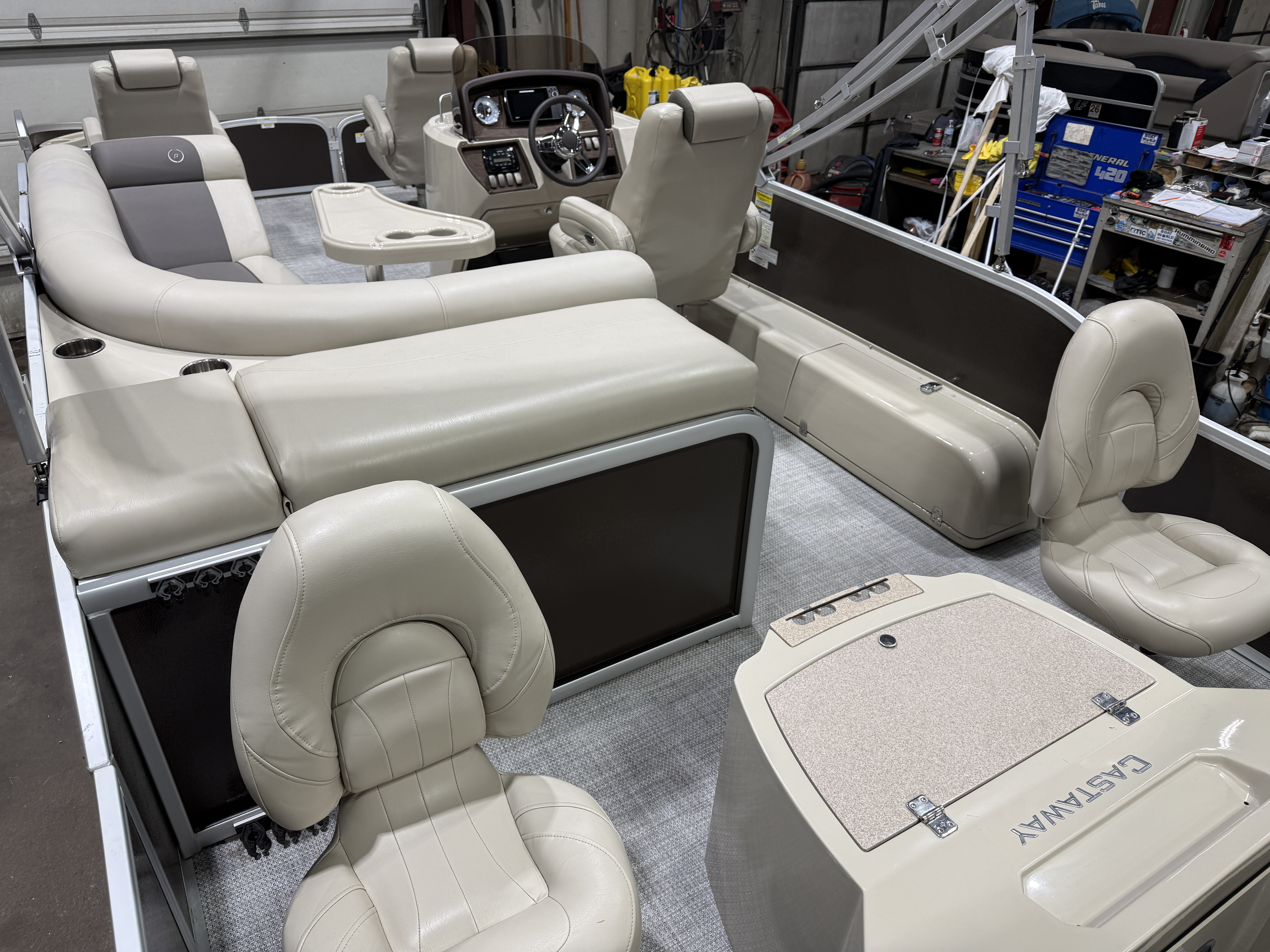 2016 Premier 220 Castaway Pontoon & Mercury 90HP 4-Stroke EFI CT w/94Hours. This 22' Quad Fish Pontoon Has Upgraded Flexsteel Reclining Captain's Seats Up Front, Huge Front Livewell In The Front Of The Helm With A Paper Towel Holder, Sink & 2.5 Gallon Freshwater Tank, Wrap Around Chaise Lounge Seating With Storage & Built-In Trash Can Door, Reclining High Back Captain's Seat With A Raised Helm, 2 Rear Fishing Seats & Livewell, Side Rod Locker Storage, All Vinyl Flooring, Helix 7 GPS Depth Finder, Bluetooth Radio, Multiple Cup Holders, 25" Tubes, Built In 31 Gallon Gas Tank, Changing Station, Two Bait Tackle Storage Compartments, Mooring Cover, Bimini Top, LED Docking Lights, LED NAV Lights, Bimini Top, New Battery, Table, Rear Ladder w/Underwater Lighting, Mood Lighting, Multiple Vertical Rod Holders, Buoy Holders. This Pontoon Is Rated For 11 People