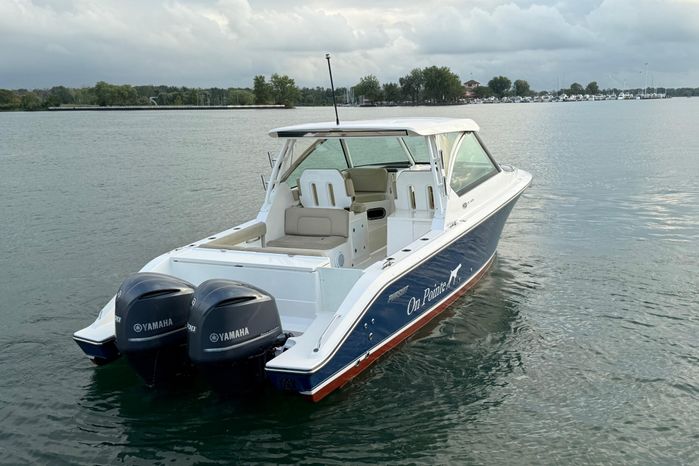 Freshwater / Great Lakes boat since new this vessel features twin Yamaha 300-hp Outboards with only 696-hours. Notable features include but are not limited to the following: Enclosed Head (Vacuflush) w/Vanity/Sink, Cabin w/ Lounging Area, Bow-Thruster, Windlass-Anchor w/Forward Pedal-Controls, Cockpit Wet Bar w/Sink/Drawer-Style Refrigerator/Kenyon Electric BBQ-Grill, Power Retractable Sunshade, Transom Live-Well, Complete Garmin NAV (12" MFD), Fusion Premium Sound-System, Inverter, Triple Axle Continental Aluminum I-Beam Trailer, and MUCH more!