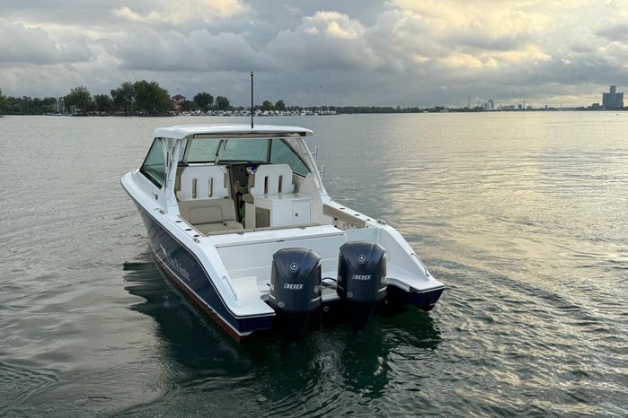 Freshwater / Great Lakes boat since new this vessel features twin Yamaha 300-hp Outboards with only 696-hours. Notable features include but are not limited to the following: Enclosed Head (Vacuflush) w/Vanity/Sink, Cabin w/ Lounging Area, Bow-Thruster, Windlass-Anchor w/Forward Pedal-Controls, Cockpit Wet Bar w/Sink/Drawer-Style Refrigerator/Kenyon Electric BBQ-Grill, Power Retractable Sunshade, Transom Live-Well, Complete Garmin NAV (12" MFD), Fusion Premium Sound-System, Inverter, Triple Axle Continental Aluminum I-Beam Trailer, and MUCH more!