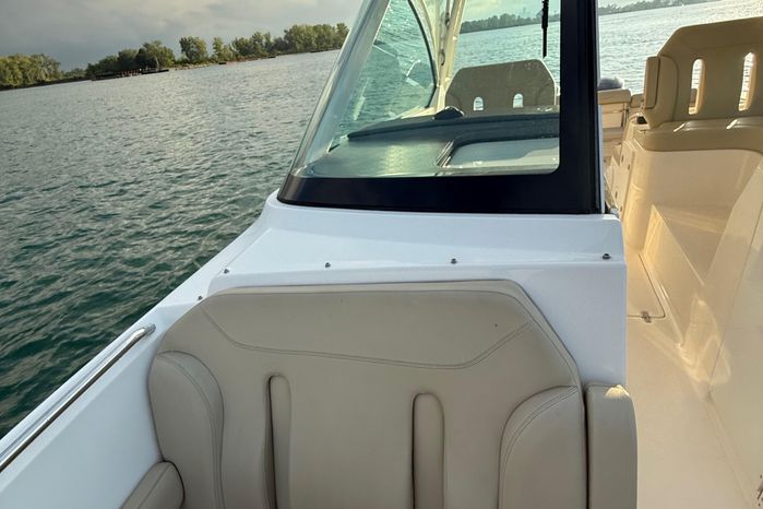 Freshwater / Great Lakes boat since new this vessel features twin Yamaha 300-hp Outboards with only 696-hours. Notable features include but are not limited to the following: Enclosed Head (Vacuflush) w/Vanity/Sink, Cabin w/ Lounging Area, Bow-Thruster, Windlass-Anchor w/Forward Pedal-Controls, Cockpit Wet Bar w/Sink/Drawer-Style Refrigerator/Kenyon Electric BBQ-Grill, Power Retractable Sunshade, Transom Live-Well, Complete Garmin NAV (12" MFD), Fusion Premium Sound-System, Inverter, Triple Axle Continental Aluminum I-Beam Trailer, and MUCH more!