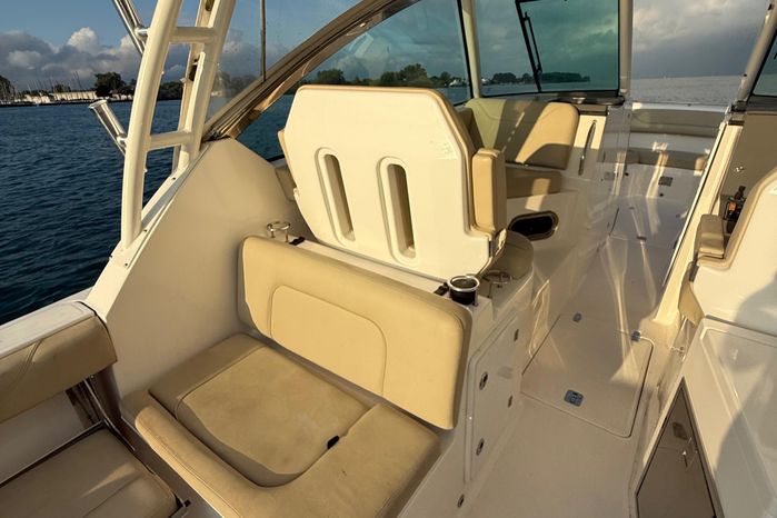 Freshwater / Great Lakes boat since new this vessel features twin Yamaha 300-hp Outboards with only 696-hours. Notable features include but are not limited to the following: Enclosed Head (Vacuflush) w/Vanity/Sink, Cabin w/ Lounging Area, Bow-Thruster, Windlass-Anchor w/Forward Pedal-Controls, Cockpit Wet Bar w/Sink/Drawer-Style Refrigerator/Kenyon Electric BBQ-Grill, Power Retractable Sunshade, Transom Live-Well, Complete Garmin NAV (12" MFD), Fusion Premium Sound-System, Inverter, Triple Axle Continental Aluminum I-Beam Trailer, and MUCH more!