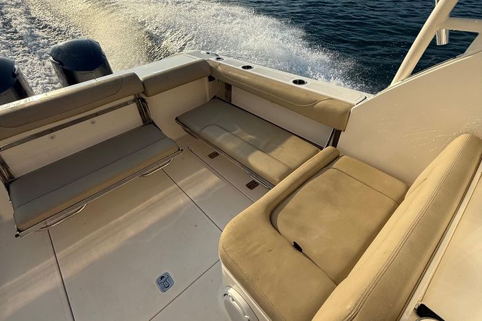 Freshwater / Great Lakes boat since new this vessel features twin Yamaha 300-hp Outboards with only 696-hours. Notable features include but are not limited to the following: Enclosed Head (Vacuflush) w/Vanity/Sink, Cabin w/ Lounging Area, Bow-Thruster, Windlass-Anchor w/Forward Pedal-Controls, Cockpit Wet Bar w/Sink/Drawer-Style Refrigerator/Kenyon Electric BBQ-Grill, Power Retractable Sunshade, Transom Live-Well, Complete Garmin NAV (12" MFD), Fusion Premium Sound-System, Inverter, Triple Axle Continental Aluminum I-Beam Trailer, and MUCH more!