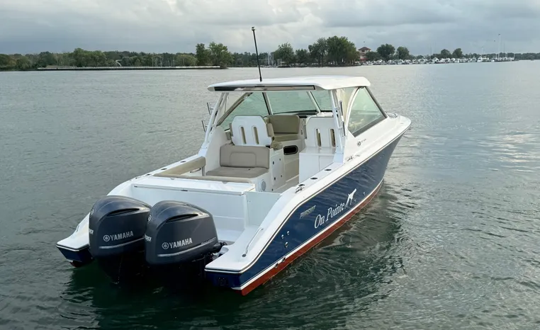 Freshwater / Great Lakes boat since new this vessel features twin Yamaha 300-hp Outboards with only 696-hours. Notable features include but are not limited to the following: Enclosed Head (Vacuflush) w/Vanity/Sink, Cabin w/ Lounging Area, Bow-Thruster, Windlass-Anchor w/Forward Pedal-Controls, Cockpit Wet Bar w/Sink/Drawer-Style Refrigerator/Kenyon Electric BBQ-Grill, Power Retractable Sunshade, Transom Live-Well, Complete Garmin NAV (12" MFD), Fusion Premium Sound-System, Inverter, Triple Axle Continental Aluminum I-Beam Trailer, and MUCH more!