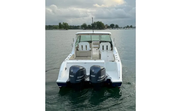 Freshwater / Great Lakes boat since new this vessel features twin Yamaha 300-hp Outboards with only 696-hours. Notable features include but are not limited to the following: Enclosed Head (Vacuflush) w/Vanity/Sink, Cabin w/ Lounging Area, Bow-Thruster, Windlass-Anchor w/Forward Pedal-Controls, Cockpit Wet Bar w/Sink/Drawer-Style Refrigerator/Kenyon Electric BBQ-Grill, Power Retractable Sunshade, Transom Live-Well, Complete Garmin NAV (12" MFD), Fusion Premium Sound-System, Inverter, Triple Axle Continental Aluminum I-Beam Trailer, and MUCH more!