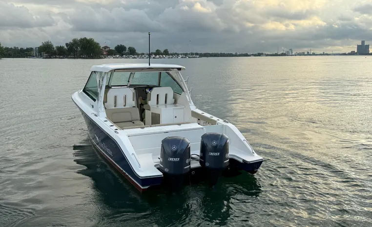 Freshwater / Great Lakes boat since new this vessel features twin Yamaha 300-hp Outboards with only 696-hours. Notable features include but are not limited to the following: Enclosed Head (Vacuflush) w/Vanity/Sink, Cabin w/ Lounging Area, Bow-Thruster, Windlass-Anchor w/Forward Pedal-Controls, Cockpit Wet Bar w/Sink/Drawer-Style Refrigerator/Kenyon Electric BBQ-Grill, Power Retractable Sunshade, Transom Live-Well, Complete Garmin NAV (12" MFD), Fusion Premium Sound-System, Inverter, Triple Axle Continental Aluminum I-Beam Trailer, and MUCH more!