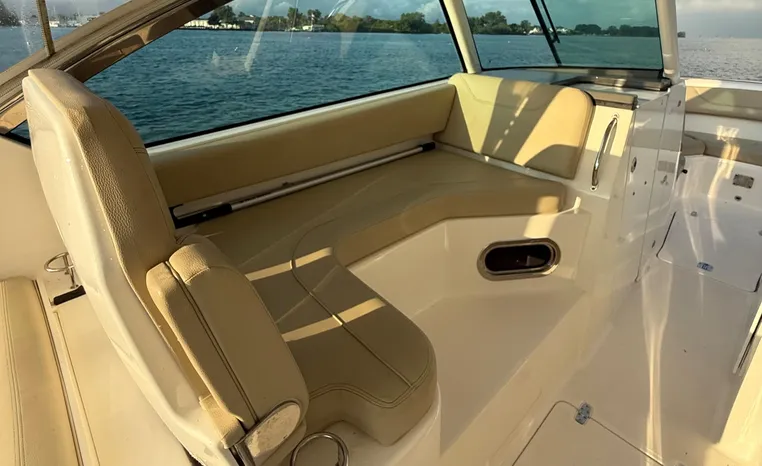 Freshwater / Great Lakes boat since new this vessel features twin Yamaha 300-hp Outboards with only 696-hours. Notable features include but are not limited to the following: Enclosed Head (Vacuflush) w/Vanity/Sink, Cabin w/ Lounging Area, Bow-Thruster, Windlass-Anchor w/Forward Pedal-Controls, Cockpit Wet Bar w/Sink/Drawer-Style Refrigerator/Kenyon Electric BBQ-Grill, Power Retractable Sunshade, Transom Live-Well, Complete Garmin NAV (12" MFD), Fusion Premium Sound-System, Inverter, Triple Axle Continental Aluminum I-Beam Trailer, and MUCH more!