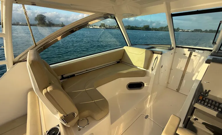 Freshwater / Great Lakes boat since new this vessel features twin Yamaha 300-hp Outboards with only 696-hours. Notable features include but are not limited to the following: Enclosed Head (Vacuflush) w/Vanity/Sink, Cabin w/ Lounging Area, Bow-Thruster, Windlass-Anchor w/Forward Pedal-Controls, Cockpit Wet Bar w/Sink/Drawer-Style Refrigerator/Kenyon Electric BBQ-Grill, Power Retractable Sunshade, Transom Live-Well, Complete Garmin NAV (12" MFD), Fusion Premium Sound-System, Inverter, Triple Axle Continental Aluminum I-Beam Trailer, and MUCH more!