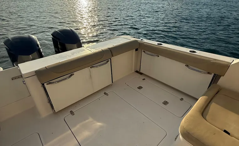 Freshwater / Great Lakes boat since new this vessel features twin Yamaha 300-hp Outboards with only 696-hours. Notable features include but are not limited to the following: Enclosed Head (Vacuflush) w/Vanity/Sink, Cabin w/ Lounging Area, Bow-Thruster, Windlass-Anchor w/Forward Pedal-Controls, Cockpit Wet Bar w/Sink/Drawer-Style Refrigerator/Kenyon Electric BBQ-Grill, Power Retractable Sunshade, Transom Live-Well, Complete Garmin NAV (12" MFD), Fusion Premium Sound-System, Inverter, Triple Axle Continental Aluminum I-Beam Trailer, and MUCH more!