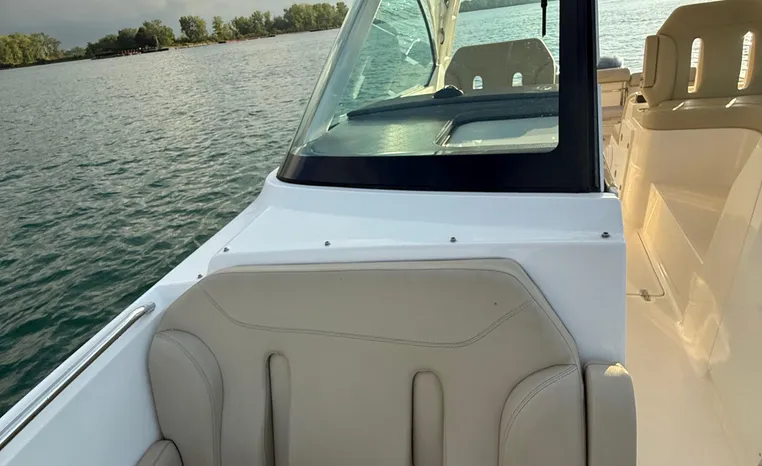 Freshwater / Great Lakes boat since new this vessel features twin Yamaha 300-hp Outboards with only 696-hours. Notable features include but are not limited to the following: Enclosed Head (Vacuflush) w/Vanity/Sink, Cabin w/ Lounging Area, Bow-Thruster, Windlass-Anchor w/Forward Pedal-Controls, Cockpit Wet Bar w/Sink/Drawer-Style Refrigerator/Kenyon Electric BBQ-Grill, Power Retractable Sunshade, Transom Live-Well, Complete Garmin NAV (12" MFD), Fusion Premium Sound-System, Inverter, Triple Axle Continental Aluminum I-Beam Trailer, and MUCH more!