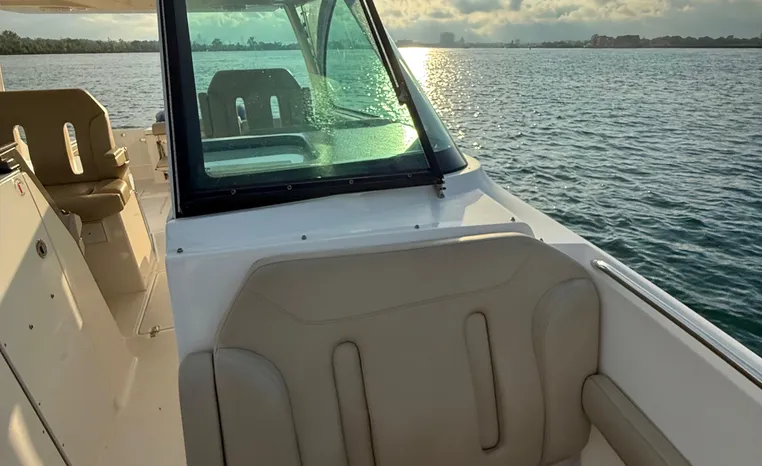 Freshwater / Great Lakes boat since new this vessel features twin Yamaha 300-hp Outboards with only 696-hours. Notable features include but are not limited to the following: Enclosed Head (Vacuflush) w/Vanity/Sink, Cabin w/ Lounging Area, Bow-Thruster, Windlass-Anchor w/Forward Pedal-Controls, Cockpit Wet Bar w/Sink/Drawer-Style Refrigerator/Kenyon Electric BBQ-Grill, Power Retractable Sunshade, Transom Live-Well, Complete Garmin NAV (12" MFD), Fusion Premium Sound-System, Inverter, Triple Axle Continental Aluminum I-Beam Trailer, and MUCH more!