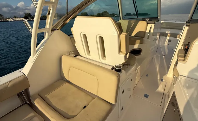 Freshwater / Great Lakes boat since new this vessel features twin Yamaha 300-hp Outboards with only 696-hours. Notable features include but are not limited to the following: Enclosed Head (Vacuflush) w/Vanity/Sink, Cabin w/ Lounging Area, Bow-Thruster, Windlass-Anchor w/Forward Pedal-Controls, Cockpit Wet Bar w/Sink/Drawer-Style Refrigerator/Kenyon Electric BBQ-Grill, Power Retractable Sunshade, Transom Live-Well, Complete Garmin NAV (12" MFD), Fusion Premium Sound-System, Inverter, Triple Axle Continental Aluminum I-Beam Trailer, and MUCH more!