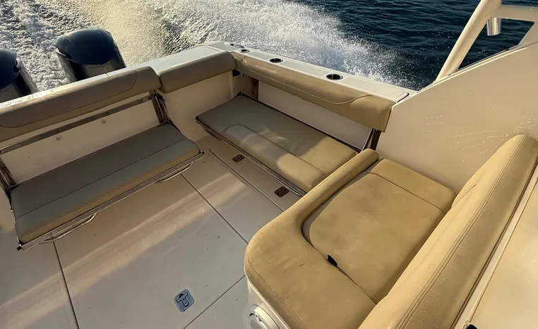 Freshwater / Great Lakes boat since new this vessel features twin Yamaha 300-hp Outboards with only 696-hours. Notable features include but are not limited to the following: Enclosed Head (Vacuflush) w/Vanity/Sink, Cabin w/ Lounging Area, Bow-Thruster, Windlass-Anchor w/Forward Pedal-Controls, Cockpit Wet Bar w/Sink/Drawer-Style Refrigerator/Kenyon Electric BBQ-Grill, Power Retractable Sunshade, Transom Live-Well, Complete Garmin NAV (12" MFD), Fusion Premium Sound-System, Inverter, Triple Axle Continental Aluminum I-Beam Trailer, and MUCH more!