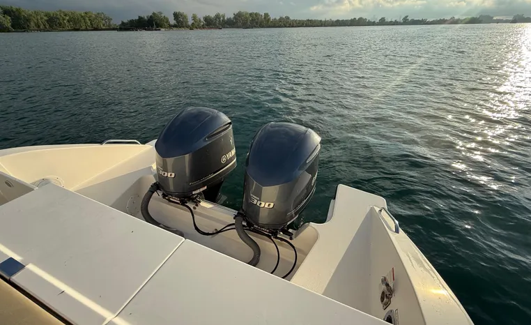 Freshwater / Great Lakes boat since new this vessel features twin Yamaha 300-hp Outboards with only 696-hours. Notable features include but are not limited to the following: Enclosed Head (Vacuflush) w/Vanity/Sink, Cabin w/ Lounging Area, Bow-Thruster, Windlass-Anchor w/Forward Pedal-Controls, Cockpit Wet Bar w/Sink/Drawer-Style Refrigerator/Kenyon Electric BBQ-Grill, Power Retractable Sunshade, Transom Live-Well, Complete Garmin NAV (12" MFD), Fusion Premium Sound-System, Inverter, Triple Axle Continental Aluminum I-Beam Trailer, and MUCH more!