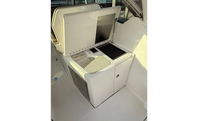 Freshwater / Great Lakes boat since new this vessel features twin Yamaha 300-hp Outboards with only 696-hours. Notable features include but are not limited to the following: Enclosed Head (Vacuflush) w/Vanity/Sink, Cabin w/ Lounging Area, Bow-Thruster, Windlass-Anchor w/Forward Pedal-Controls, Cockpit Wet Bar w/Sink/Drawer-Style Refrigerator/Kenyon Electric BBQ-Grill, Power Retractable Sunshade, Transom Live-Well, Complete Garmin NAV (12" MFD), Fusion Premium Sound-System, Inverter, Triple Axle Continental Aluminum I-Beam Trailer, and MUCH more!