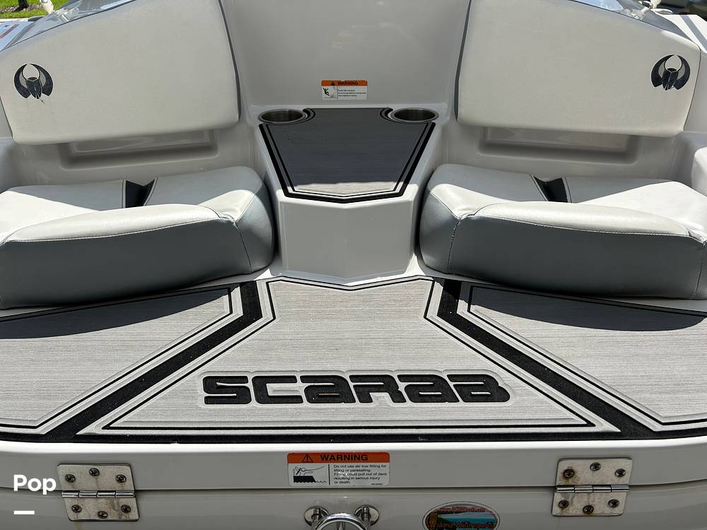 The helm houses a depth sounder, emergency engine shut-off, lighted switches, an outlet, 12V, the Scarab custom gauge cluster, VHF, Infinity stereo system, and storage beneath the helm. AFT is a swim platform, an extended low-profile swim platform, a reboarding ladder, and a ski tow.