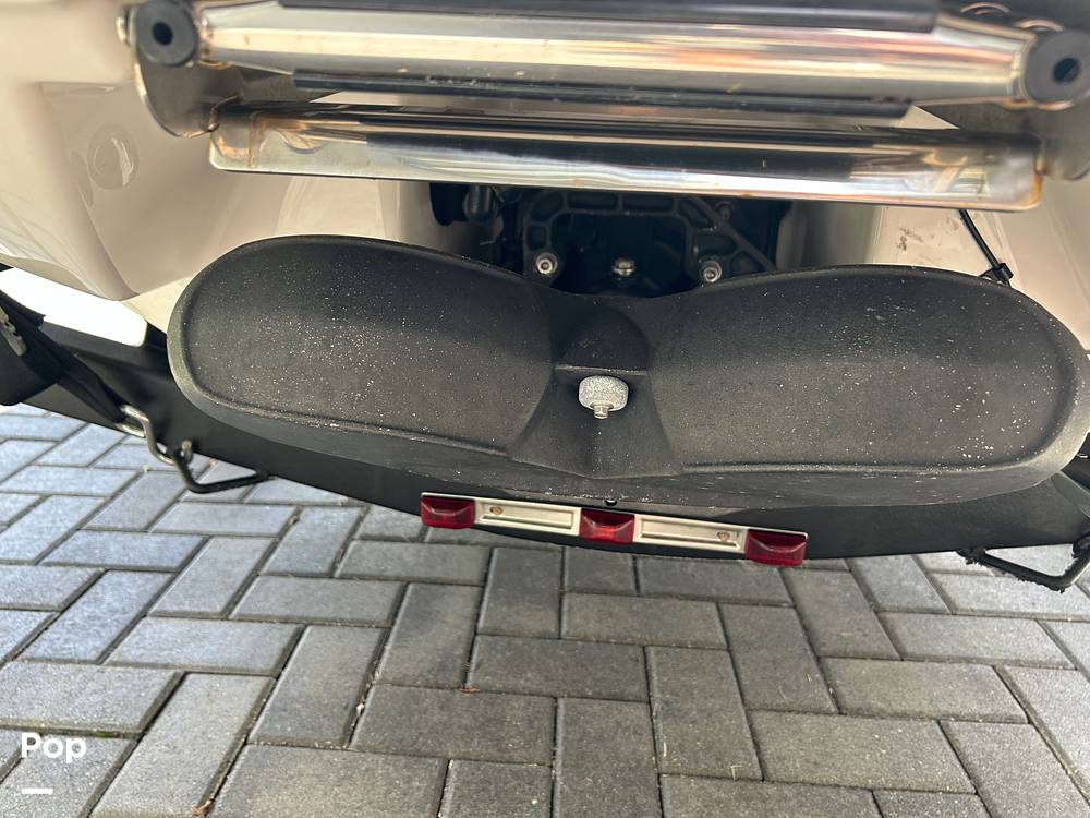 The cockpit has a ski locker, in-floor, molded fiberglass finish. More storage, bow & cockpit, beneath seats. Has a walk-thru, stern storage, beneath the motor hood. The sale comes with a Scarab single-axle trailer.