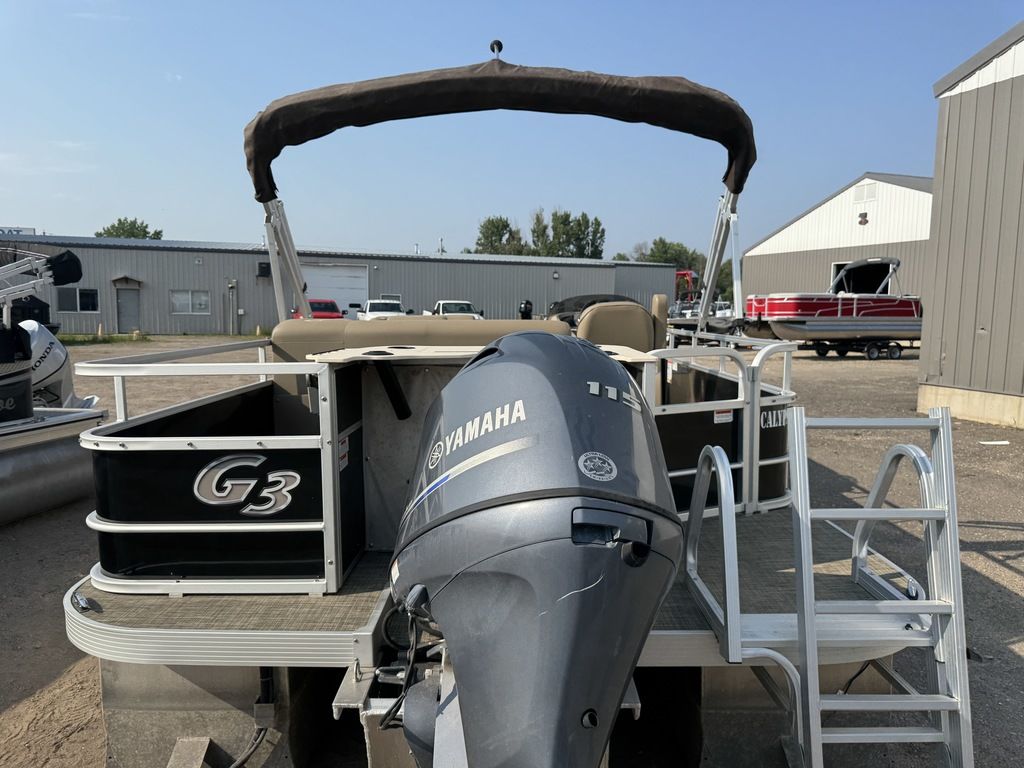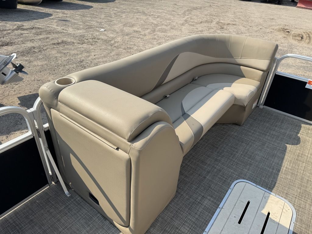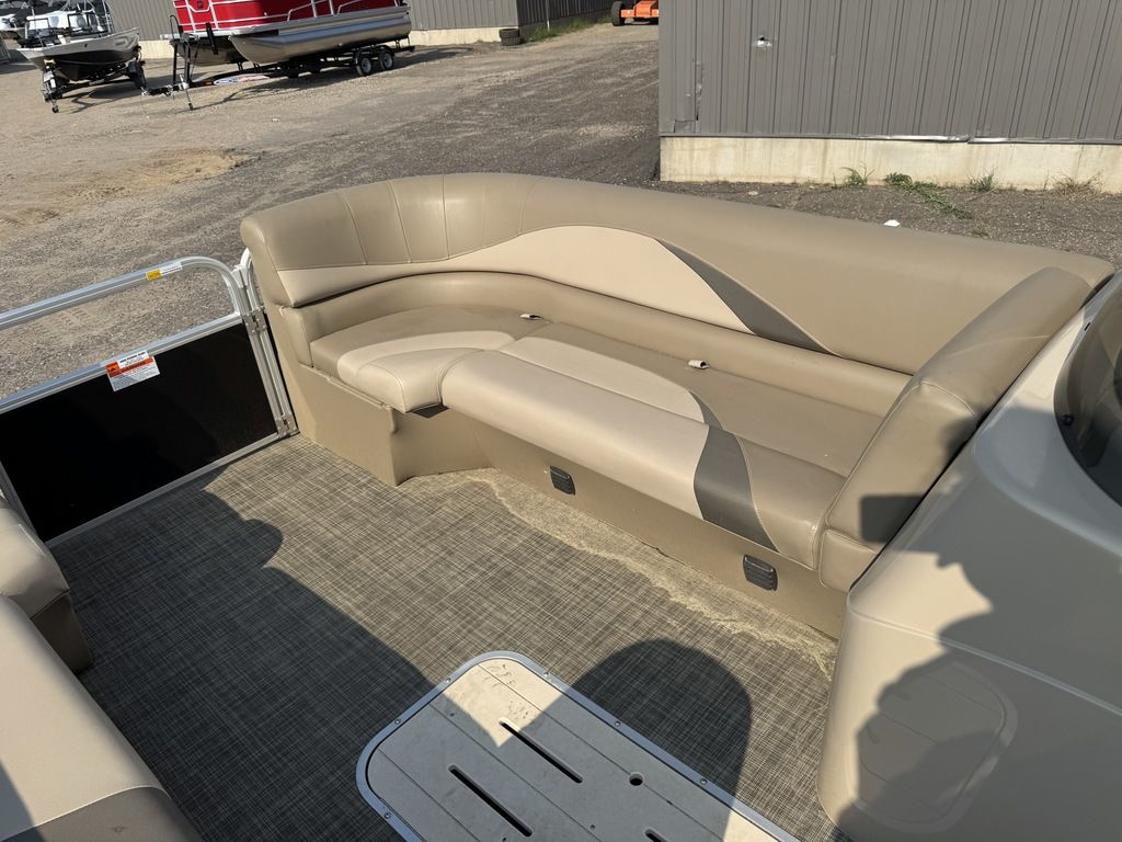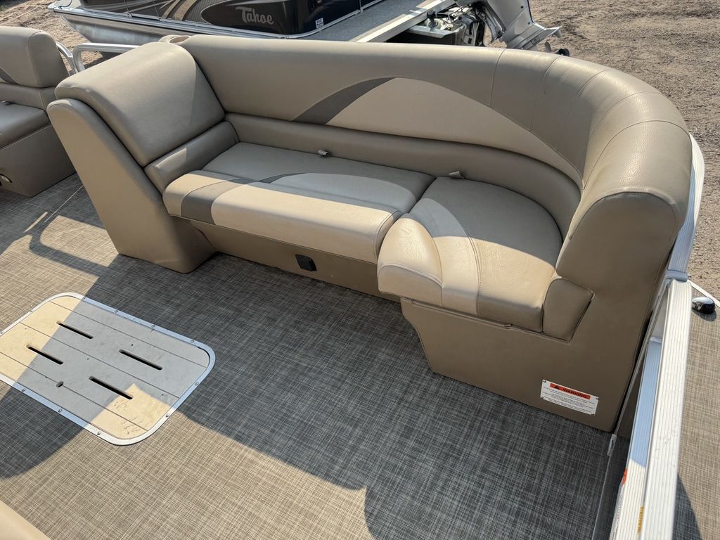 Outboard. This tritoon with rear fishing layout features 2 lounge style couches