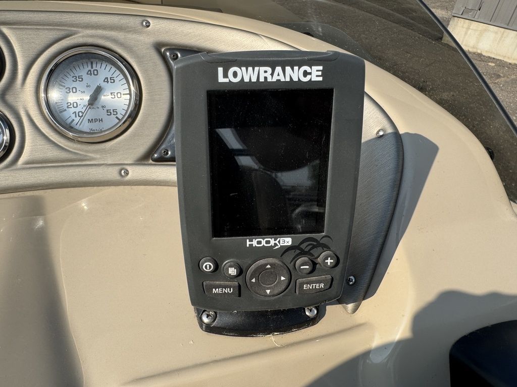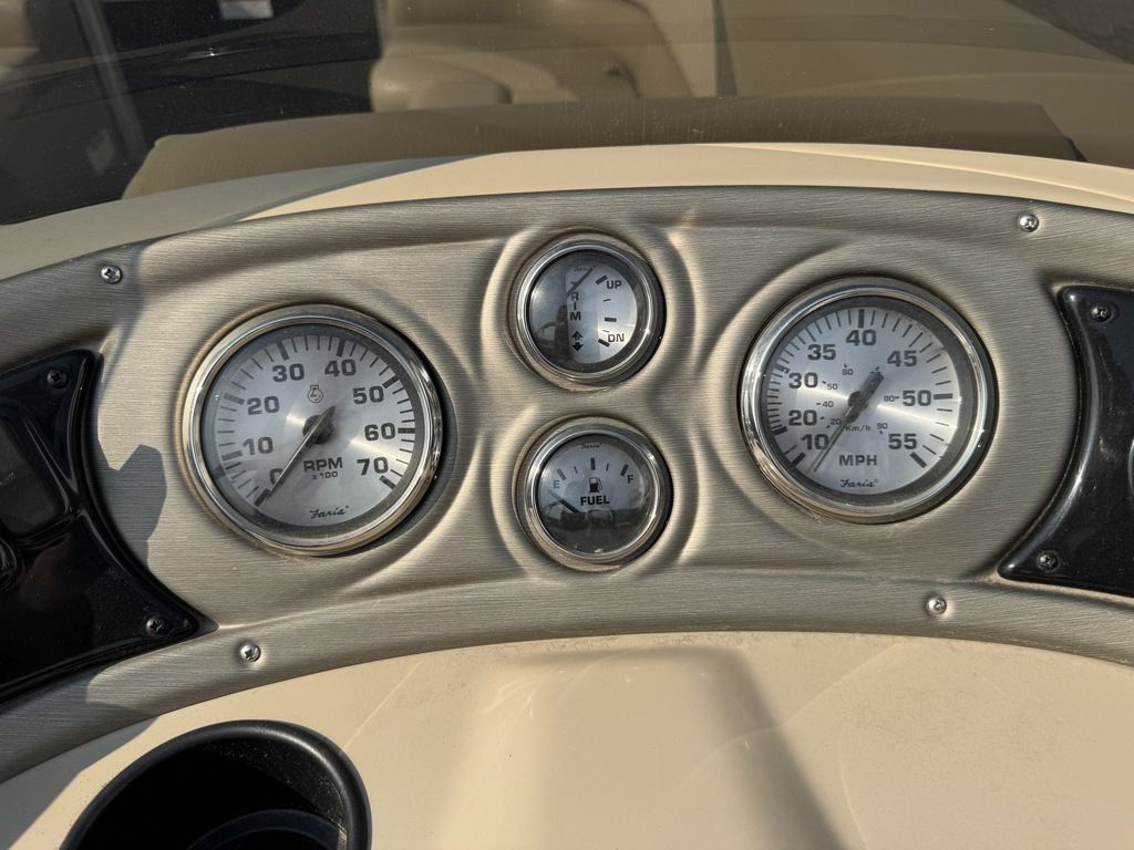 Tachometer, Speedometer, Fuel and Trim gauge. There is a Lowrance fish/depth