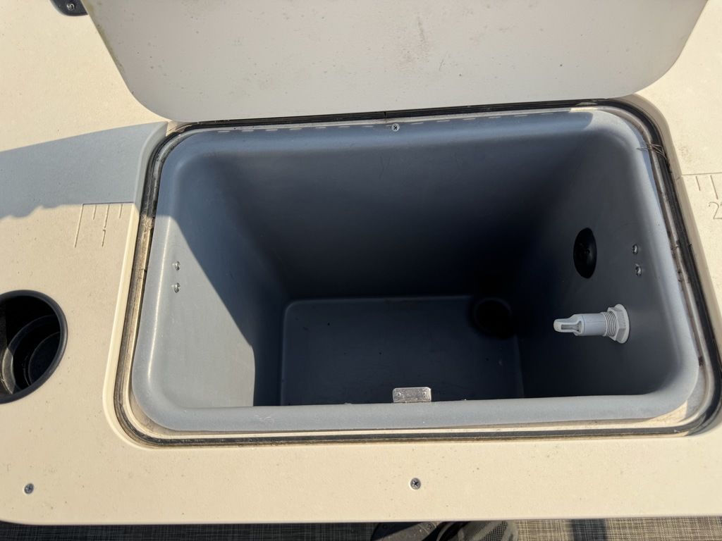 the rear. There is a livewell console between the 2 fishing seats with 2 cup