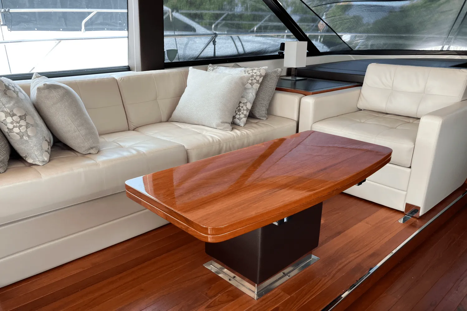 water access a breeze. This vessel is equipped with. an All Chain Windlass, Engine Room and Cockpit Cameras, and a SAT TV system to ensure you cruise in safety, comfort,and luxury. Inside, the salon offers an open layout, premium finishes, and panoramic views that bring tbe outside in. Whether you're enjoying weekends on tbe water or planning extended getaways, this Tiara is turnkey-ready