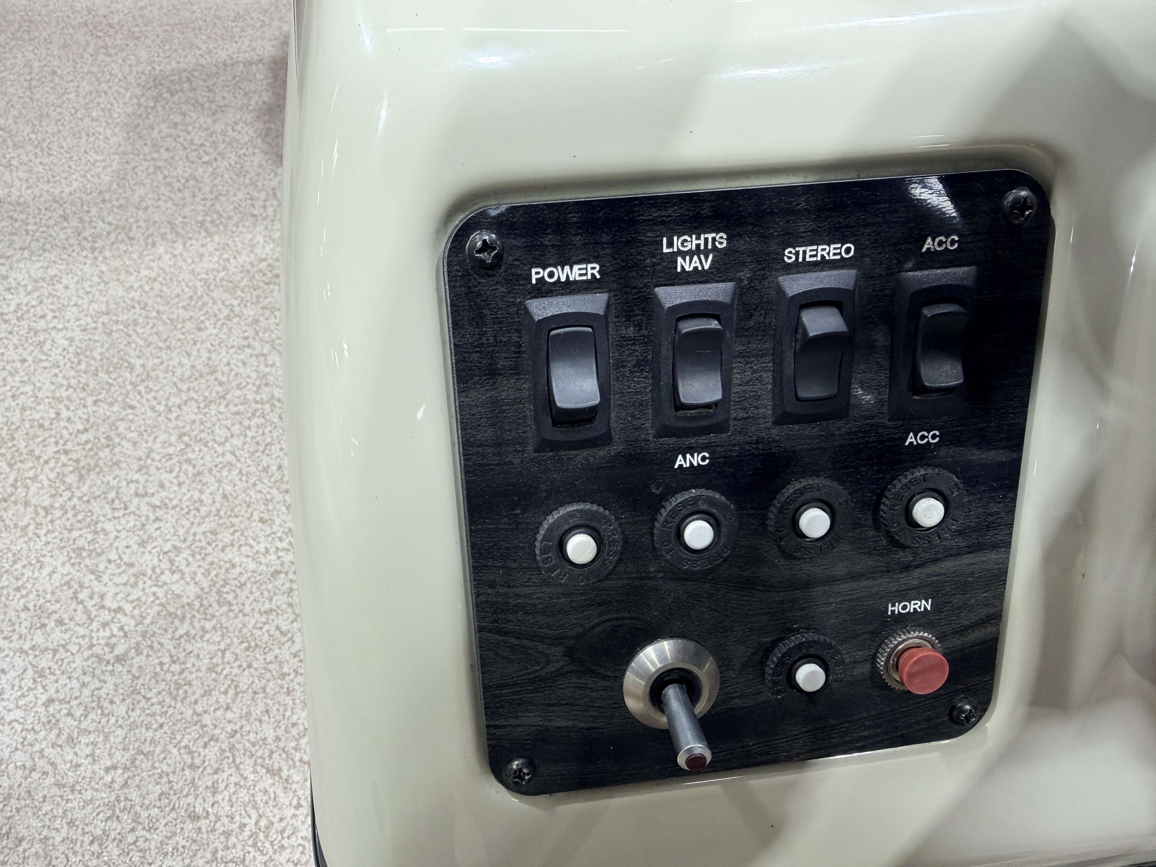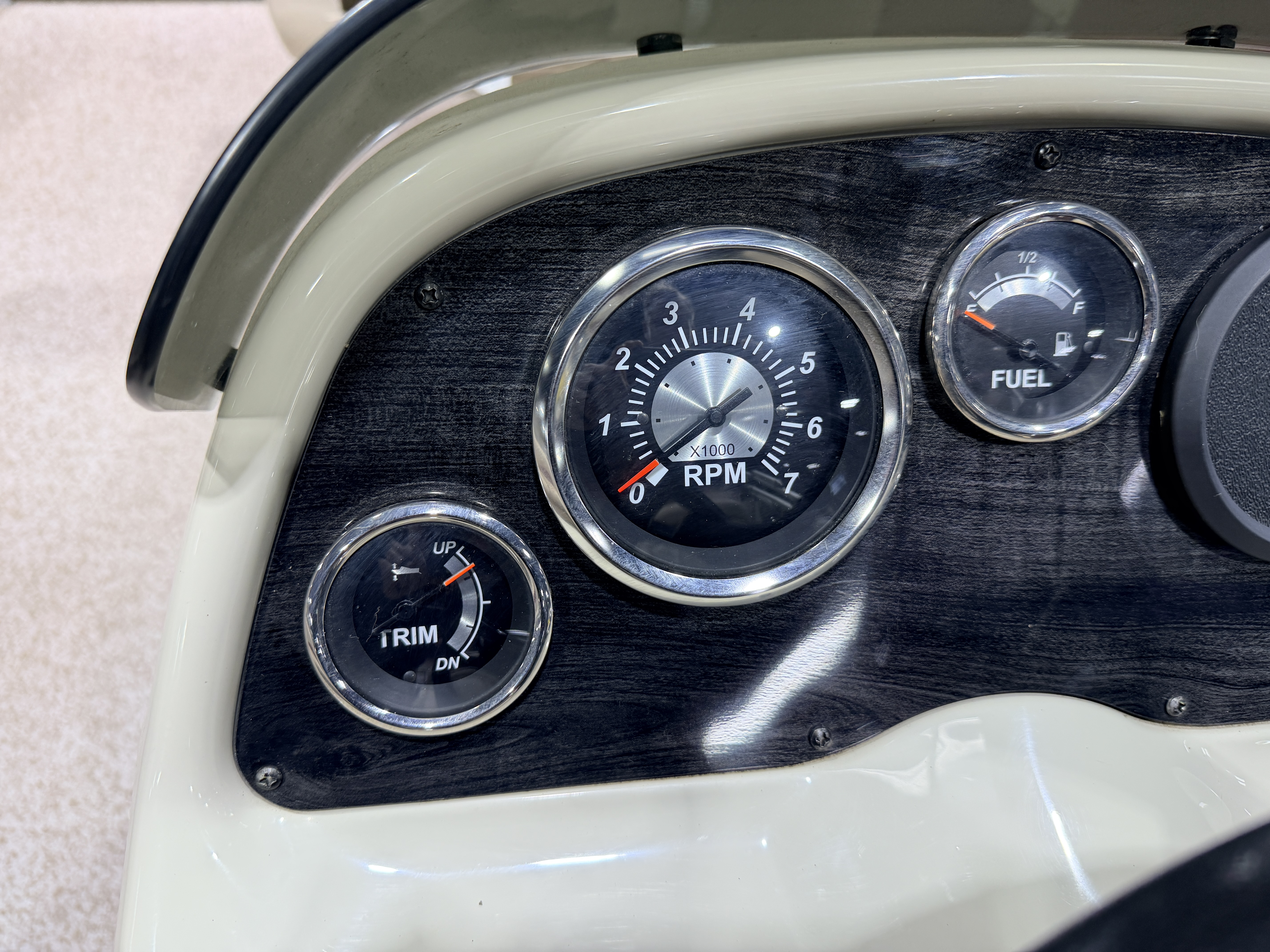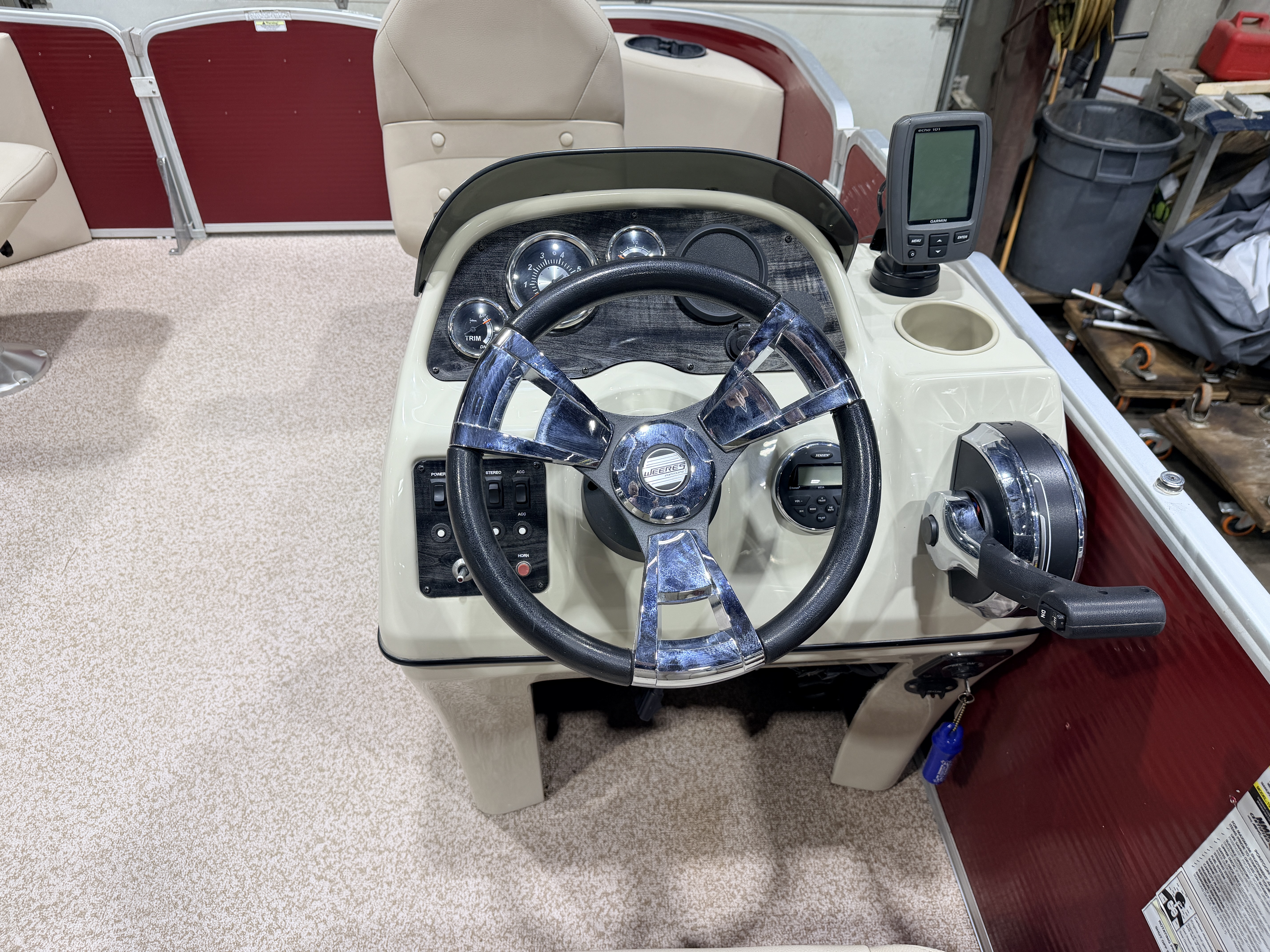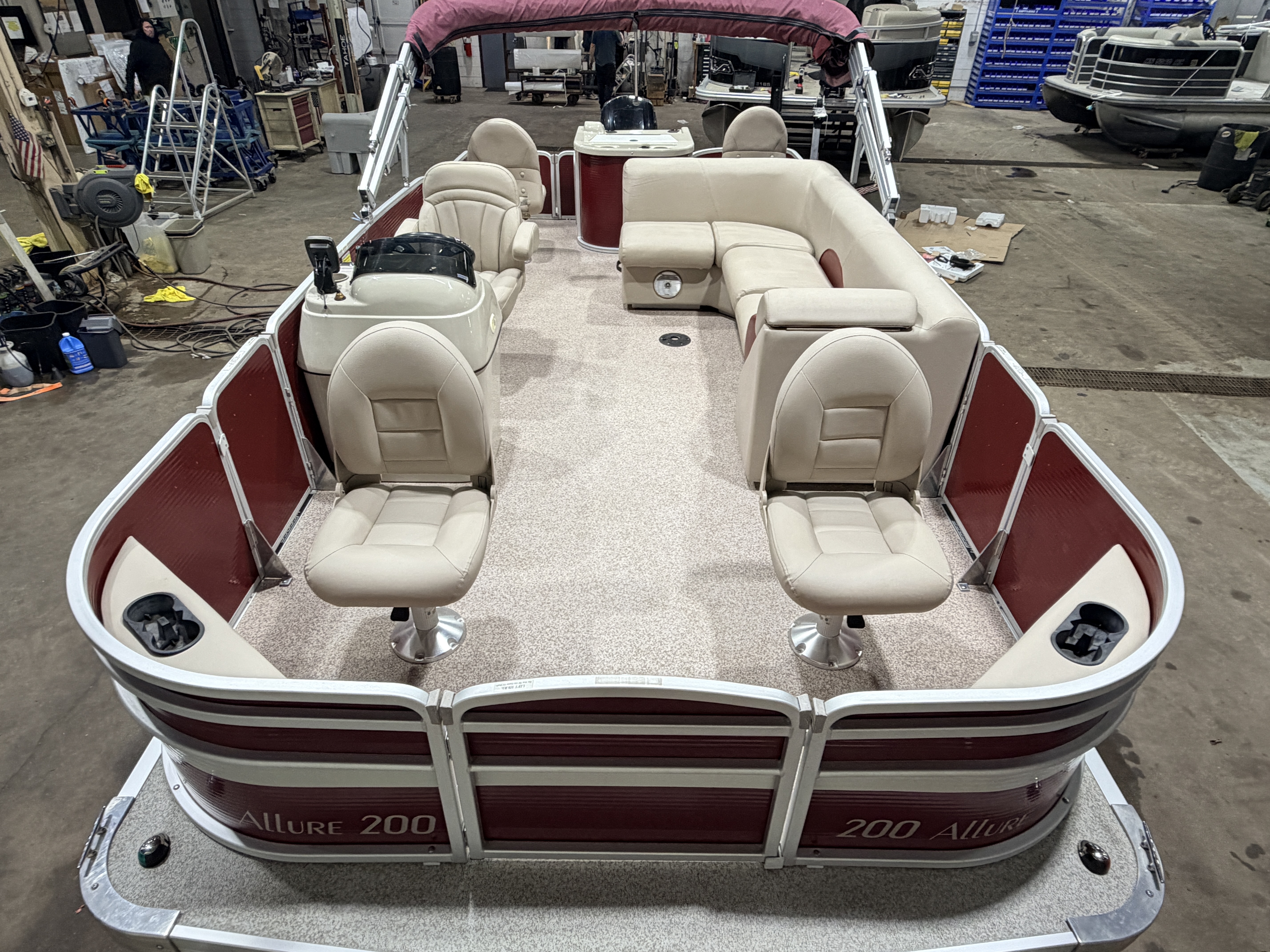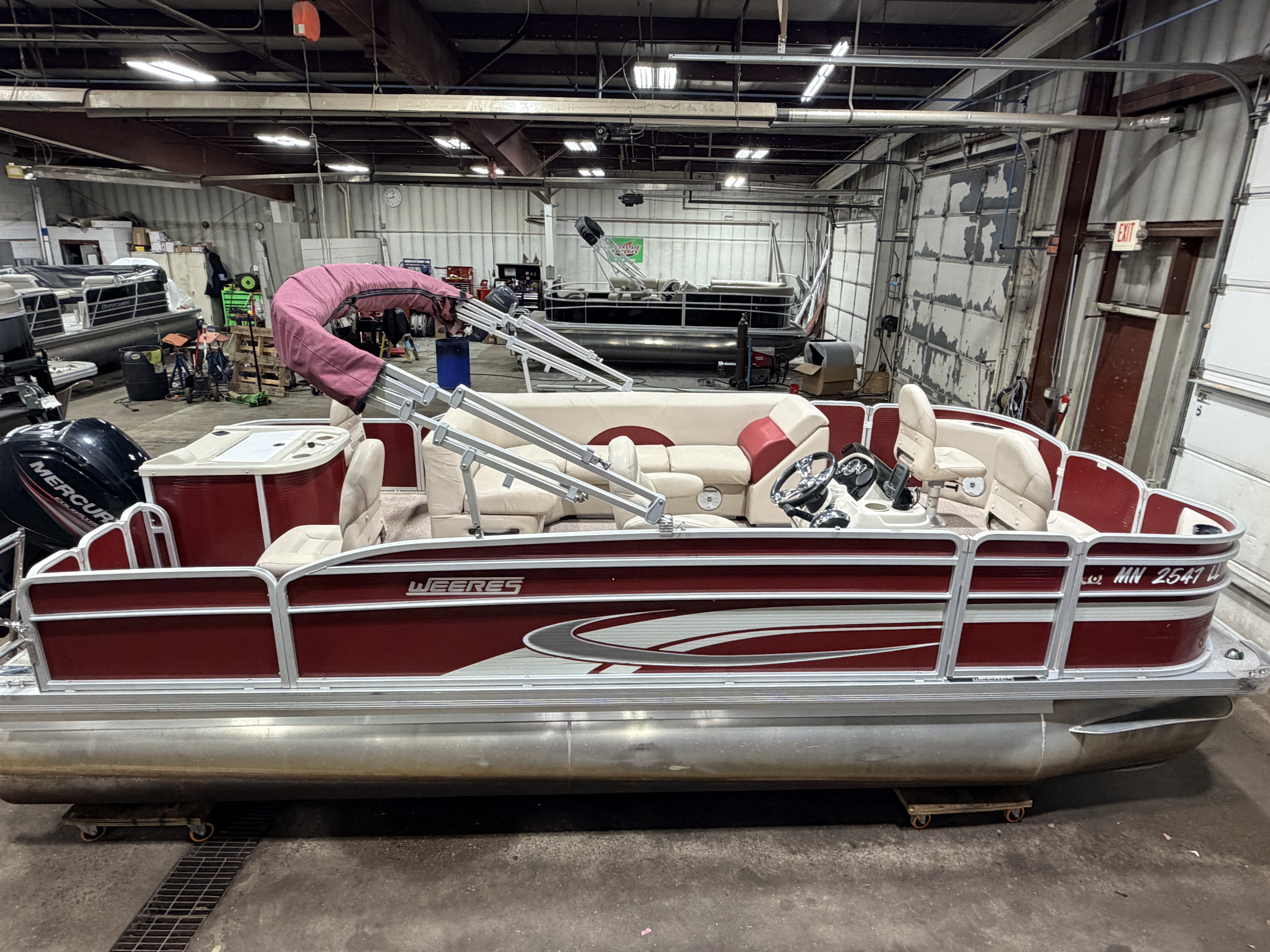 2016 Weeres 200 Allure Fish Pontoon with 90HP Mercury Command Thrust Fourstroke EFI Outboard. This fishing pontoon features 4 fishing seats; 1 in each corner of the pontoon. The front pair of fishing seats, each have a mini console in the corner with a double cup holder and a stereo speaker. The helm features a Tachometer, Fuel and Trim gauge. There is a Garmin echo 101 GPS depth/fish finder mounted on top of the helm. There is a Jensen MS3A Bluetooth audio stereo system. There is a courtesy light mounted on the side of the helm. On the port side is an L-shaped couch with table and storage space underneath the seat cushions and under the lounge backrest. The rear pair of fishing seats have a large console between them with a livewell and 2 cup holders as well as 2 rod holders and an item tray. There are fishing rod storage brackets attached to the starboard fence rail behind the captain's chair. This pontoon has 4 entry gates; 1 in front, 1 on each side behind the fishing seat, and a fourth gate at the stern which leads to a stainless steel fold down swim ladder.