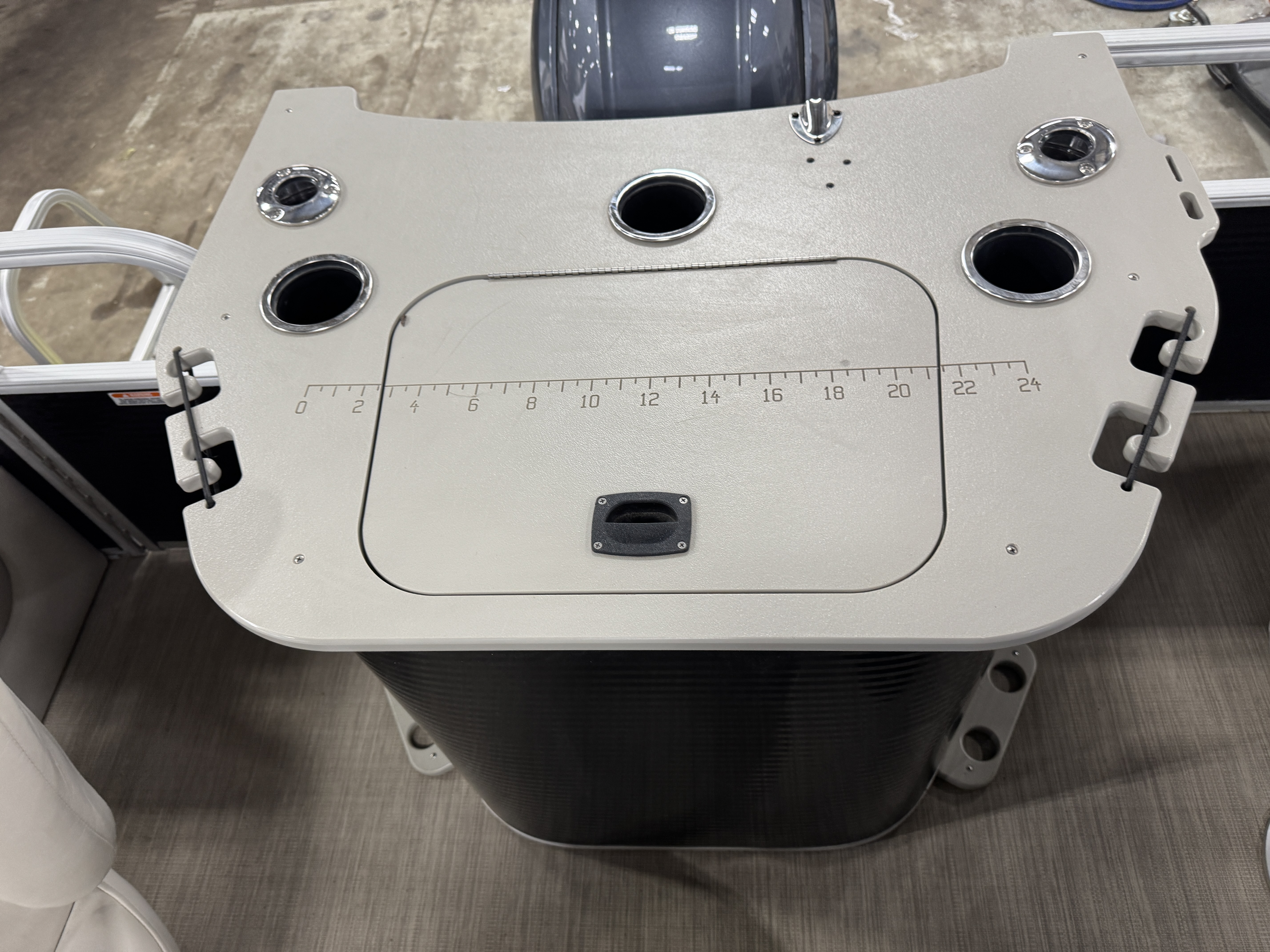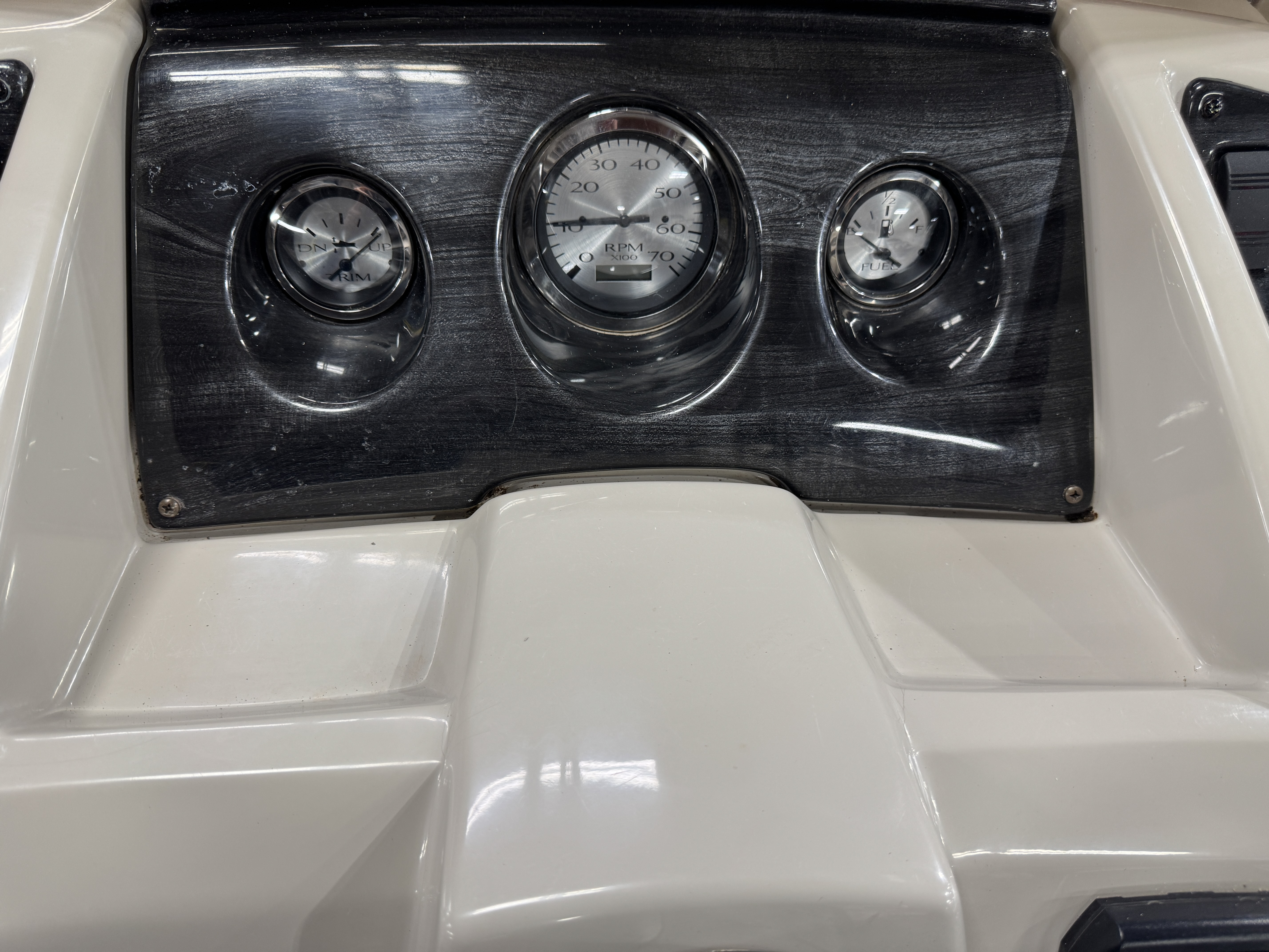cup holders and a stereo speaker. The helm features a Tachometer, Fuel and Trim