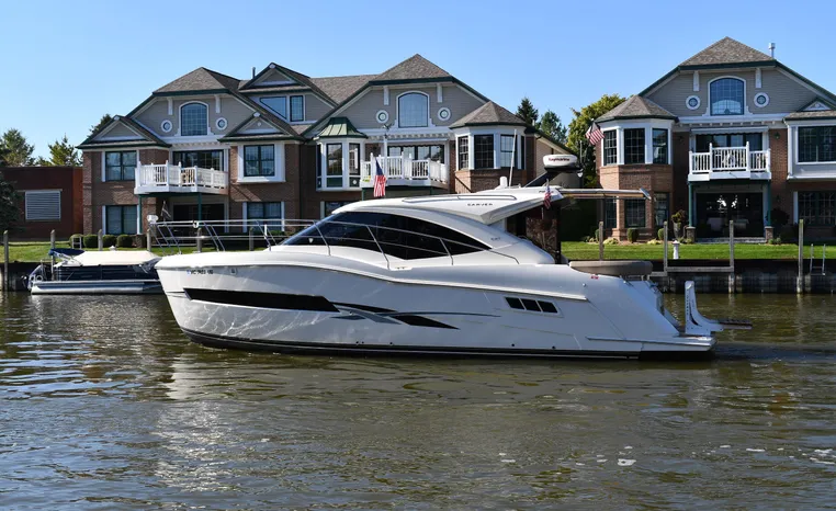 Freshwater / Great Lakes boat since new this vessel features Twin Mercruiser 6.2-litre 350-hp Gas Engines (only 391 original hours) and Mercruiser SeaCore Outdrives! Docking is a Breeze, Thanks to the Dockmate Hand-Held Joystick Remote Control, Which Allows Operation From Anywhere on the Boat, Mercury Joystick w/Skyhook Turns the Boat on a Dime and Holds it in Position When Needed. Notable features include but are not limited to the following: Air-Conditioning & Heat (2-Units, w/Remote Control), (1) Head (Vacuflush) w/Vanity/Sink/Stall Shower, Central Vacuum System, Kohler 7.5kw Generator (63 hours), Windlass Anchor w/All Chain Anchor Rode and NEW Stainless Anchor, Complete Electronics Package (Raymarine 260 Color Touchscreen Radar/Charplotter and Rear-Facing Camera, Raymarine Autopilot, Mercury Vessel View Engine Monitor and Multi-Function Display, Raymarine VHF Marine Radio w/External Speaker and Little Giant Antenna), WiFi through Vessel, Rockford Fosgate Integrated Bluetooth Stereo System w/Sirius & Pandora Radio, (3) Updated Flat-Screen TV's, Power Sunroof with Shade and Screen, Large Refrigerator/Freezer in Salon, Two Smaller Refrigerators in Cockpit Area, Microwave and Electric Cook Stove.