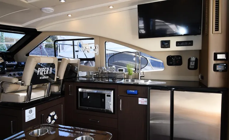 Freshwater / Great Lakes boat since new this vessel features Twin Mercruiser 6.2-litre 350-hp Gas Engines (only 391 original hours) and Mercruiser SeaCore Outdrives! Docking is a Breeze, Thanks to the Dockmate Hand-Held Joystick Remote Control, Which Allows Operation From Anywhere on the Boat, Mercury Joystick w/Skyhook Turns the Boat on a Dime and Holds it in Position When Needed. Notable features include but are not limited to the following: Air-Conditioning & Heat (2-Units, w/Remote Control), (1) Head (Vacuflush) w/Vanity/Sink/Stall Shower, Central Vacuum System, Kohler 7.5kw Generator (63 hours), Windlass Anchor w/All Chain Anchor Rode and NEW Stainless Anchor, Complete Electronics Package (Raymarine 260 Color Touchscreen Radar/Charplotter and Rear-Facing Camera, Raymarine Autopilot, Mercury Vessel View Engine Monitor and Multi-Function Display, Raymarine VHF Marine Radio w/External Speaker and Little Giant Antenna), WiFi through Vessel, Rockford Fosgate Integrated Bluetooth Stereo System w/Sirius & Pandora Radio, (3) Updated Flat-Screen TV's, Power Sunroof with Shade and Screen, Large Refrigerator/Freezer in Salon, Two Smaller Refrigerators in Cockpit Area, Microwave and Electric Cook Stove.