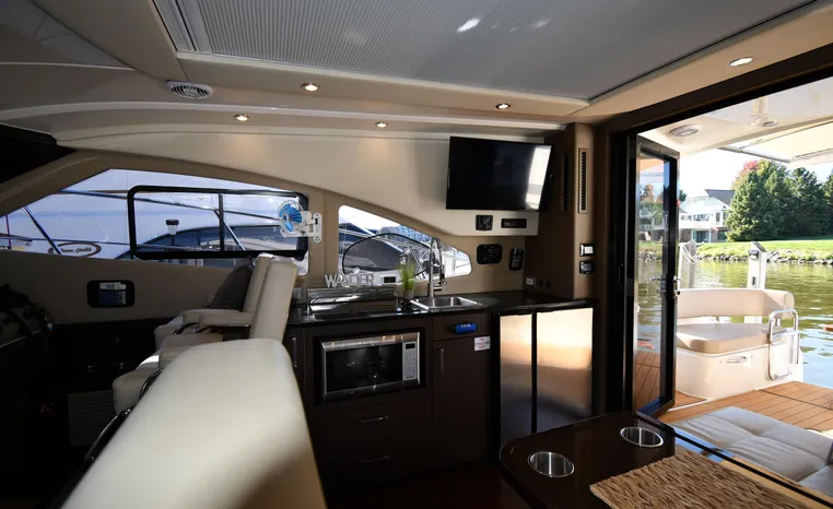 Freshwater / Great Lakes boat since new this vessel features Twin Mercruiser 6.2-litre 350-hp Gas Engines (only 391 original hours) and Mercruiser SeaCore Outdrives! Docking is a Breeze, Thanks to the Dockmate Hand-Held Joystick Remote Control, Which Allows Operation From Anywhere on the Boat, Mercury Joystick w/Skyhook Turns the Boat on a Dime and Holds it in Position When Needed. Notable features include but are not limited to the following: Air-Conditioning & Heat (2-Units, w/Remote Control), (1) Head (Vacuflush) w/Vanity/Sink/Stall Shower, Central Vacuum System, Kohler 7.5kw Generator (63 hours), Windlass Anchor w/All Chain Anchor Rode and NEW Stainless Anchor, Complete Electronics Package (Raymarine 260 Color Touchscreen Radar/Charplotter and Rear-Facing Camera, Raymarine Autopilot, Mercury Vessel View Engine Monitor and Multi-Function Display, Raymarine VHF Marine Radio w/External Speaker and Little Giant Antenna), WiFi through Vessel, Rockford Fosgate Integrated Bluetooth Stereo System w/Sirius & Pandora Radio, (3) Updated Flat-Screen TV's, Power Sunroof with Shade and Screen, Large Refrigerator/Freezer in Salon, Two Smaller Refrigerators in Cockpit Area, Microwave and Electric Cook Stove.