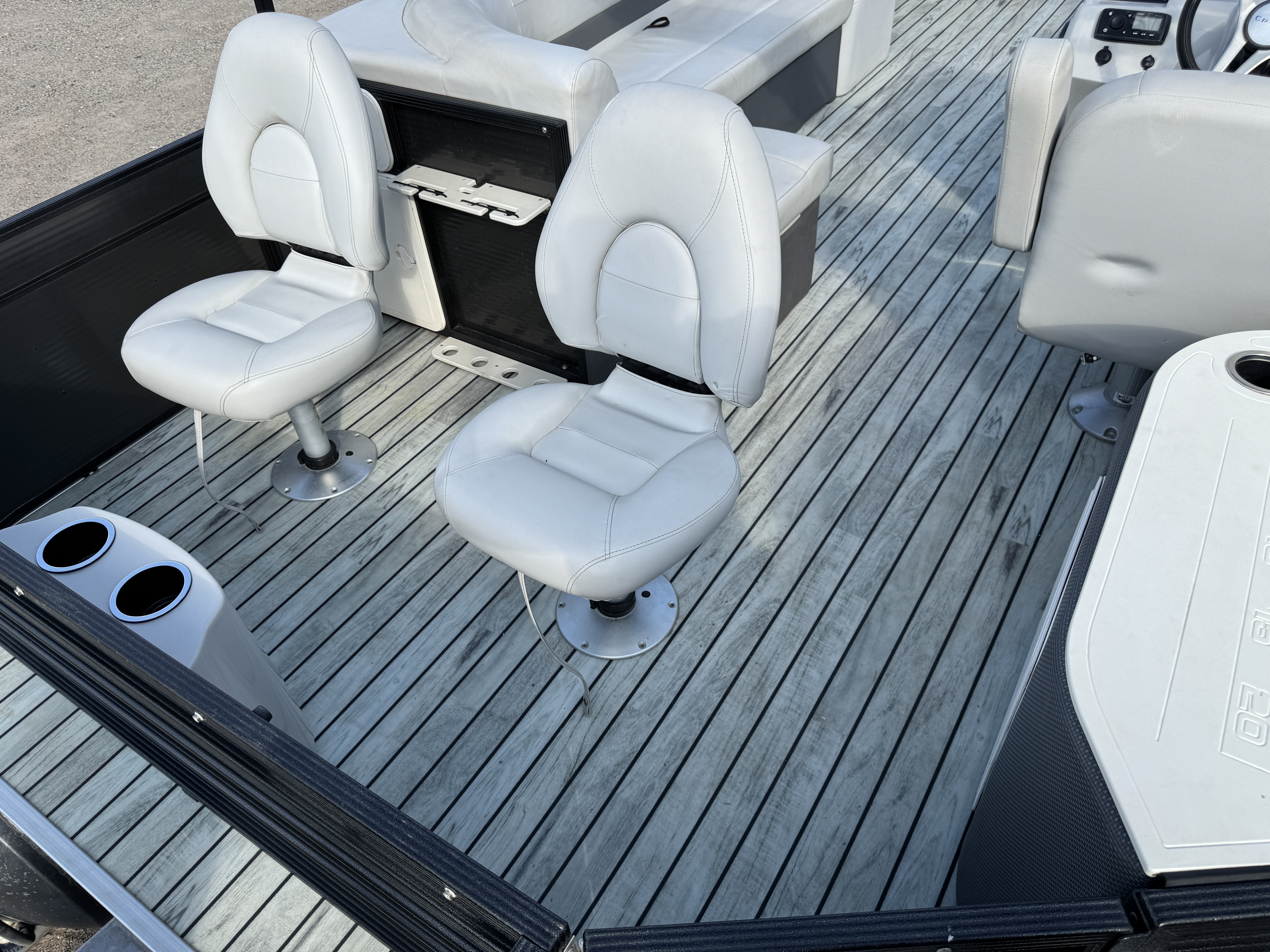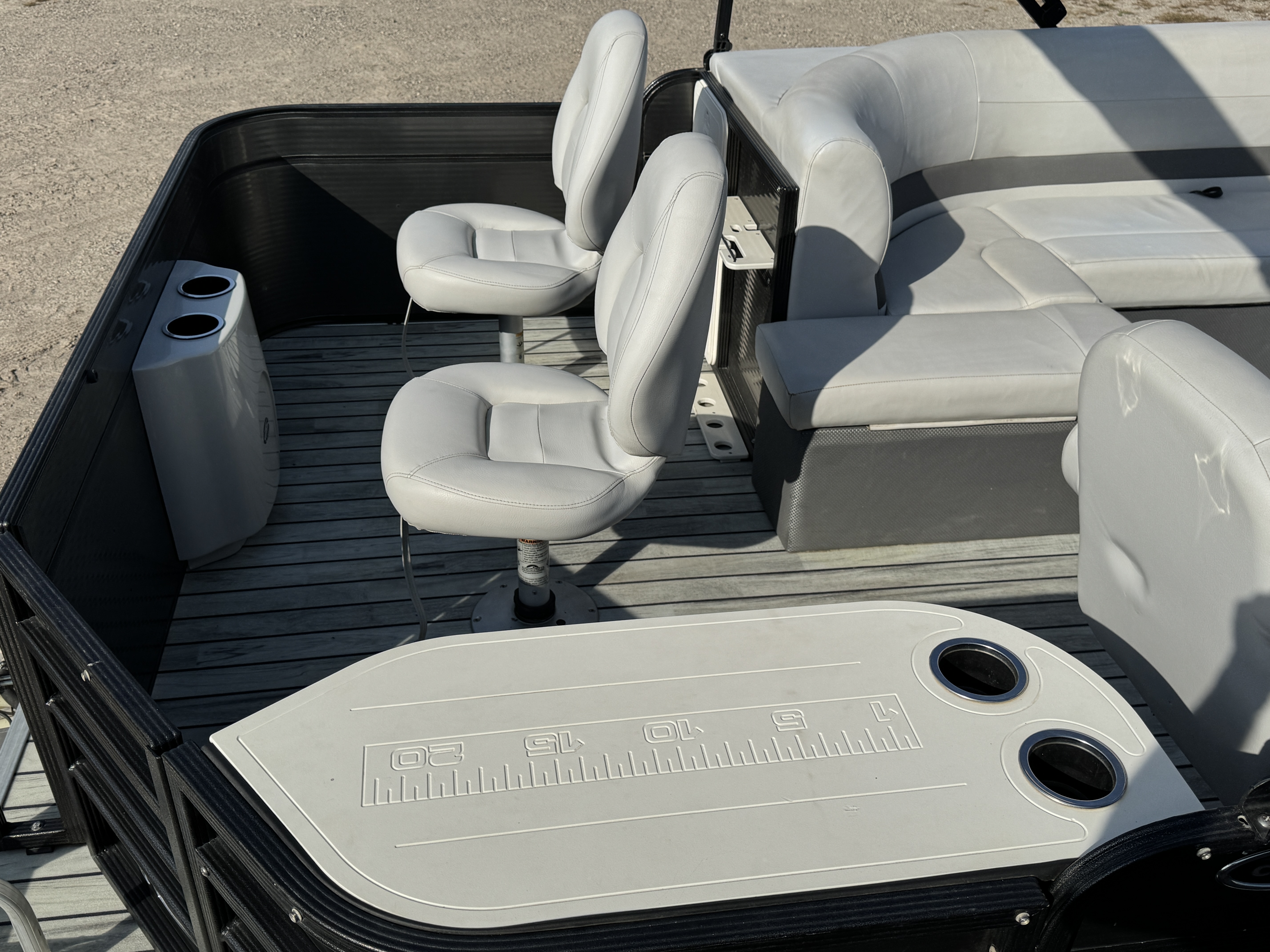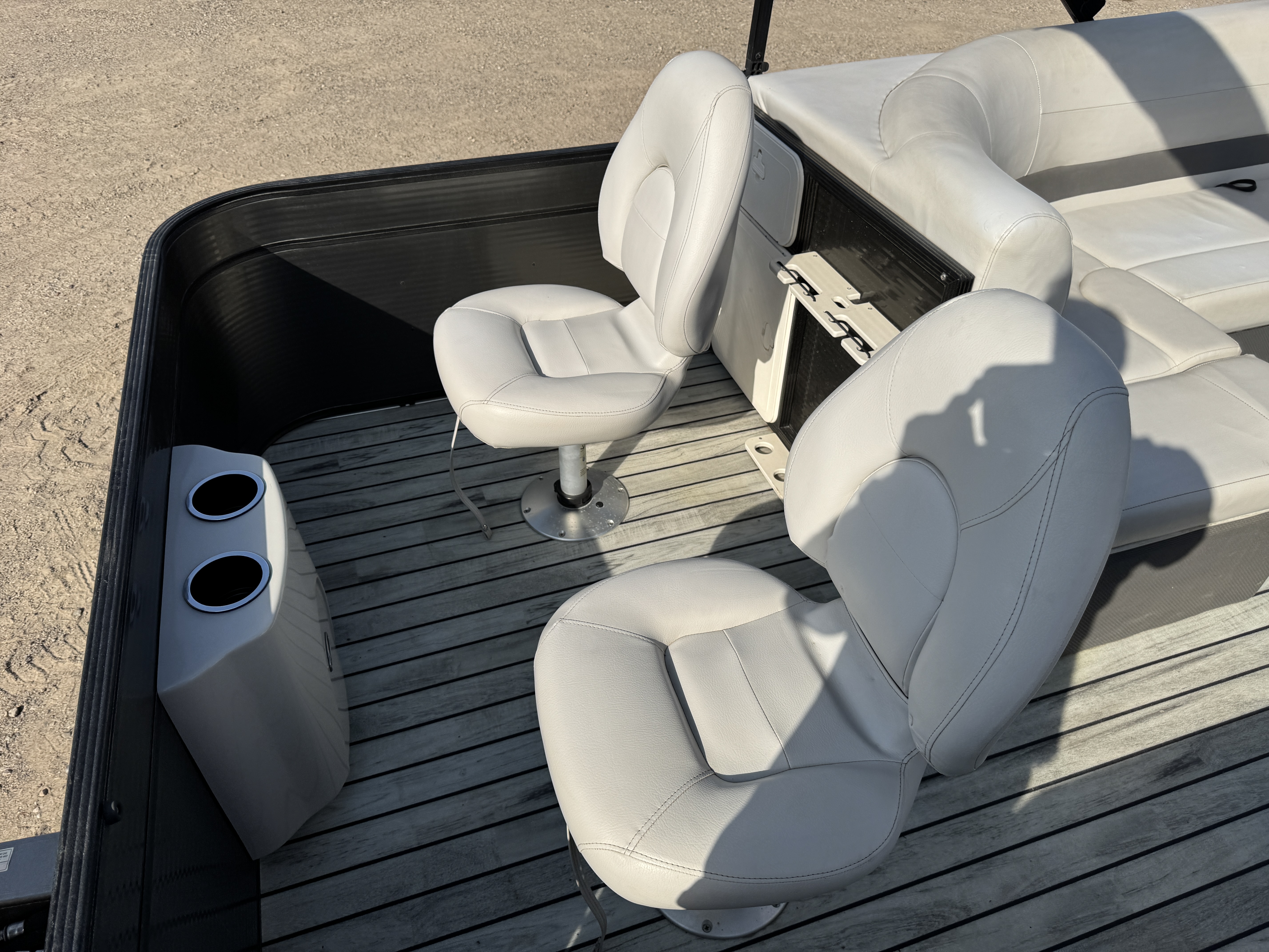 corner fish layout pontoon features 4 fold down fishing seats; 1 in each corner.
