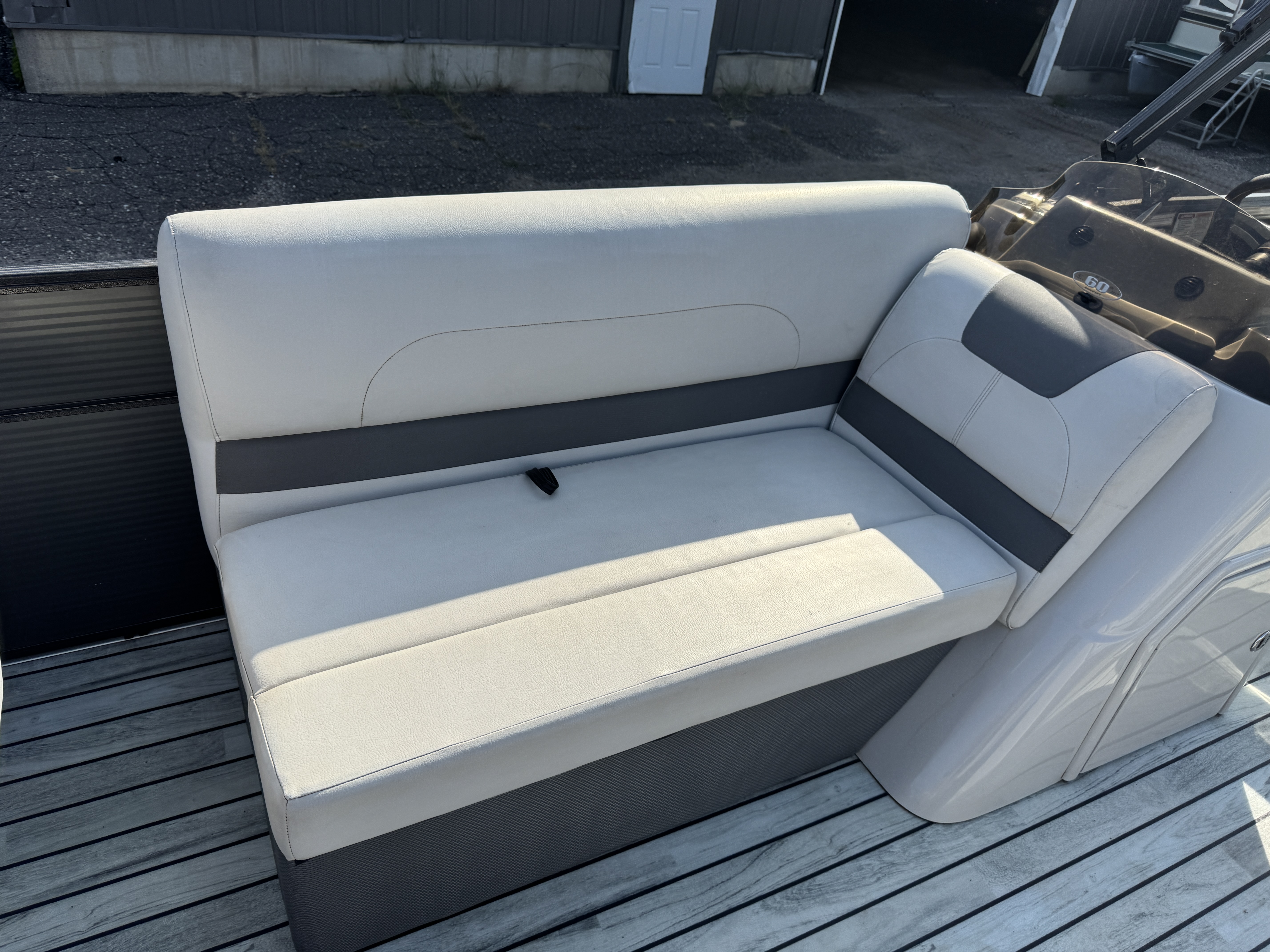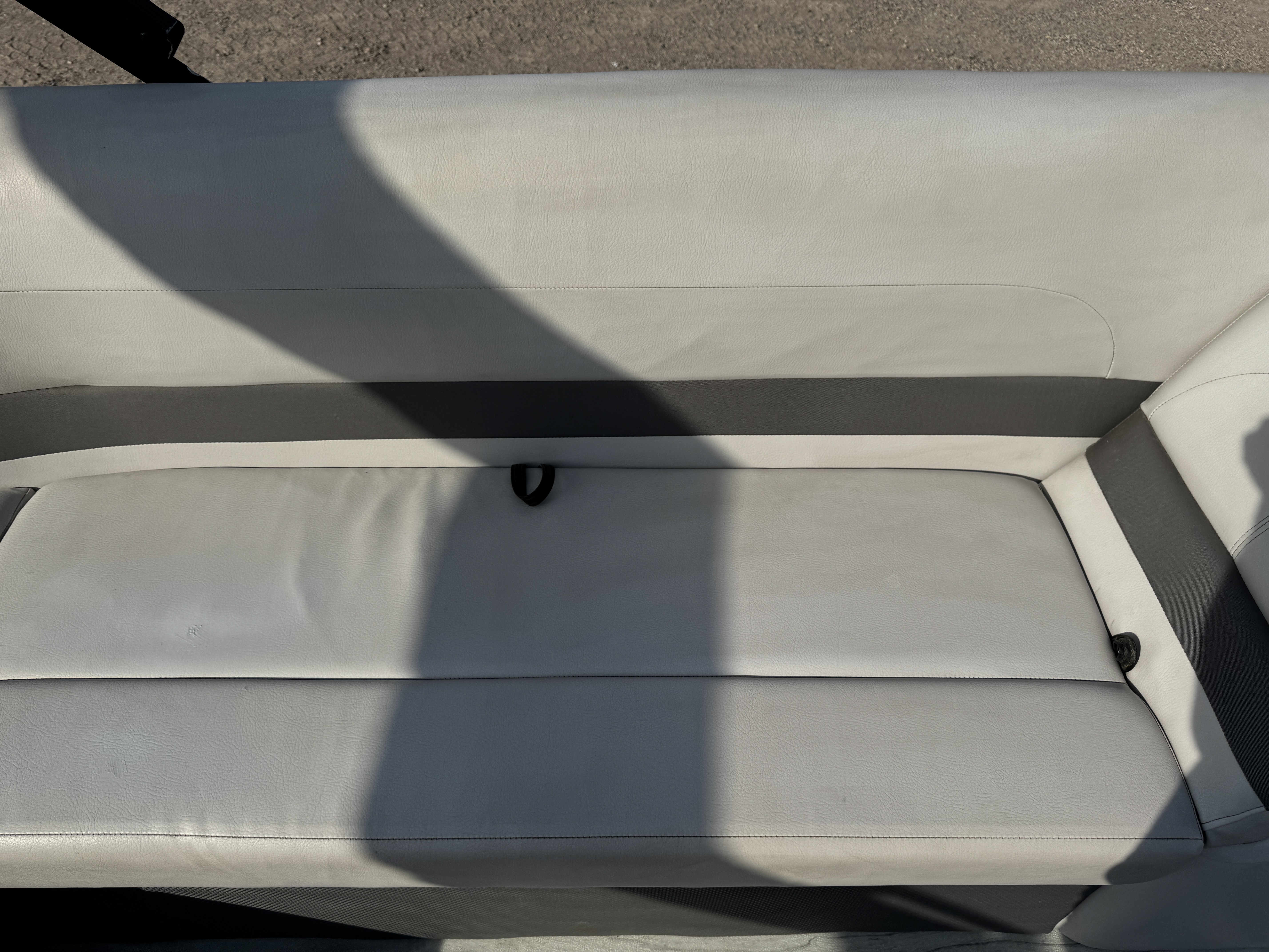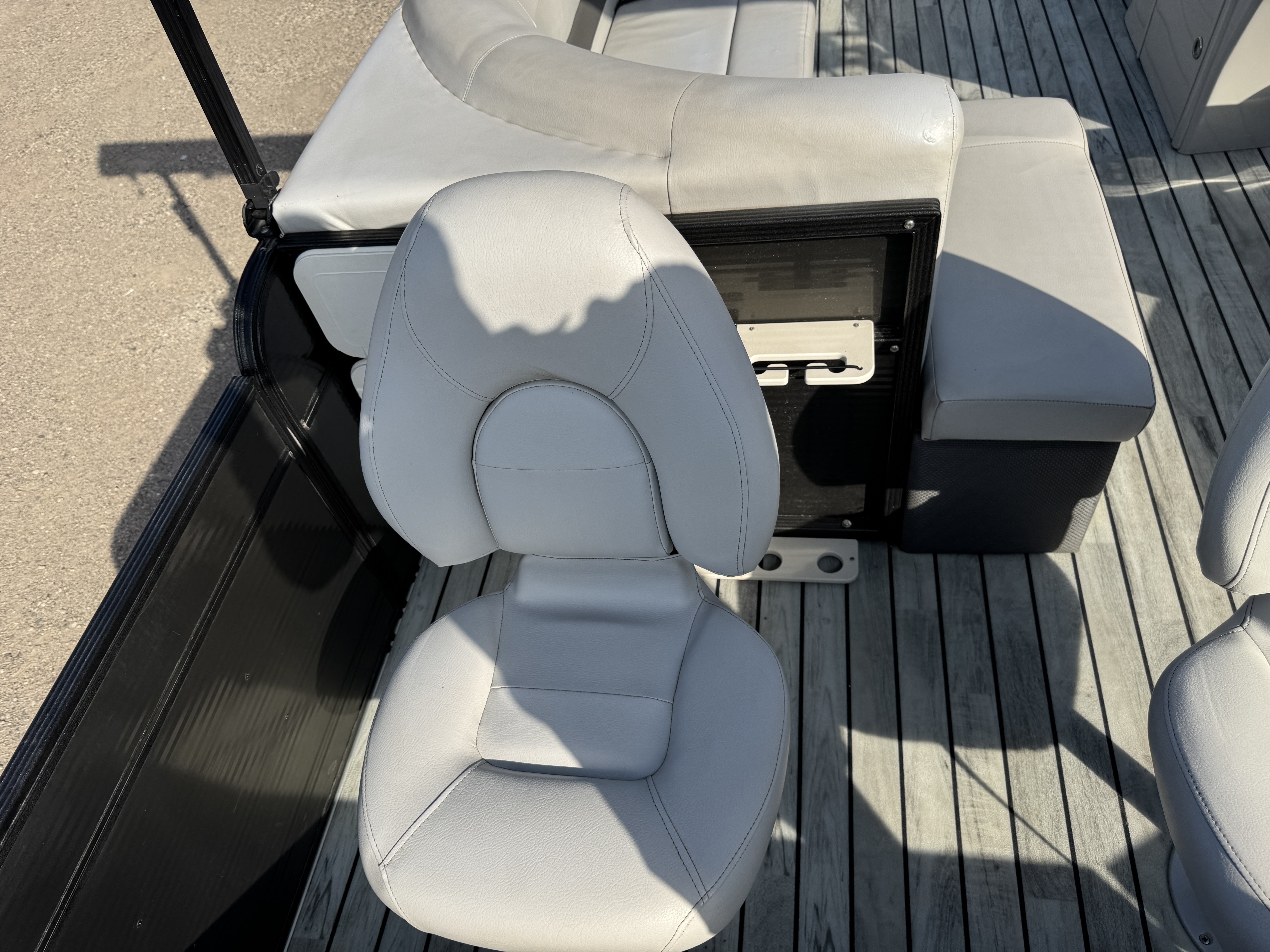corner fish layout pontoon features 4 fold down fishing seats; 1 in each corner.