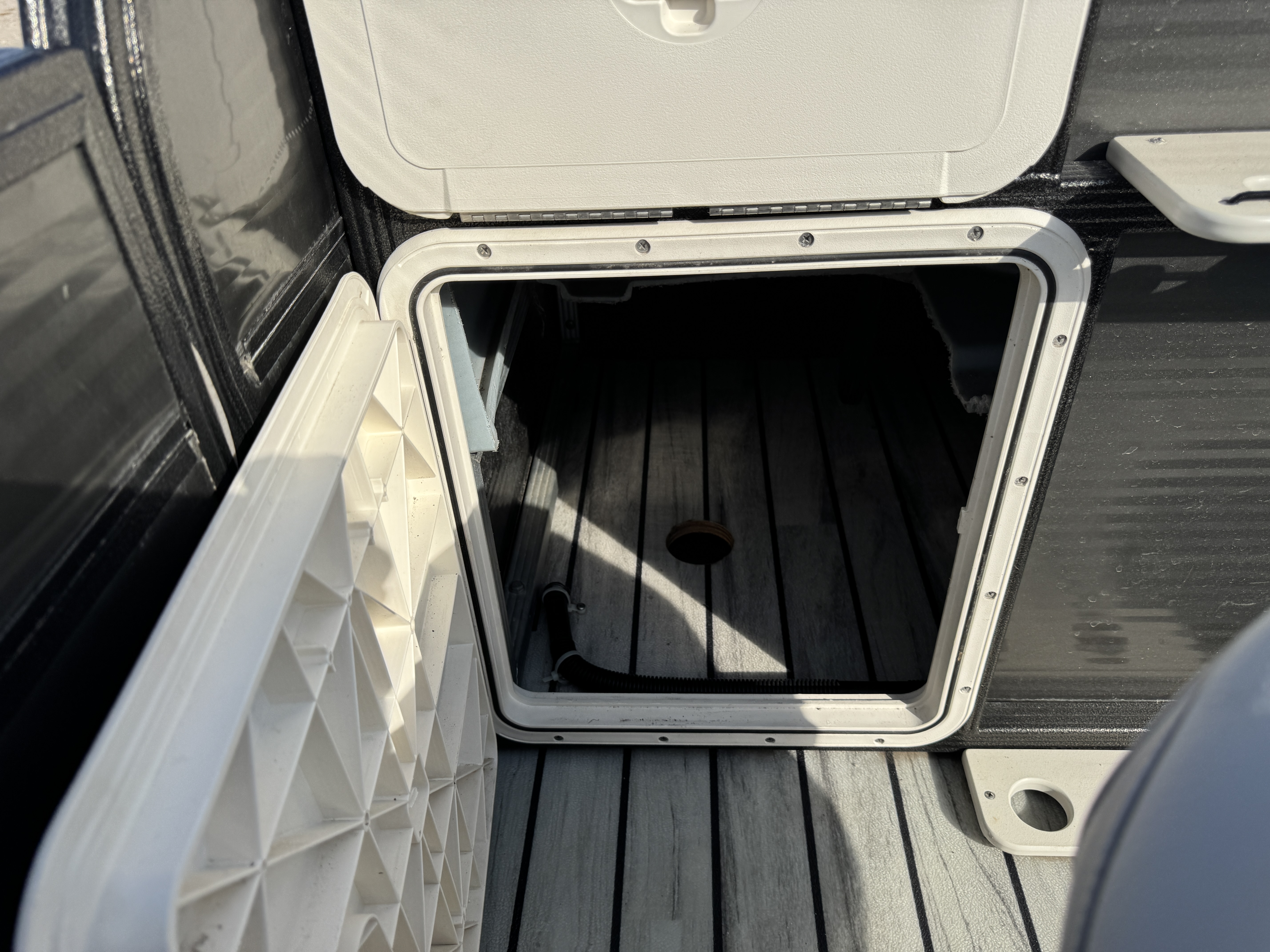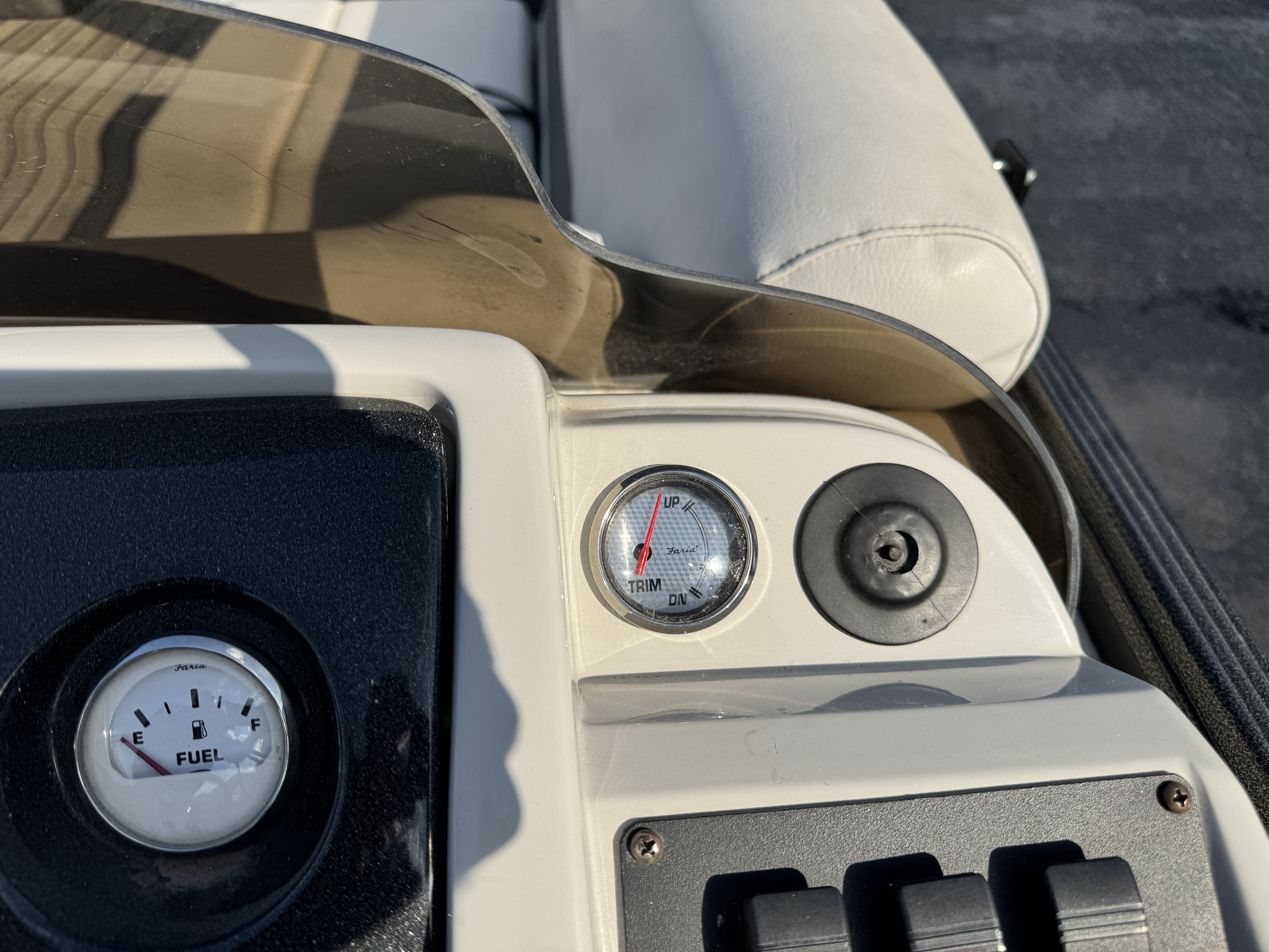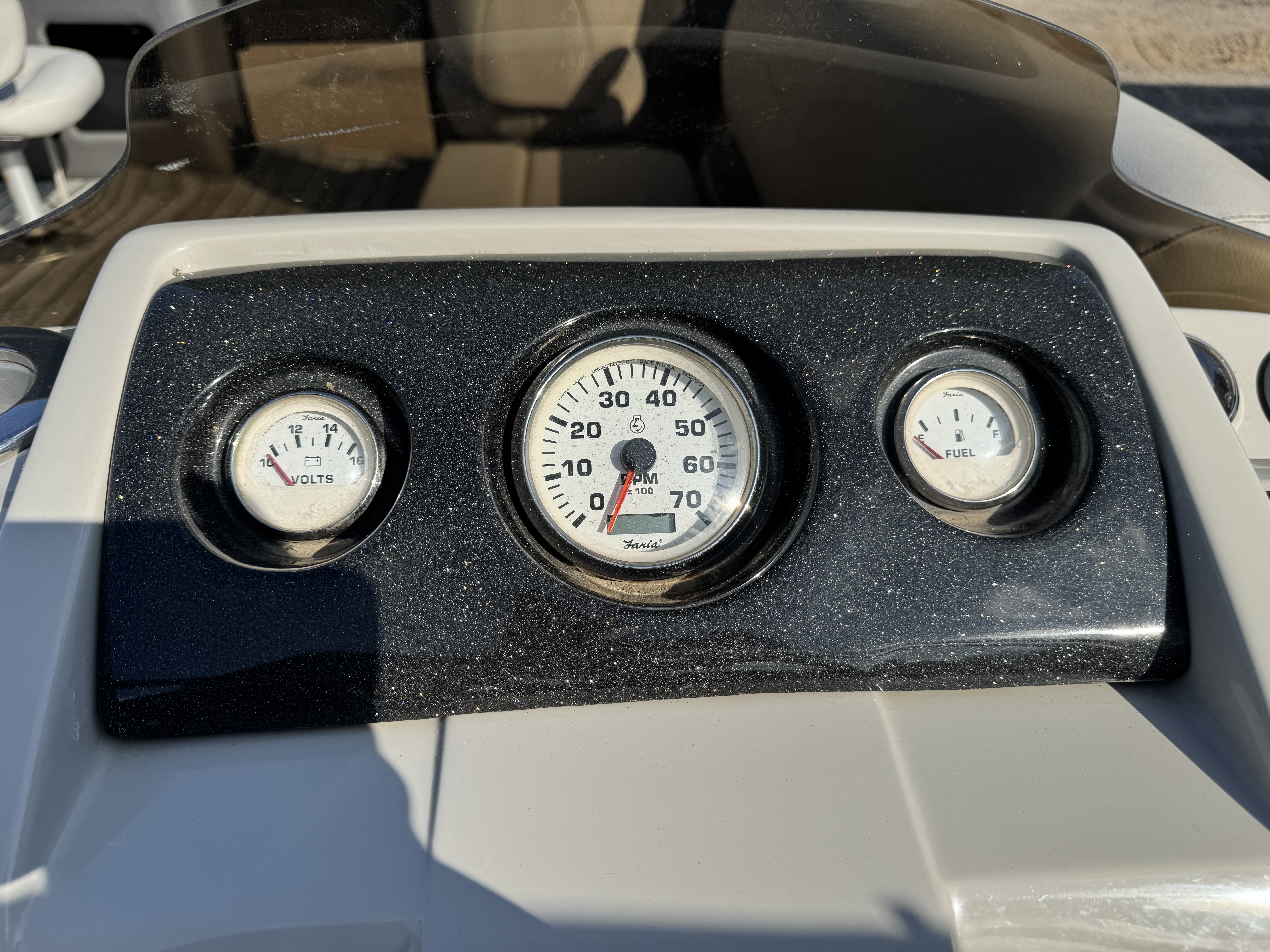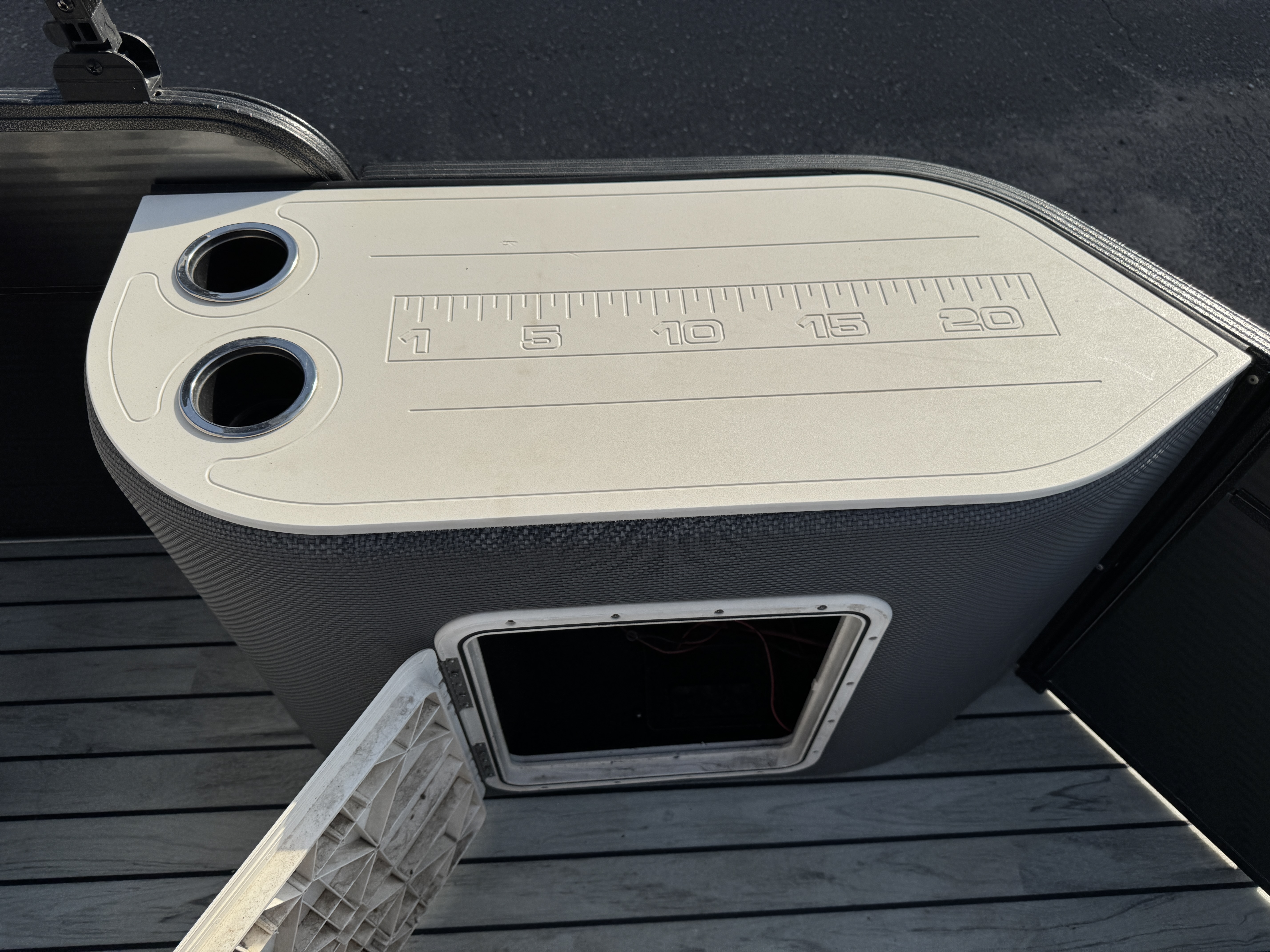 open lid for a livewell. The helm features a Tachometer, Fuel, Volt and Trim