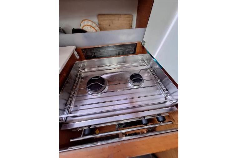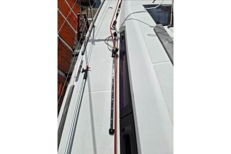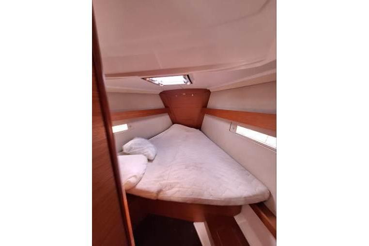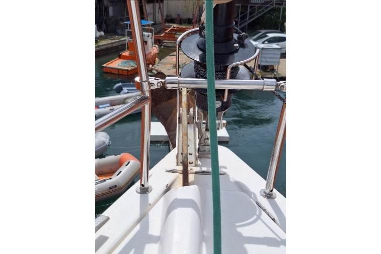 CE Category A (Ocean) · Umberto Felci design · Displacement ~8.94 t (light) · Twin wheels with emergency tiller · Lofrans 1000 W windlass · Delta 20 kg anchor + 50 m of 8 mm chain (secondary anchor aboard) · Facnor furling · Winches: (2) Lewmar 45 primaries & (2) Lewmar 40 coachroof · 3-cabin / 2-head layout (forward cabin with private head; twin aft cabins share head) · Saloon with U-settee & table · Long galley to starboard (ENO 2-burner stove, fridge, twin sinks with fresh & seawater taps) · Electric toilets with holding tanks · Bimini & dodger · Cockpit table/benches · Non-skid deck · Stanchions/pulpits/lifelines & chainplates in good visual condition · Mast step on stainless post