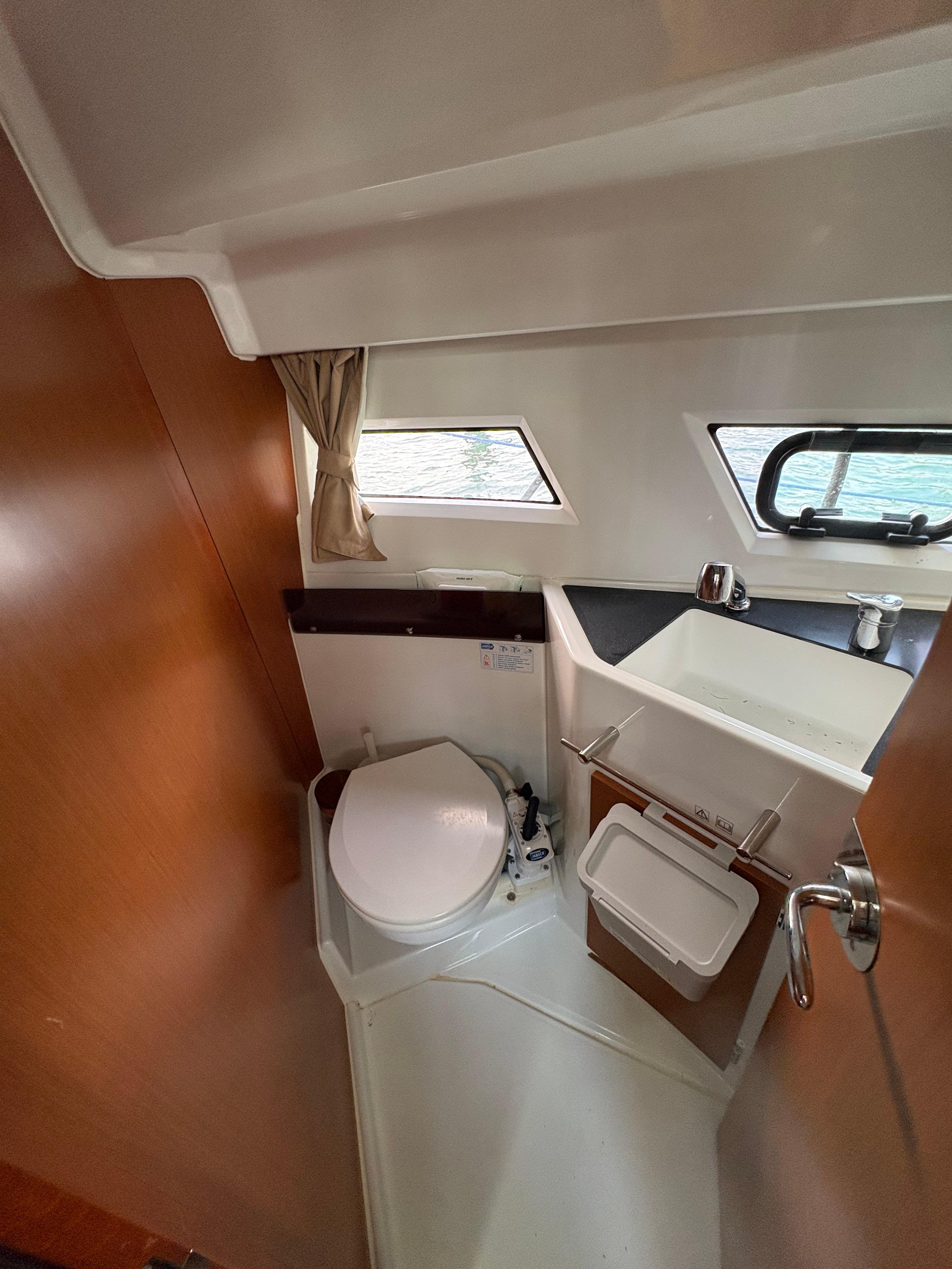 • Head: Includes a marine toilet, sink, and shower with hot water.