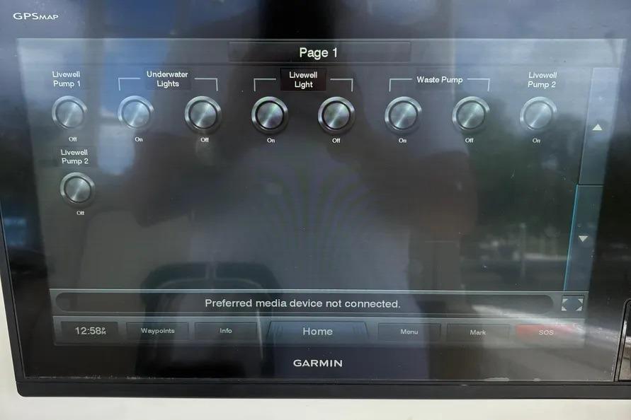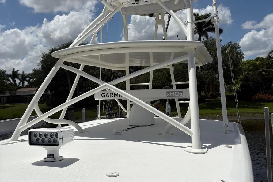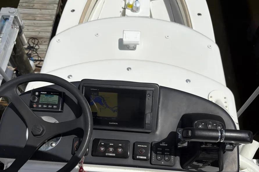 Garmin 16″ MFD at main helm · 7″ display at tower · Garmin autopilot (auto-helm feature) · night-vision · Fusion stereo (2,000 W) with 10 JL speakers