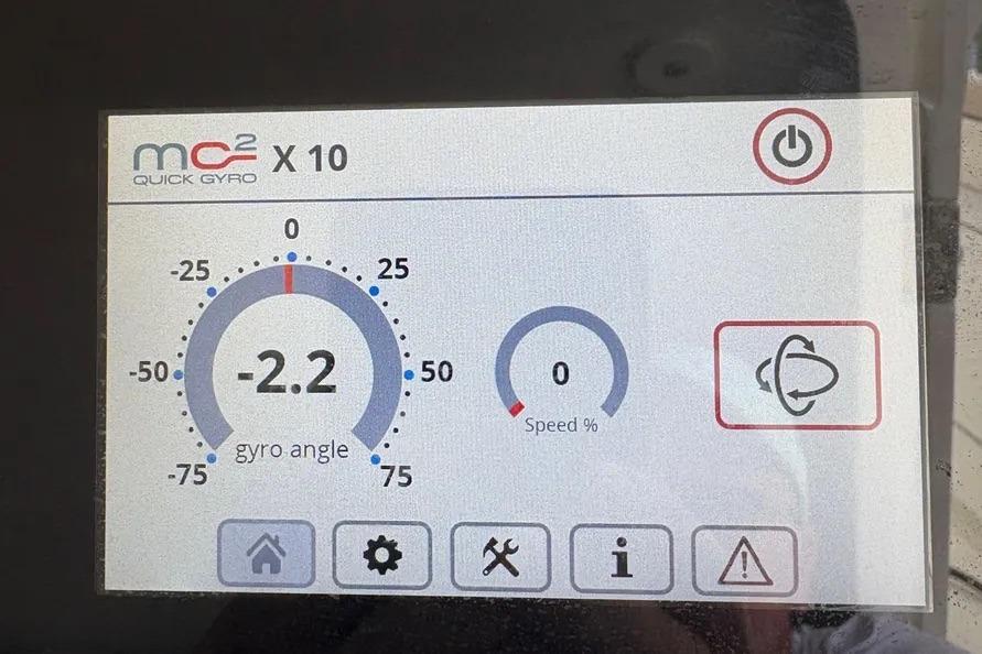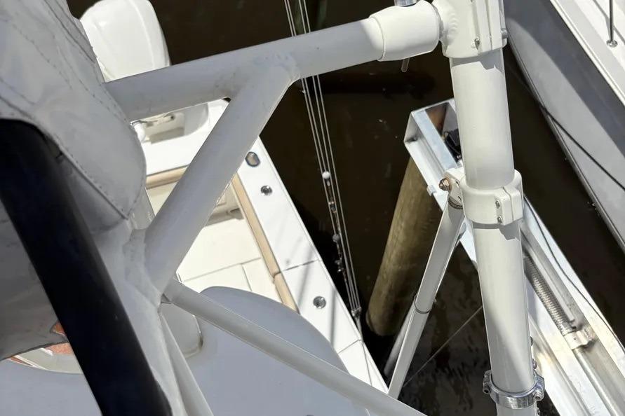 LOA 38.17 ft · Beam 10.58 ft · Max bridge clearance ~31 ft · Fuel 485 gal · Fresh water 50 gal · Cruise ~32 kn · Max ~45 kn · MC² Quick Gyro (12V, air-cooled; new 2023, ~100 hrs) · New bow thruster (2023) · Full gap tower with second station (white powder coat) · Rupp rigger holders with 25′ carbon outriggers + center rigger · Electric anchor windlass · Searchlight · Recent full wax/detail